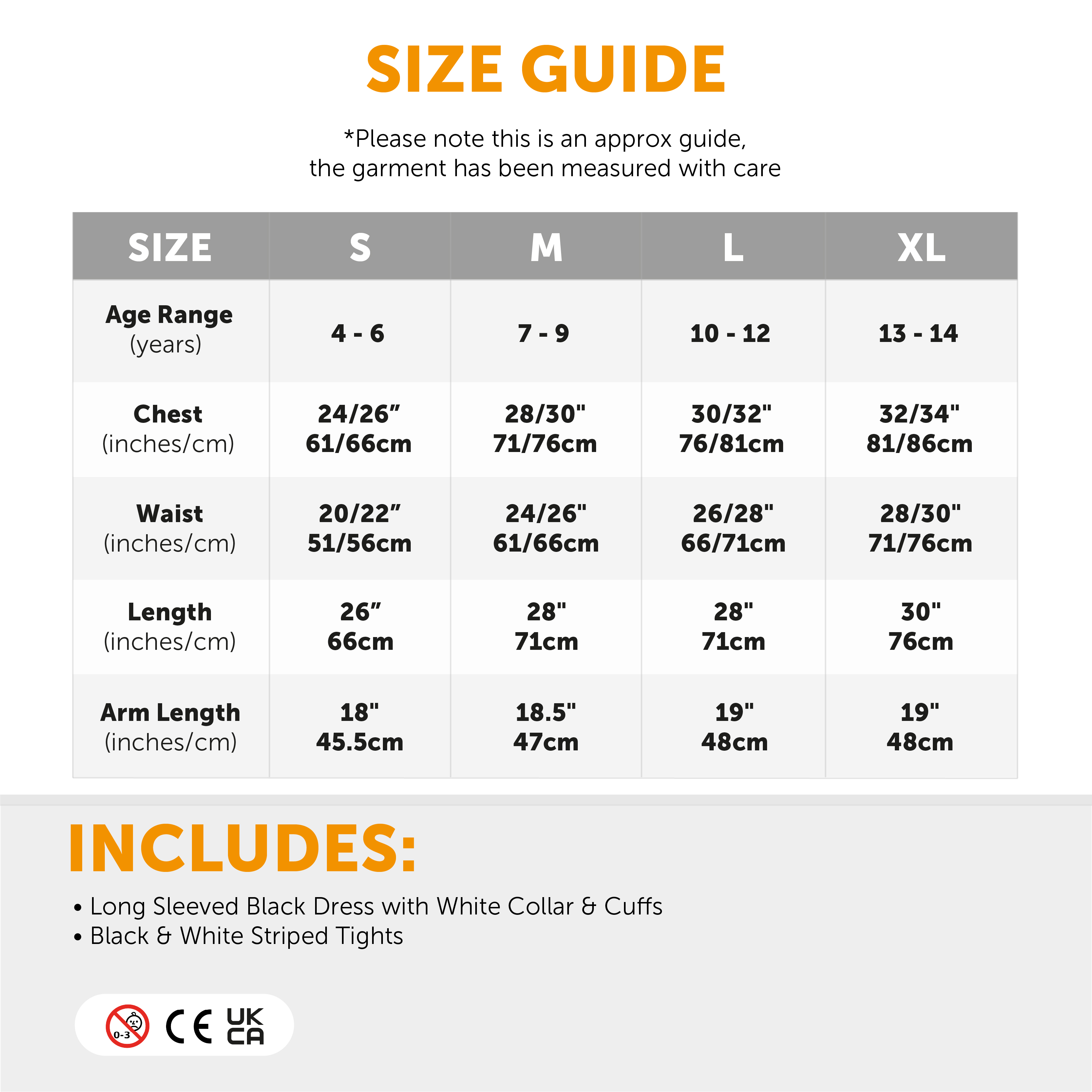 AVAILABLE IN MULTIPLE SIZES: Your Child's Gothic Horror Girl Dress is available in multiple sizes from Small to X-Large: Small - 4 - 6 Years - Chest 24/26" (61/66cm), Waist 20/22" (51/56cm), Length 26" (66cm), Arm Length 18" (45.5cm) | Medium - 7 - 9 Years - Chest 28/30" (71/76cm), Waist 24/26" (61/66cm), Length 28" (71cm), Arm Length 18.5" (47cm) | Large - 10 - 12 Years - Chest 30/32" (76/81cm), Waist 26/28" (66/71cm), Length 28" (71cm), Arm Length 19" (48cm) | X-Large - 13 - 14 Years - Chest 32/34" (81/86cm), Waist 28/30" (71/76cm), Length 30" (76cm), Arm Length 19" (48cm)