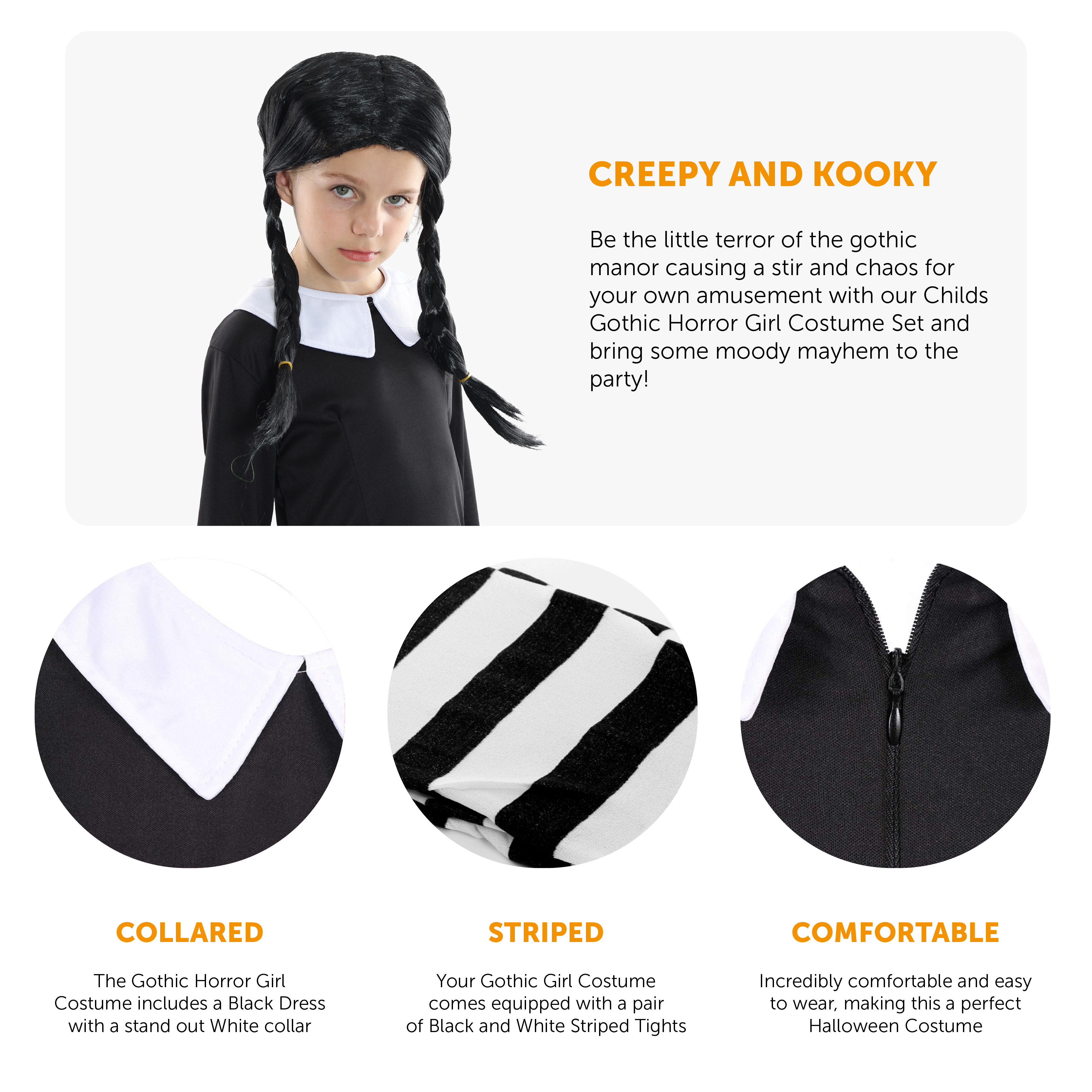 COSTUME DETAILS: Your Child's Gothic Horror Girl Costume includes a Long Sleeve Black Dress with a White Collar and a zip up back, and a pair of Black and White Striped Tights, a great look for you this Halloween!