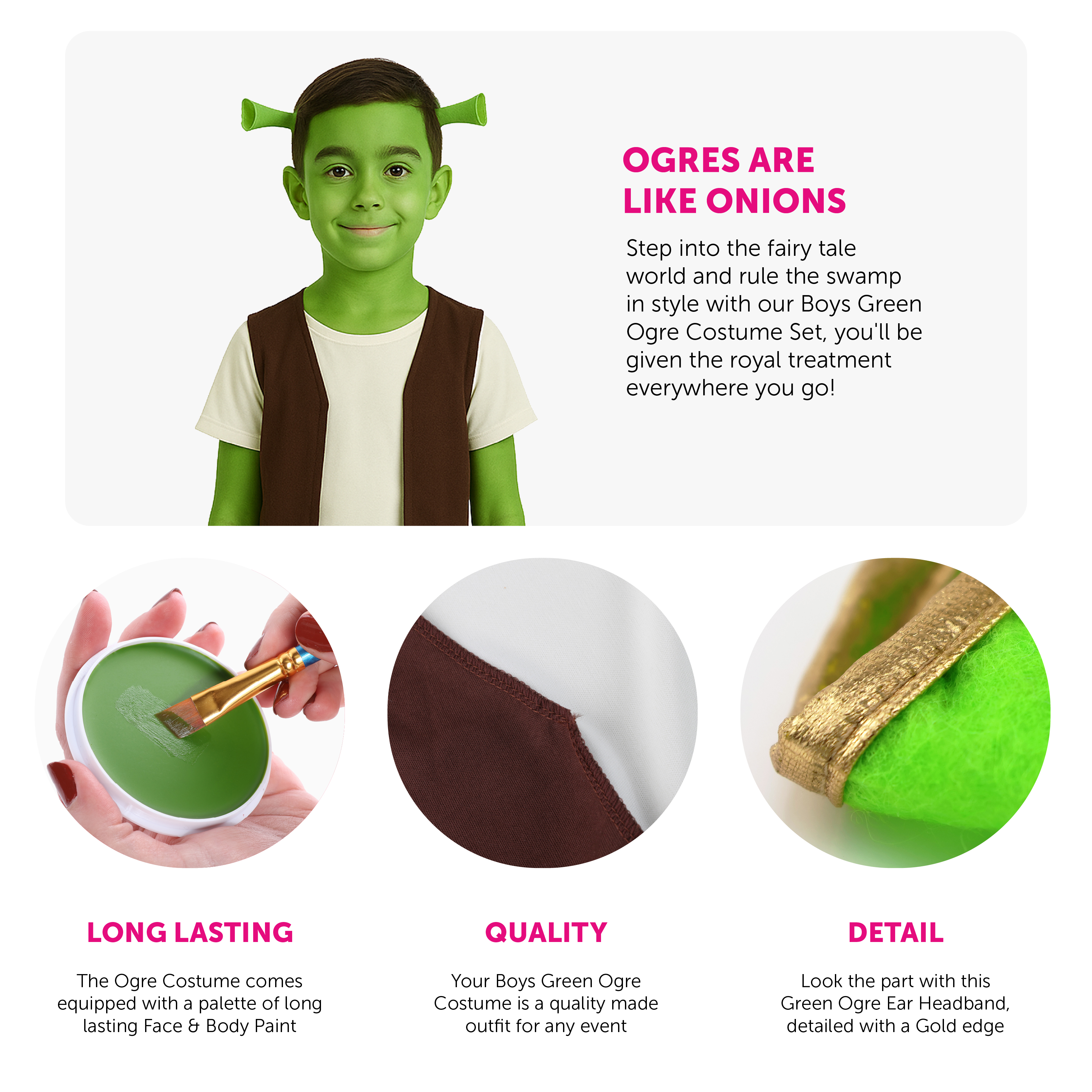 SET INCLUDES: This Boys Green Ogre Costume Set includes a Green Ogre Ear Headband, a Brown Waistcoat with a Cream Top & matching Brown Trousers, and a palette of Green Face & Body Paint, to help you finish off your desired look!