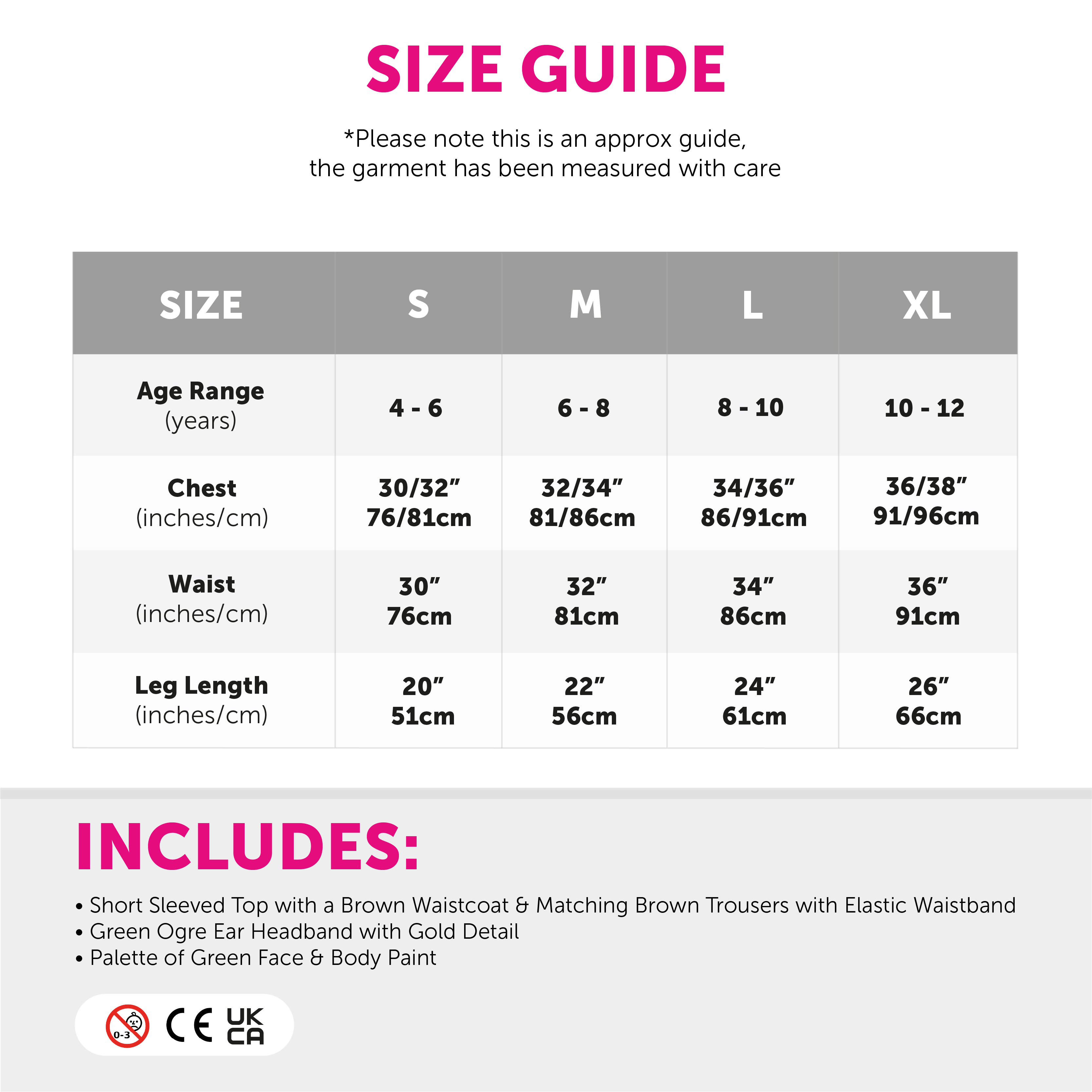 AVAILABLE IN MULTIPLE SIZES: The Boys Green Ogre Costume Set is available in multiple sizes, Small to X-Large: Small (4 - 6 years), Chest 30/32" (76/81cm), Waist 30" (76cm), Leg Length 20" (51cm) | Medium (6 - 8 years), Chest 32/34" (81/86cm), Waist 32" (81cm), Leg Length 22" (56cm) | Large (8 - 10 years), Chest 34/36" (86/91cm), Waist 34" (86cm), Leg Length 24" (61cm) | X-Large (10 - 12 years), Chest 36/38" (91/96cm), Waist 36" (91cm), Leg Length 26" (66cm)