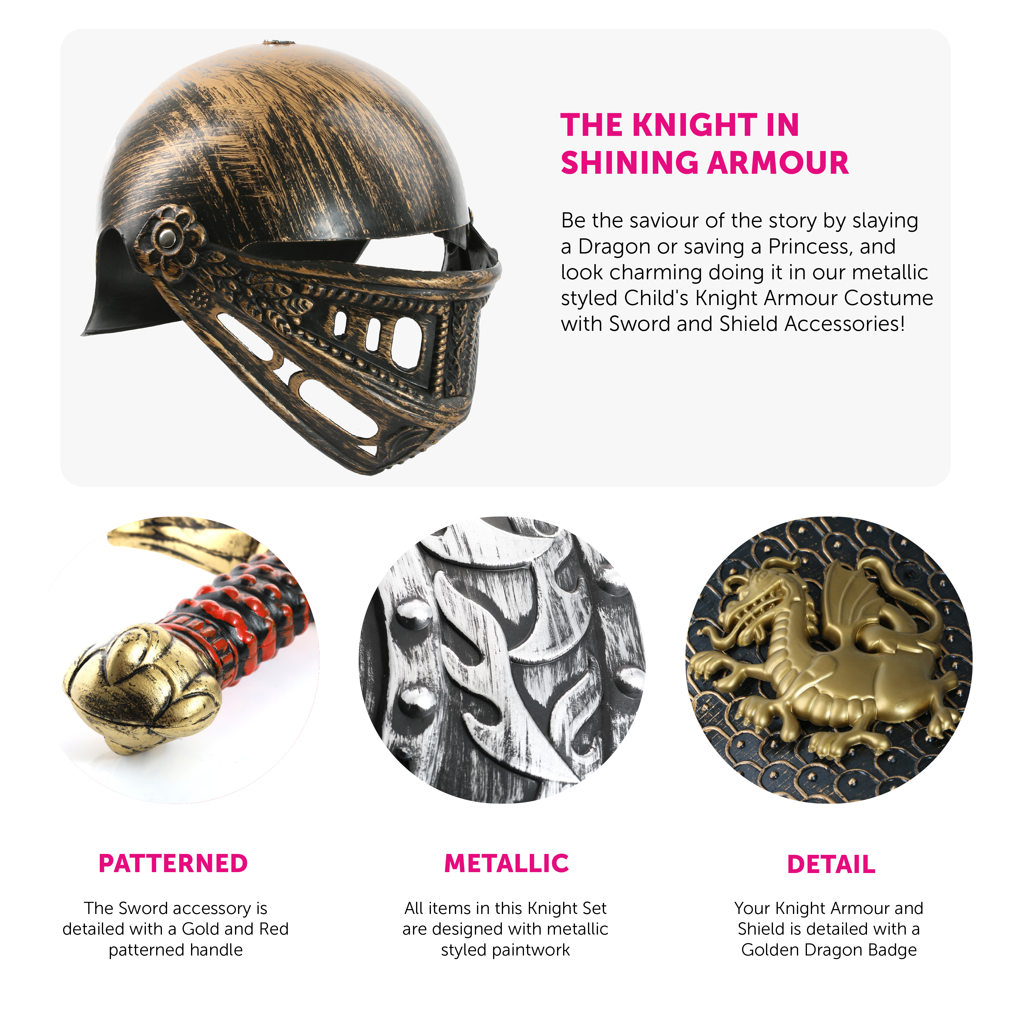 CHILDS KNIGHT ARMOUR COSTUME: Be the saviour of the story by slaying a Dragon or saving a Princess, and look charming doing it in our metallic styled Child's Knight Armour Costume!