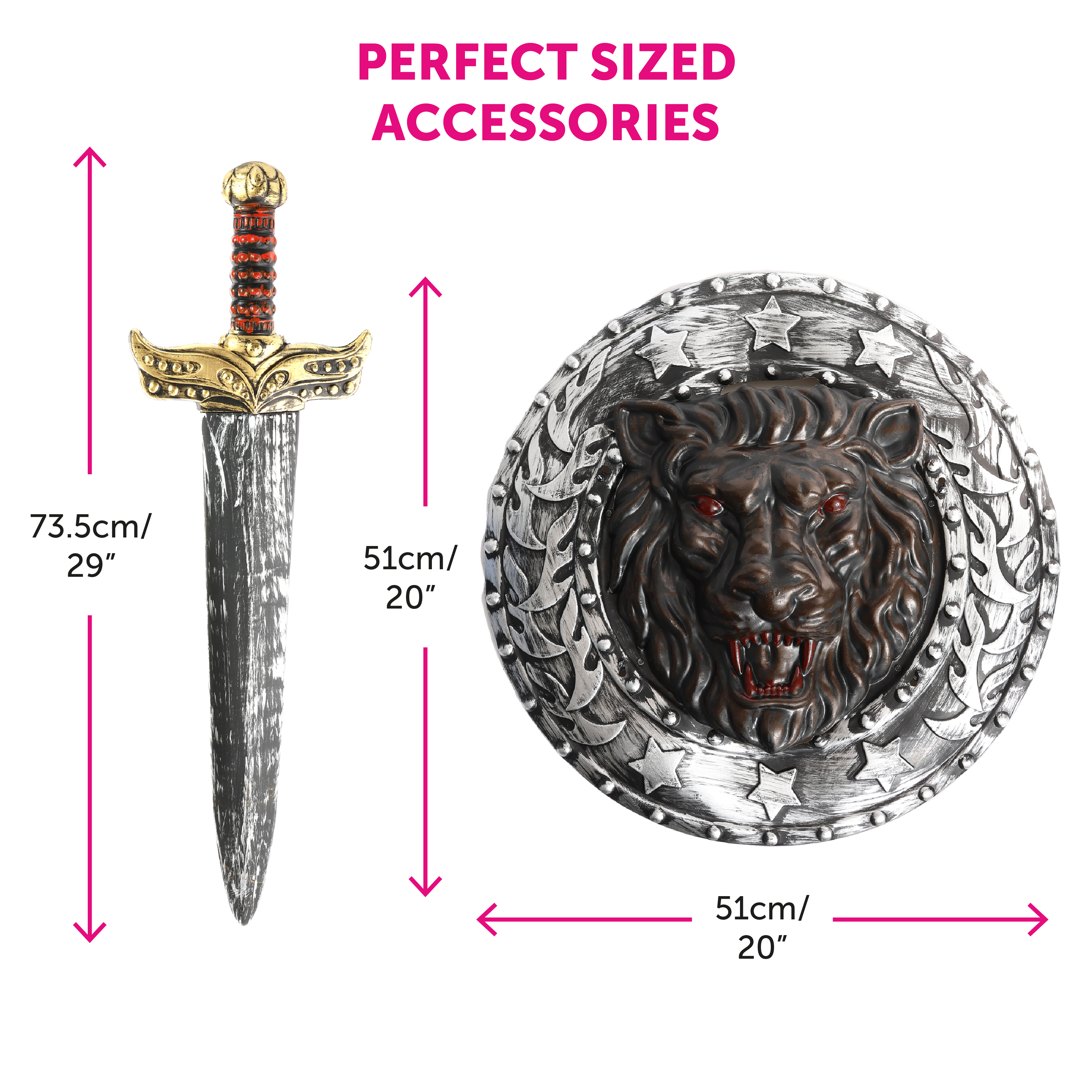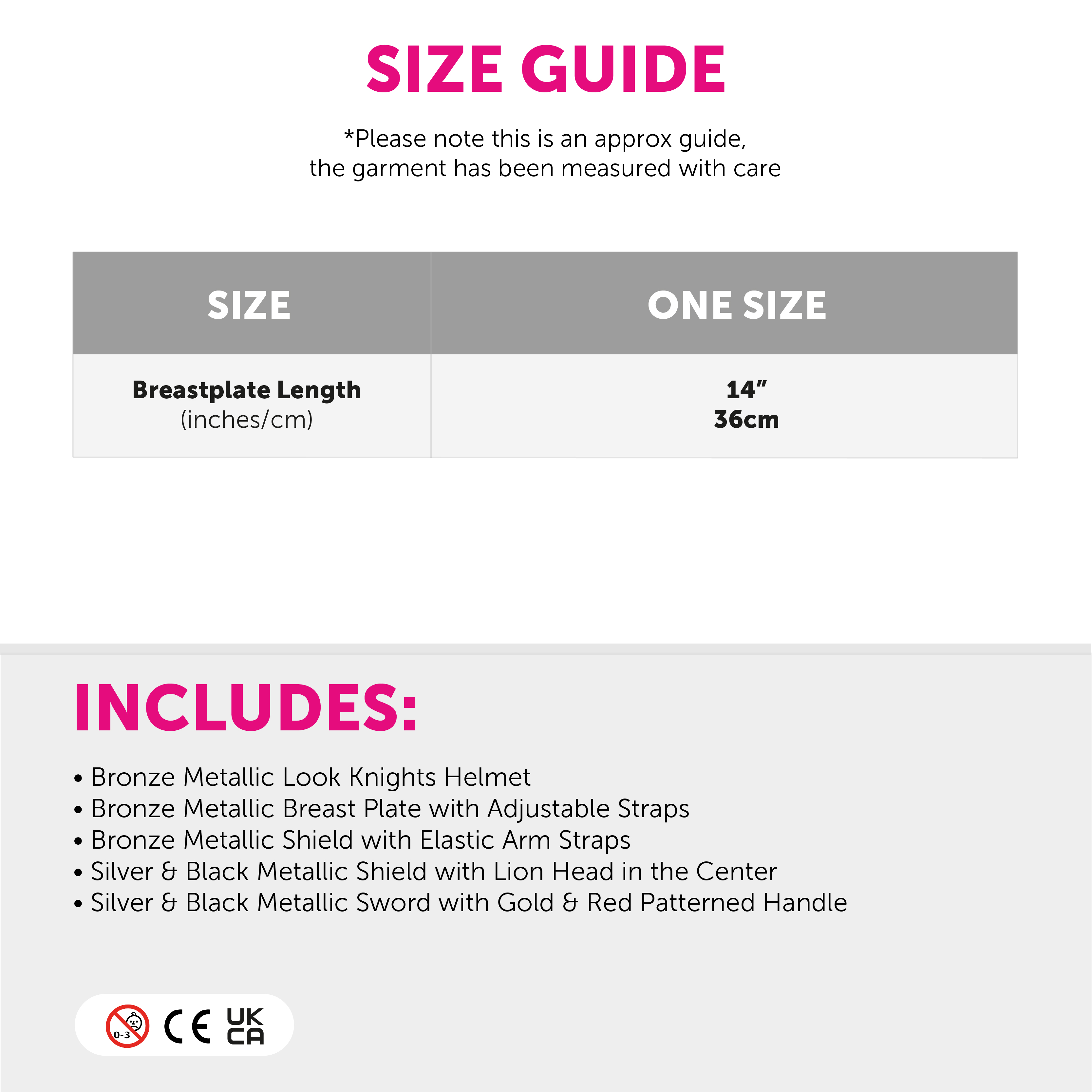 KNIGHT ARMOUR COSTUME INCLUDES: The Child's Knight Armour Costume includes a Bronze metallic styled Knights Helmet with a visor, a matching Bronze Breastplate with adjustable straps, a matching Bronze Shield with elastic arm straps, a Large Silver Shield with a Lion Motif and a Silver Sword to allow you to finish off your Costume!