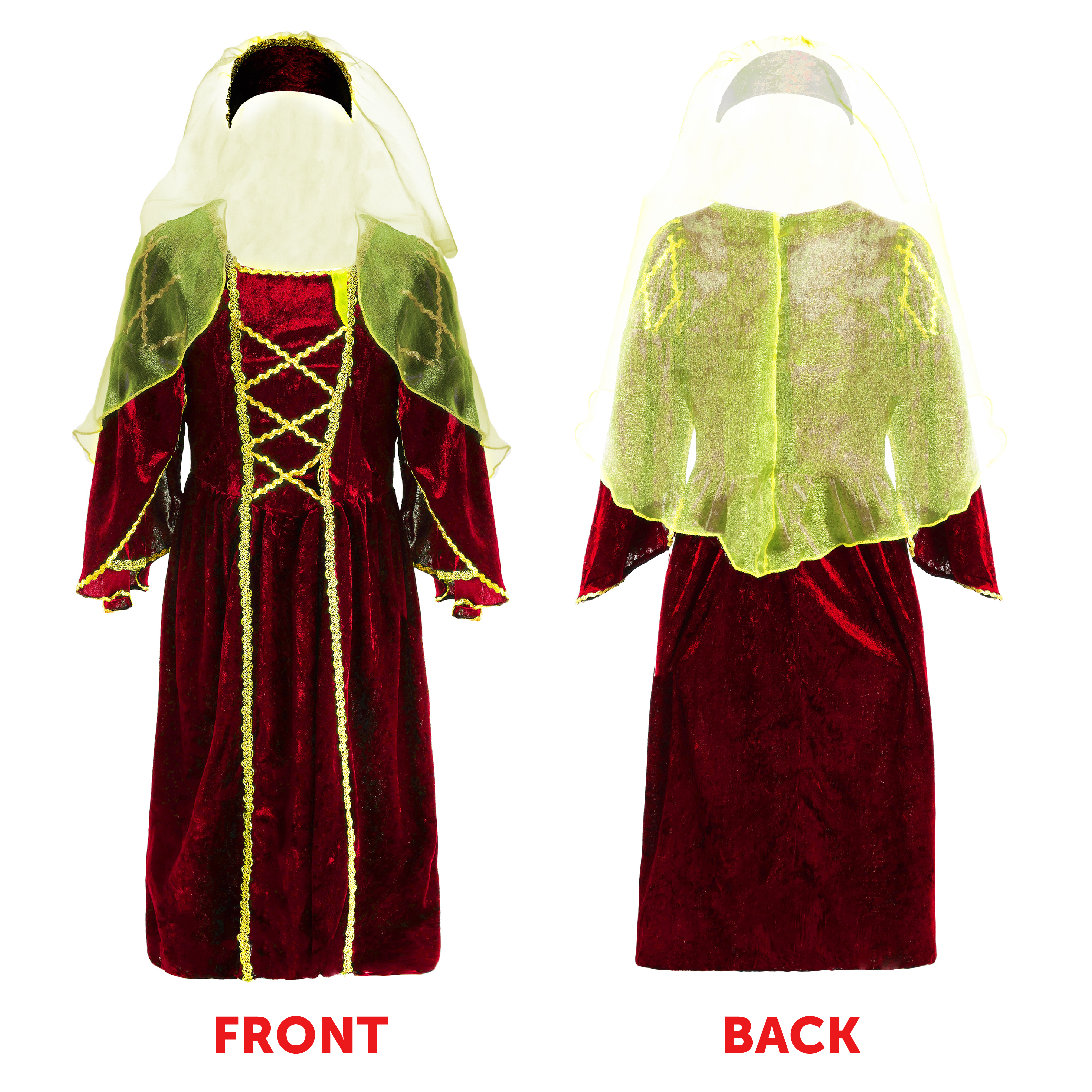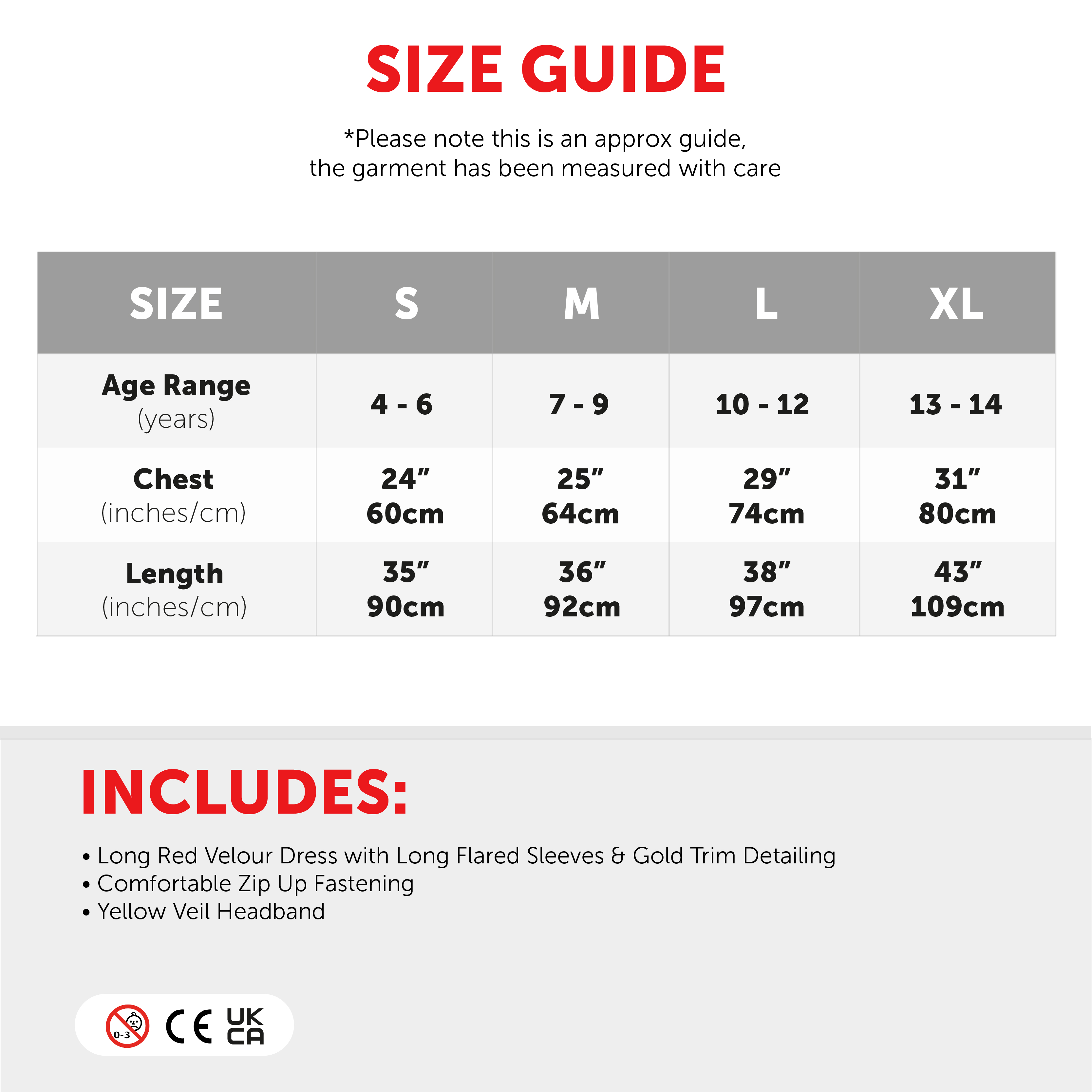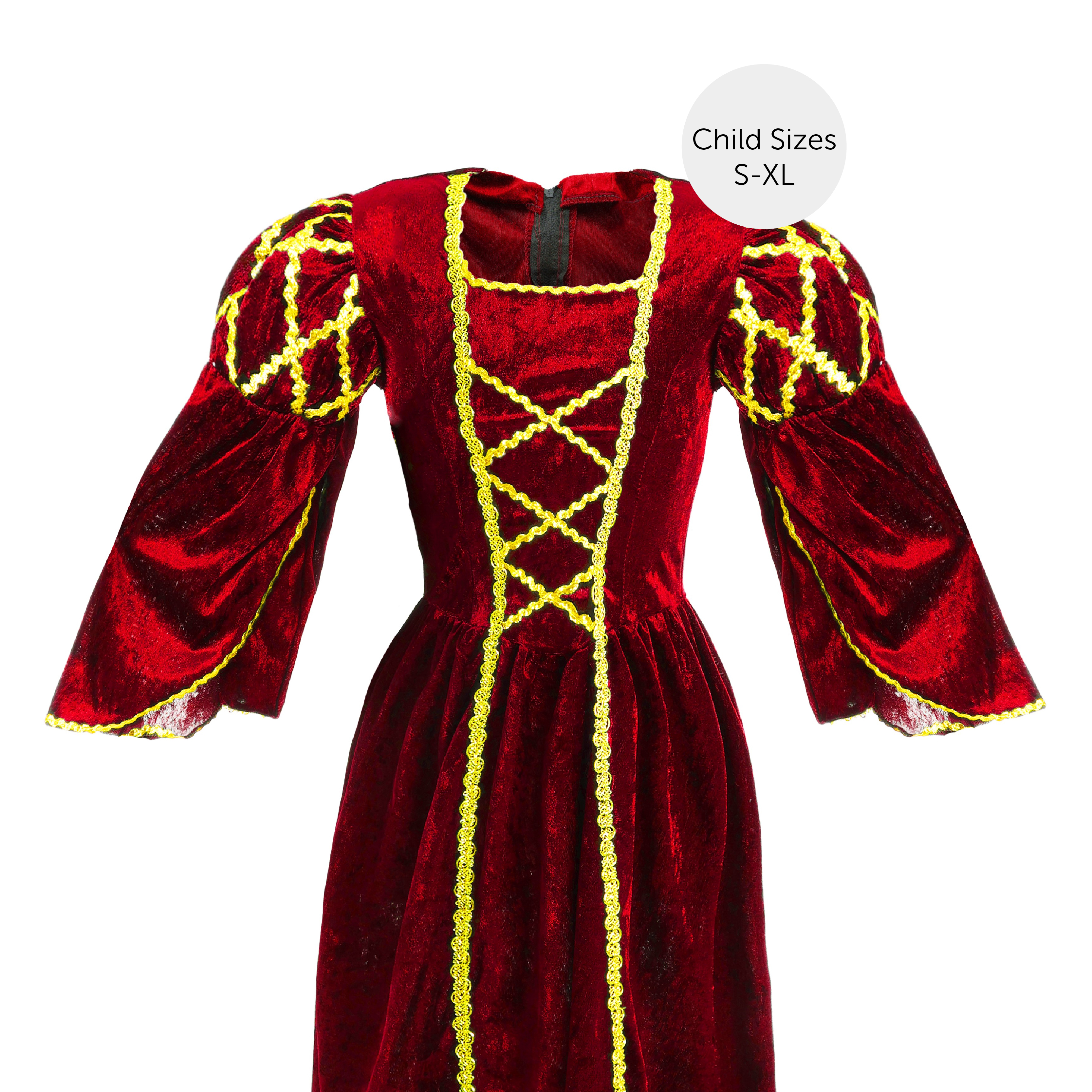 AVAILABLE IN MULTIPLE SIZES: The Girls Red Tudor Princess Dress is available in sizes Small to X-Large: Small - (4 - 6 years) Chest: 24" (60cm), Dress Length: 35" (90cm) | Medium - (7 - 9 years) Chest: 25" (64cm), Dress Length: 36" (92cm) | Large - (10 - 12 years) Chest: 29" (74cm), Dress Length: 38" (97cm) | X-Large - (13 - 14 years) Chest: 31" (80cm), Dress Length: 43" (109cm)