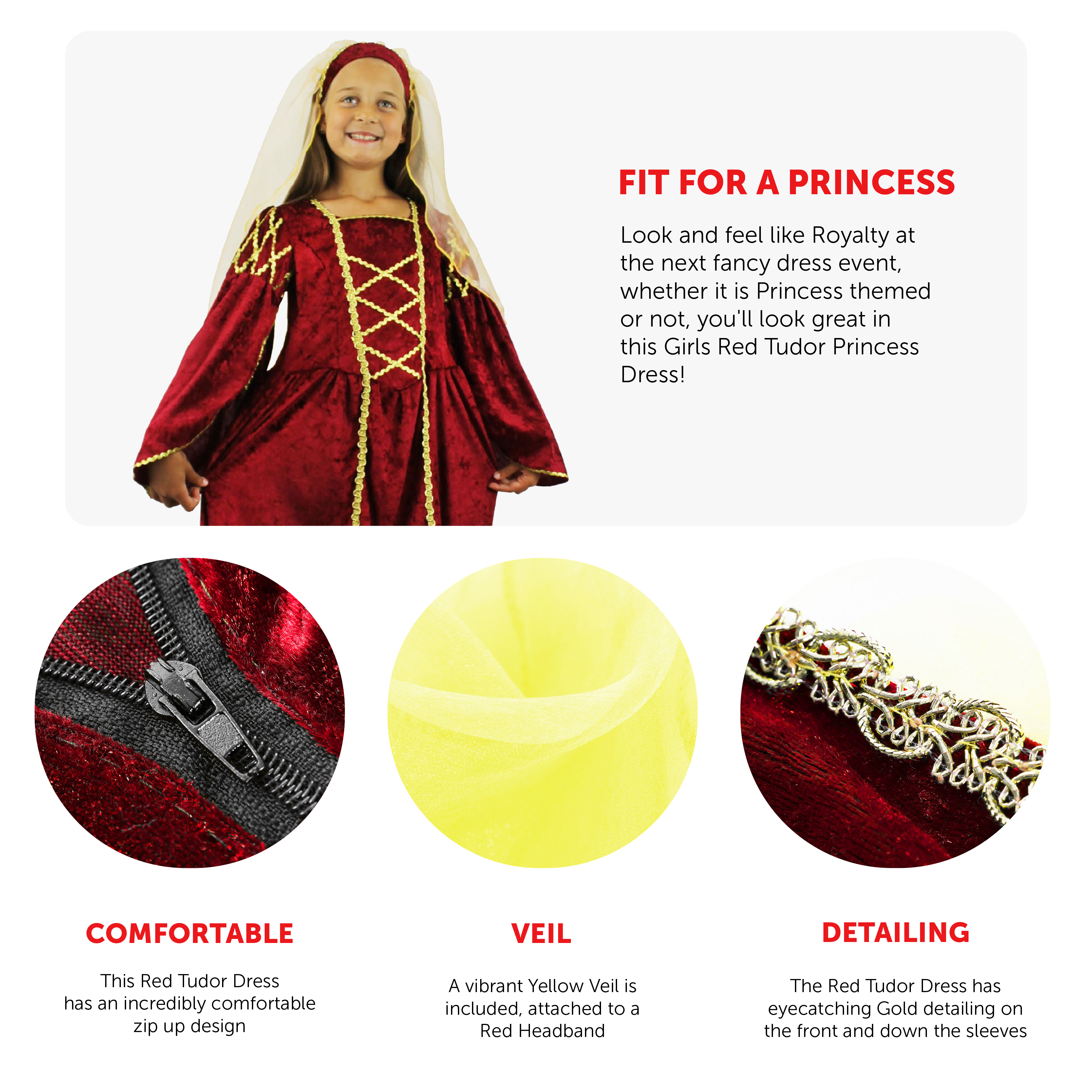 QUALITY DESIGN: This Tudor Princess Dress is a quality made costume piece, made with a Red Velour material, detailed with Gold Embroidery Trim and a matching Headband with a Yellow Veil!