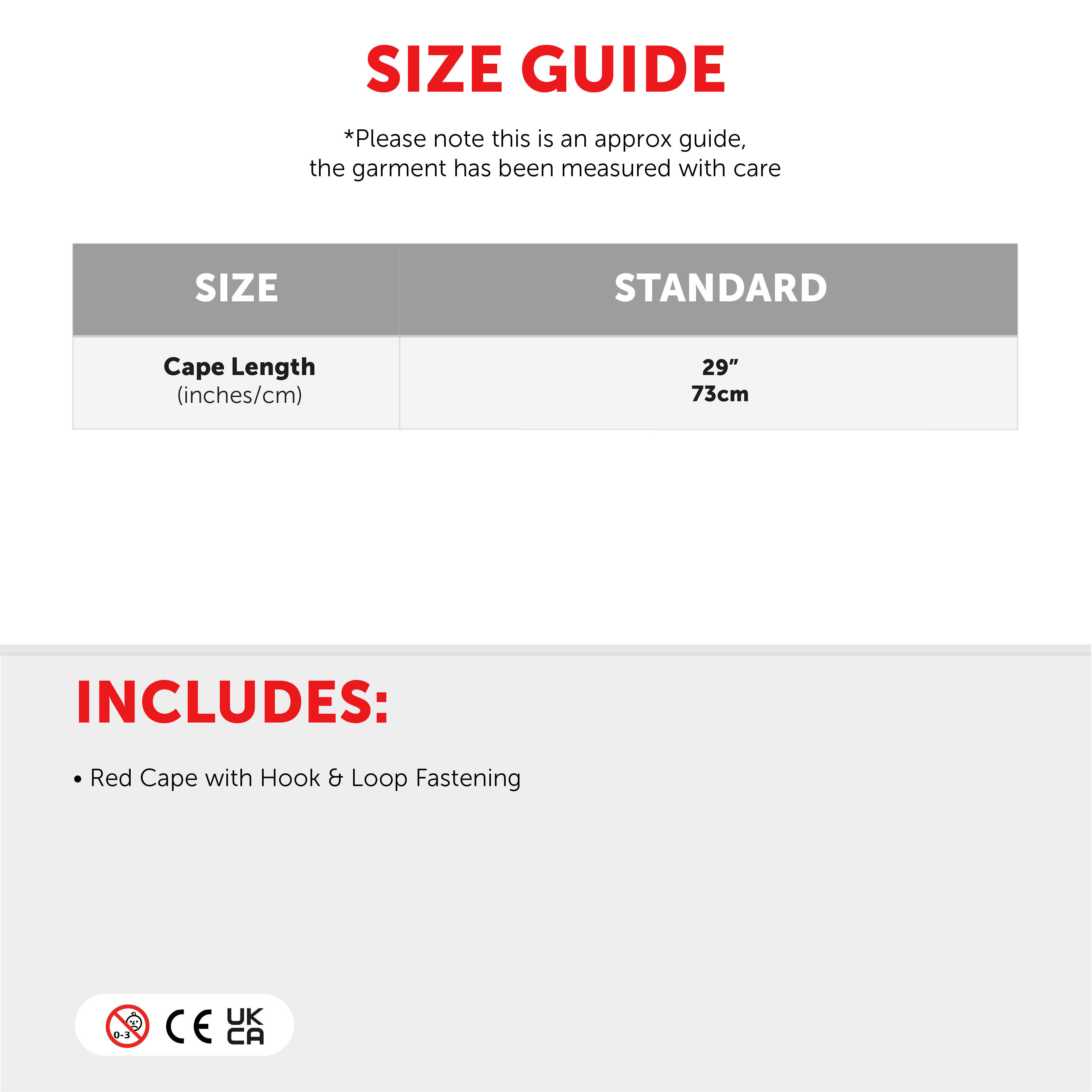 ONE SIZE FITS MOST: Your Child's Red Cape is only available in one size, measuring 29" (73cm) in length, you’ll feel comfortable and have no issue saving the day!