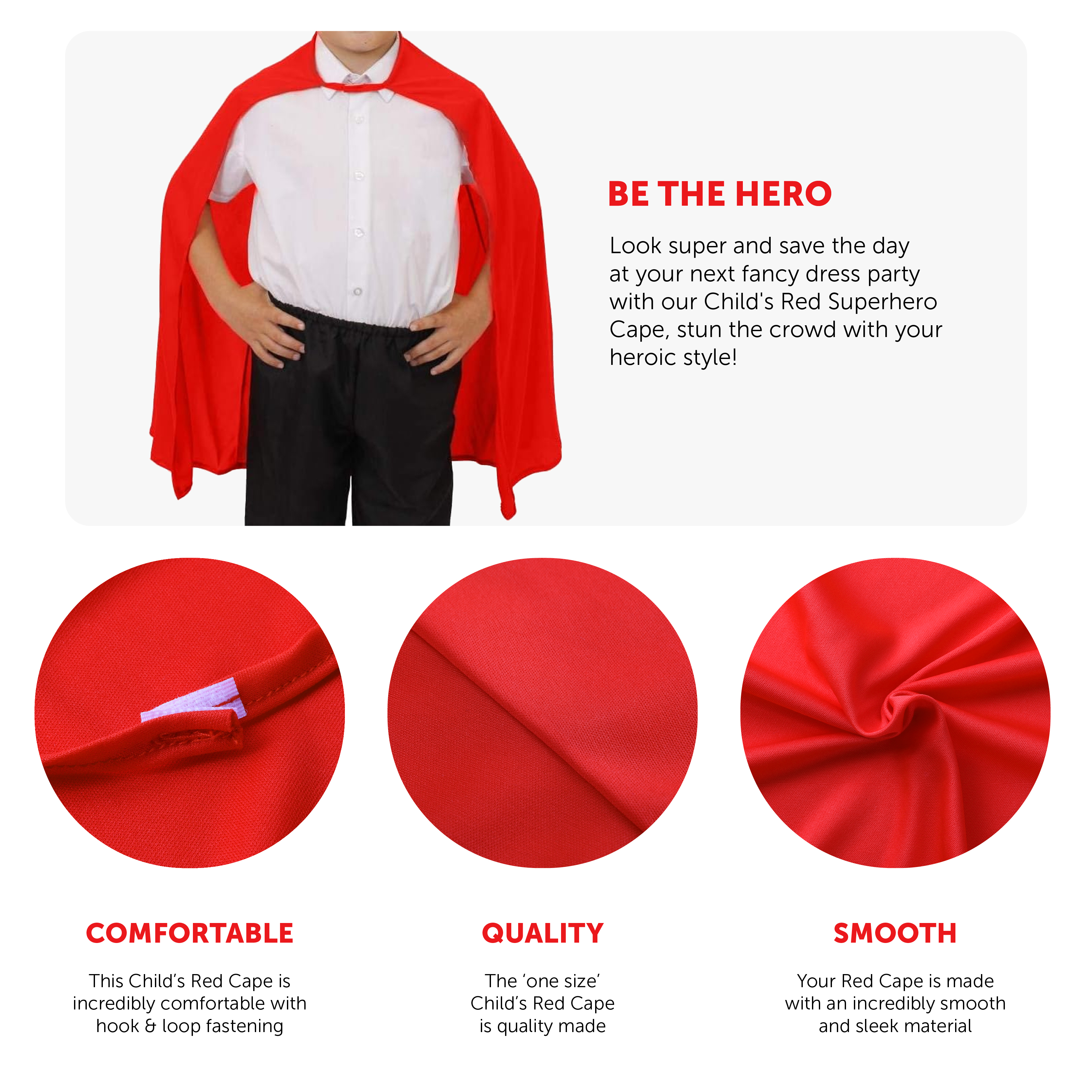 CAPE DETAILS: This Child's Superhero Cape is a long Red Cape with hook and loop fastening on the front for a comfortable fit, the perfect addition to any outfit!