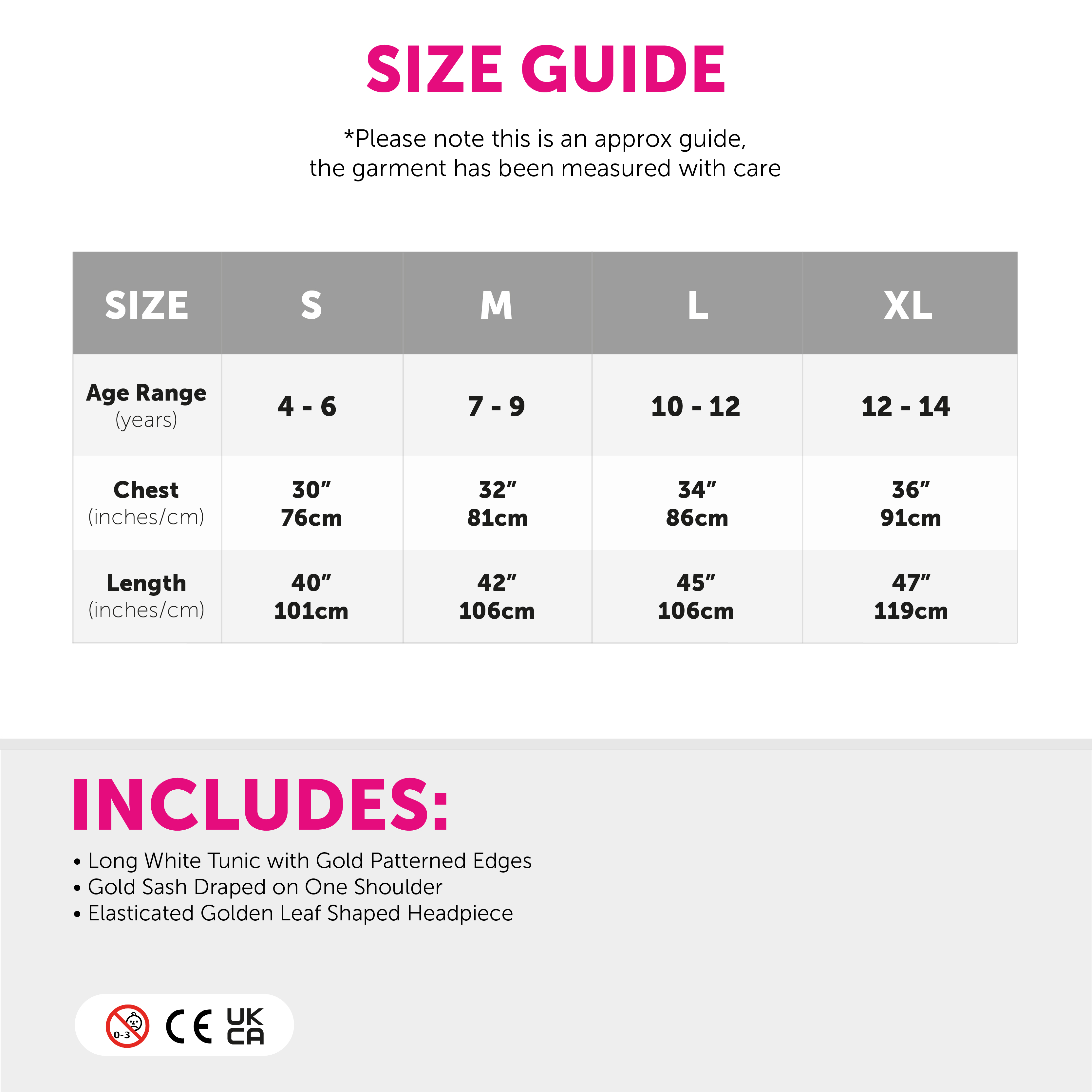 AVAILABLE IN MULTIPLE SIZES: The Girls Roman Costume is available in multiple sizes, ranging from Small to X-Large: Small - (4 - 6 years), Chest 30" (76cm), Length 40" (101cm) | Medium - (7 - 9 years), Chest 32" (81cm), Length 42" (106cm) | Large - (10 - 12 years), Chest 34" (86cm), Length 45" (106cm) | X-Large - (12 - 14 years), Chest 36" (91cm), Length 47" (119cm)