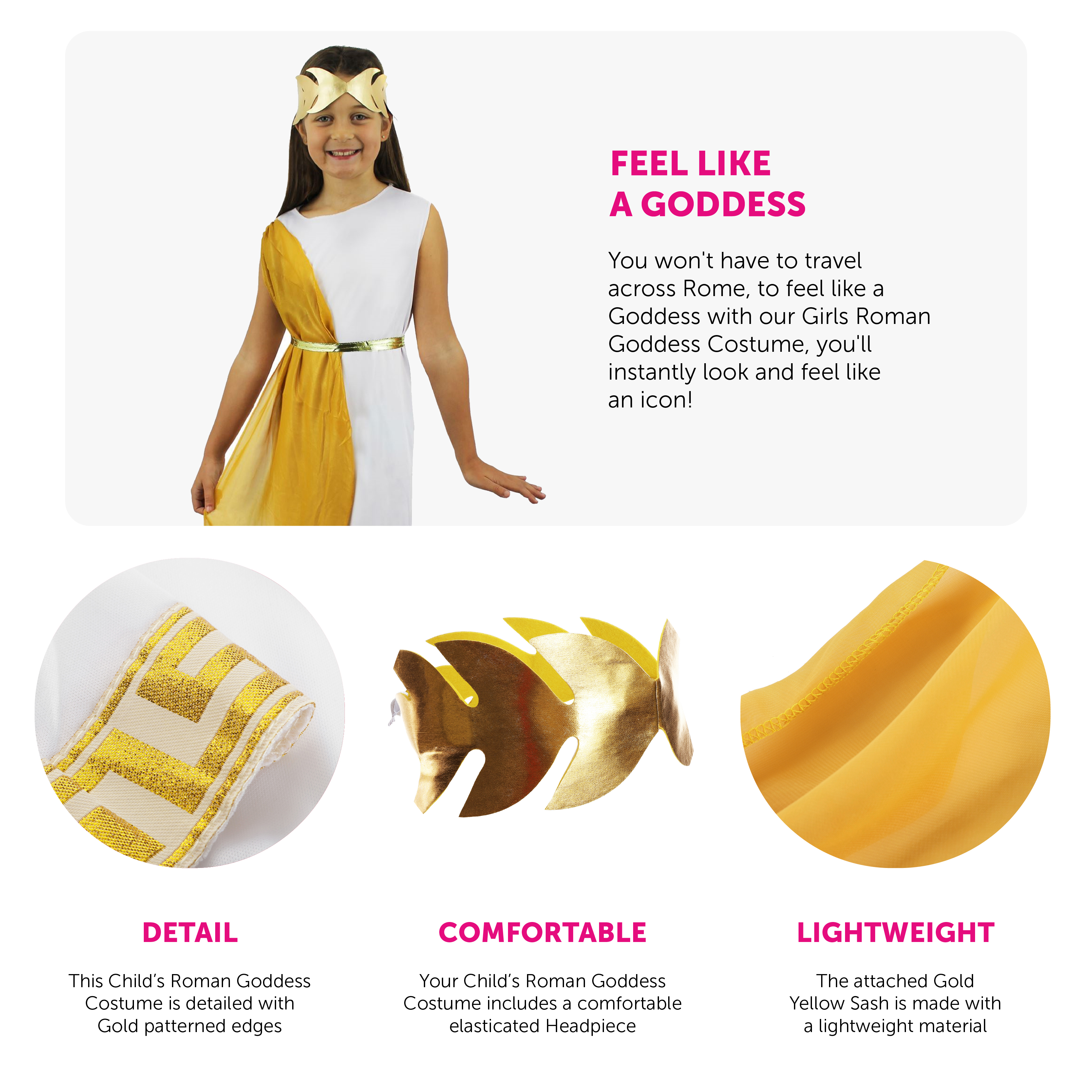 COSTUME DETAILS: Your Girls Roman Goddess Costume is a long White Tunic with Gold patterned edge detail, a Gold Sash and a Golden Headpiece, the perfect look for any fancy dress event this year!