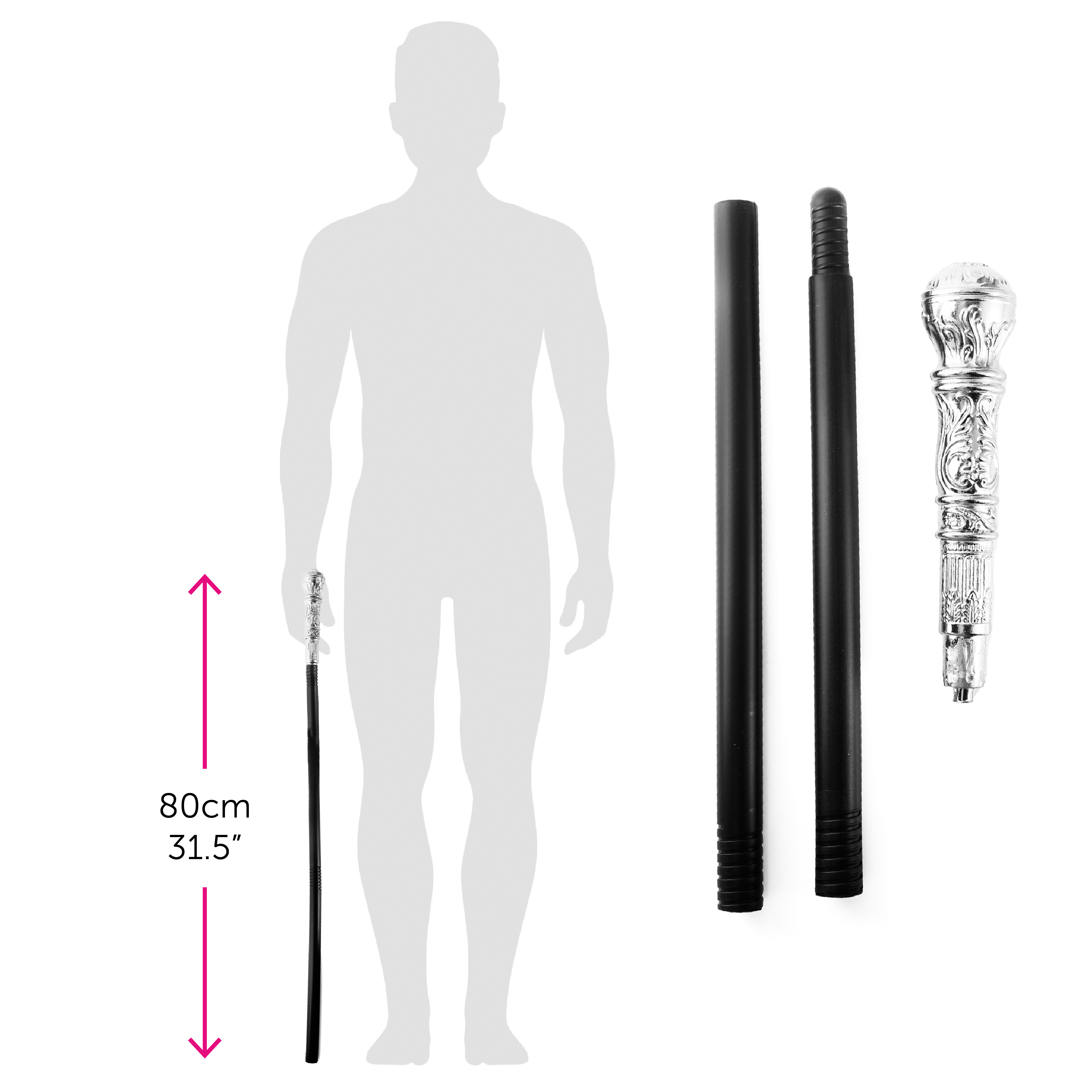 Complete your look with the stylish Silver Top Cane. Featuring a metallic silver patterned handle and sleek black shaft, this cane is the perfect finishing touch for classic and elegant costume characters.