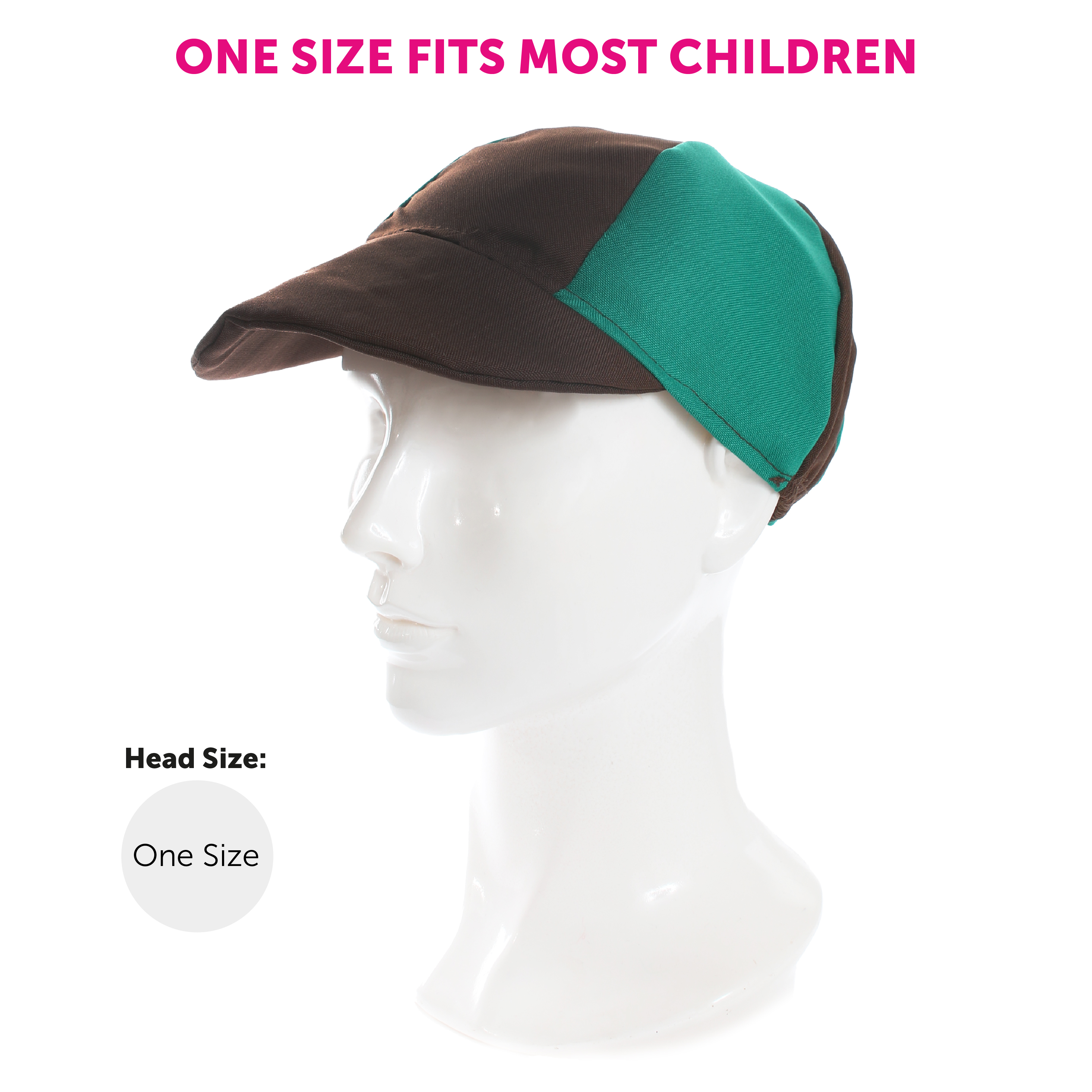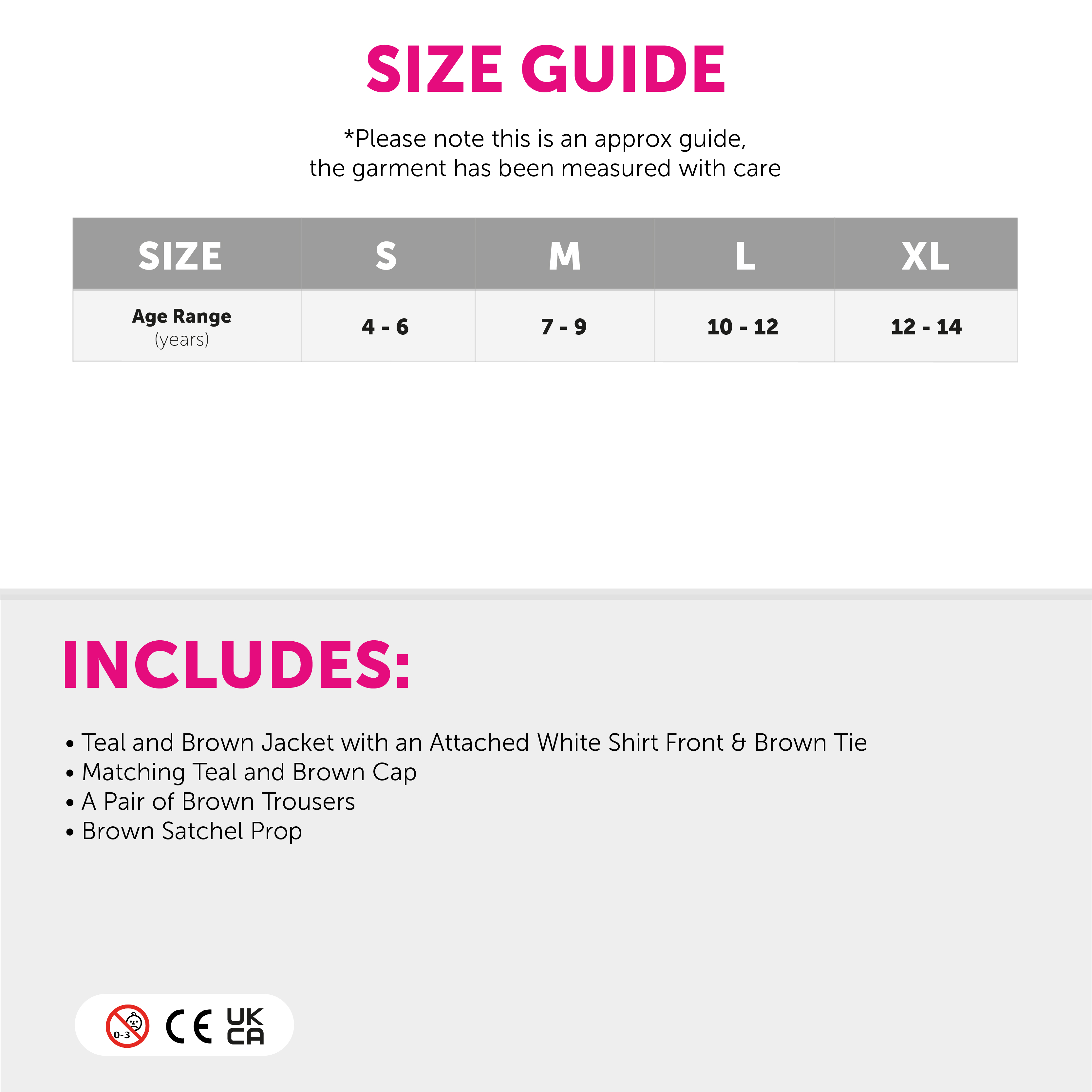 1940'S SCHOOL BOY DETAILS: Your Child’s 1940's School Boy Costume includes a Teal and Brown Jacket with an Attached White Shirt Front & Brown Tie, a Matching Teal and Brown Cap, a Pair of Brown Trousers and a Brown Satchel Prop to complete your classic historical look!