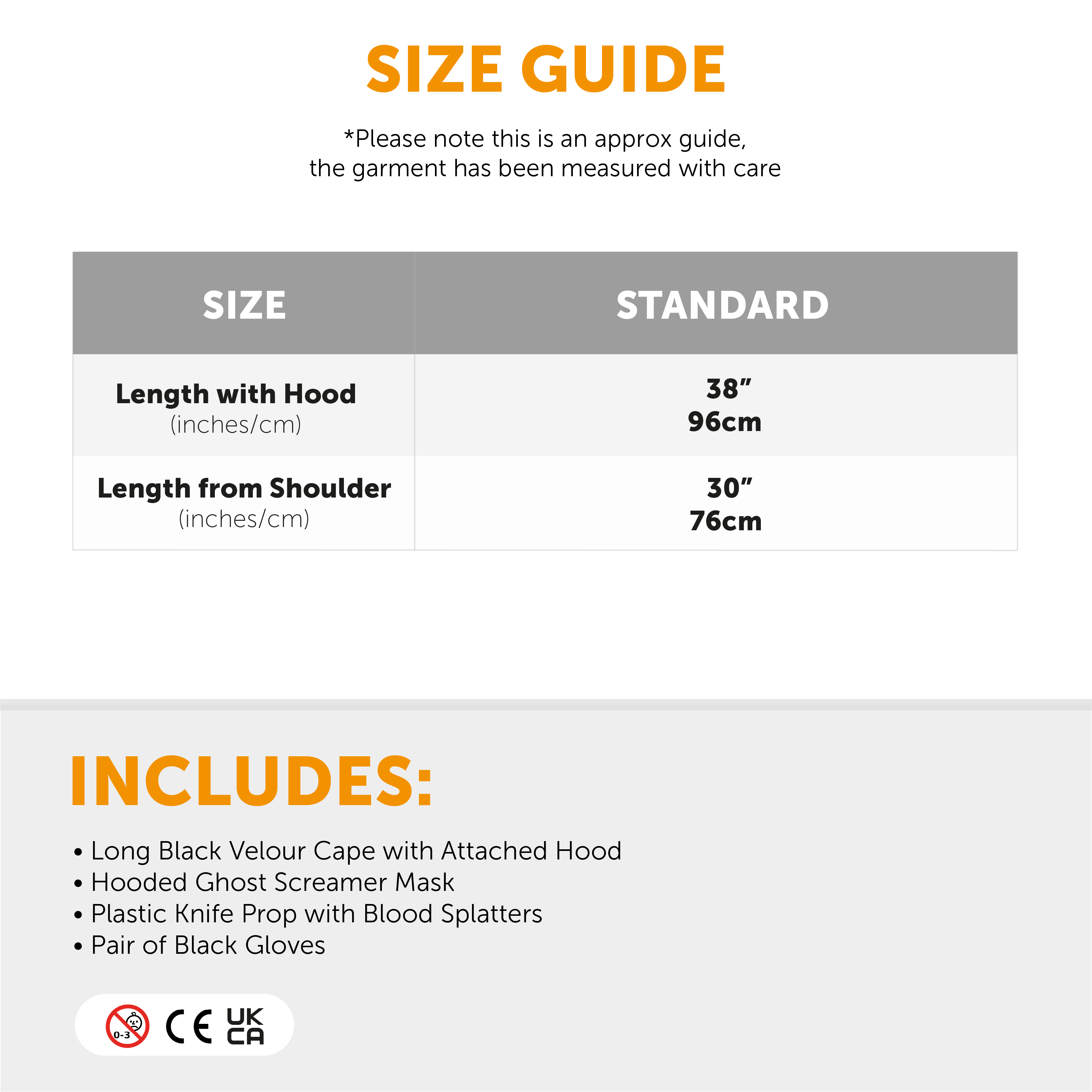 COSTUME INCLUDES: Your Child's Screamer Costume includes a long Black Hooded Velour Cape, a Hooded Ghost Face Screamer Mask, a Plastic Knife Prop with Blood Splatters, and a Pair of Black Gloves, the perfect look this Halloween!