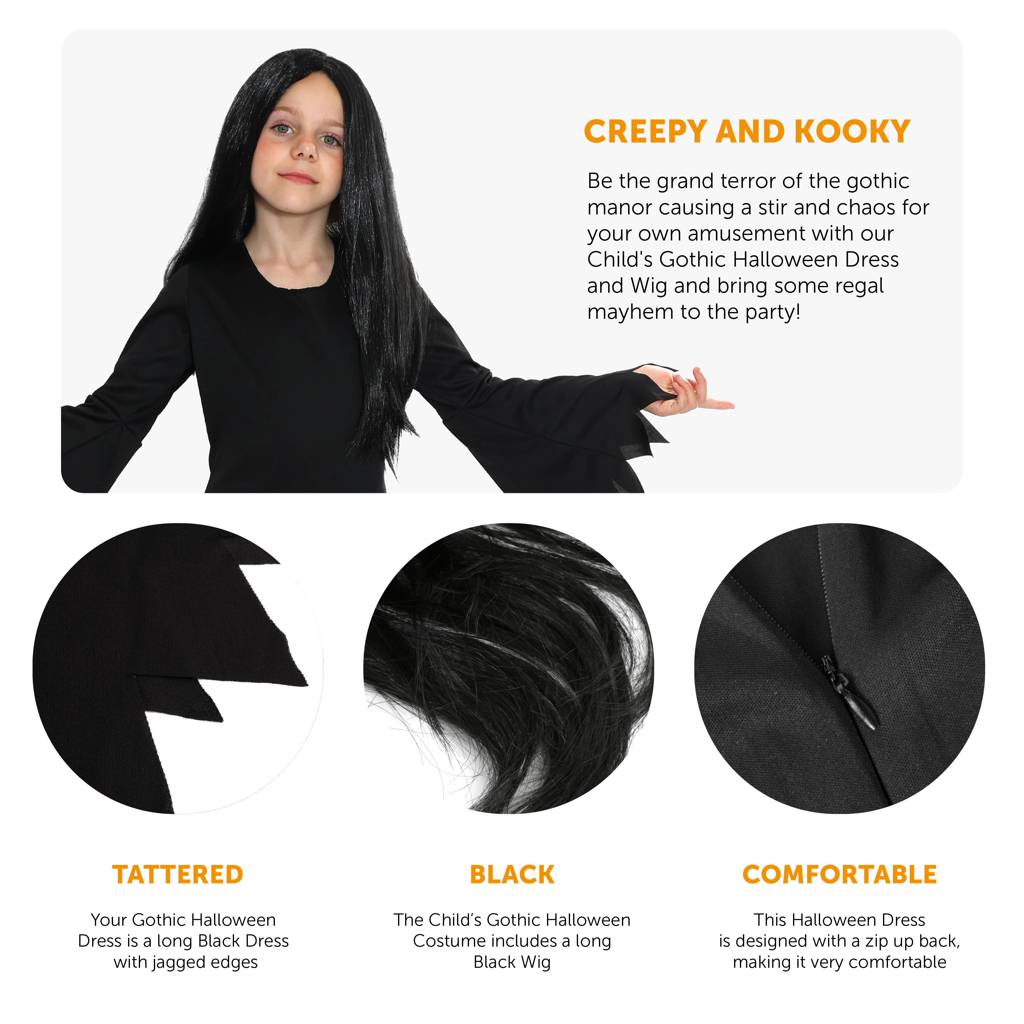 PERFECT FOR HALLOWEEN, FILM, TV & OTHER FANCY DRESS: Whether you want to spook the crowd for Halloween, your favourite Film or TV character, or any other fancy dress, be sure to pick up our Childs Gothic Halloween Horror Dress and Wig Costume Set!