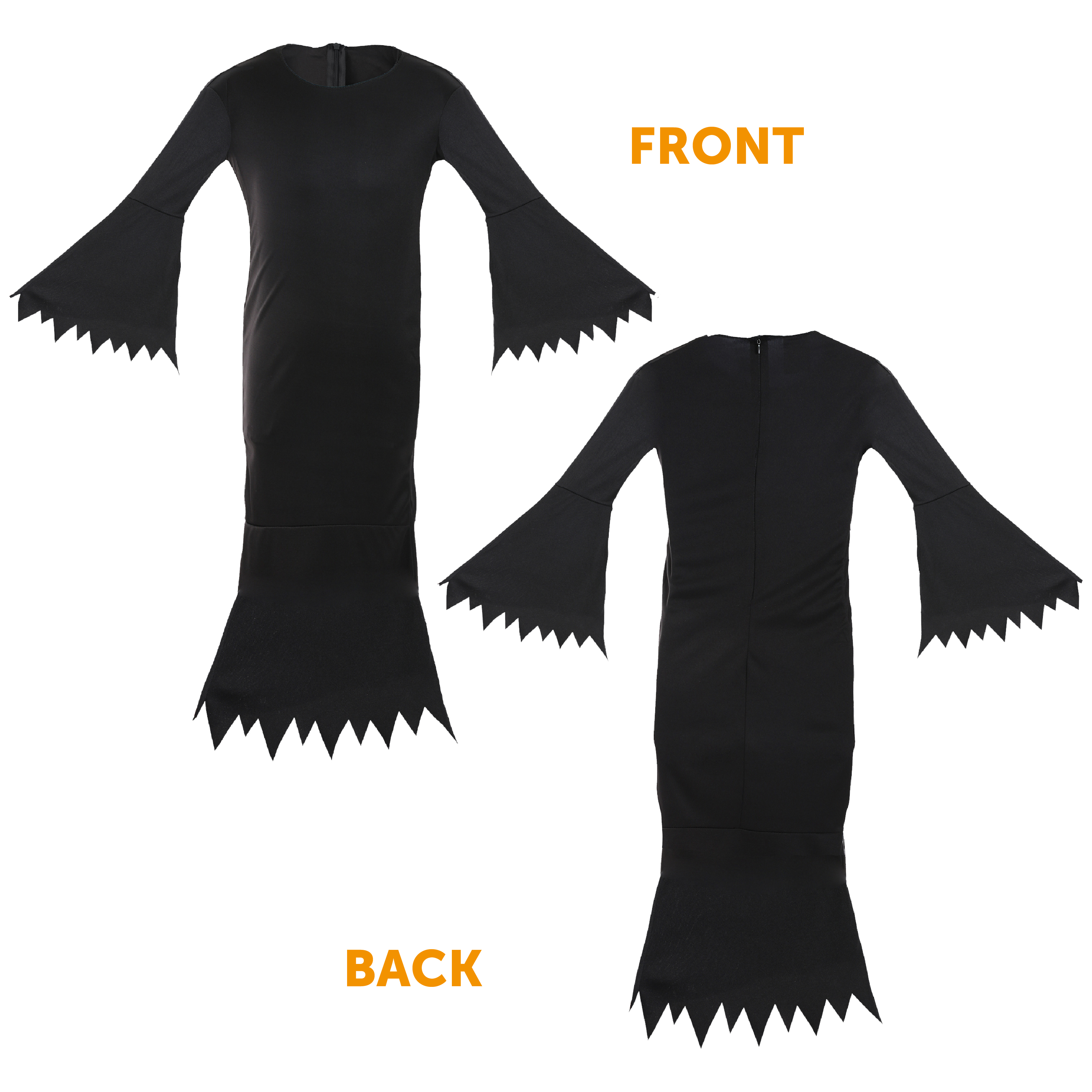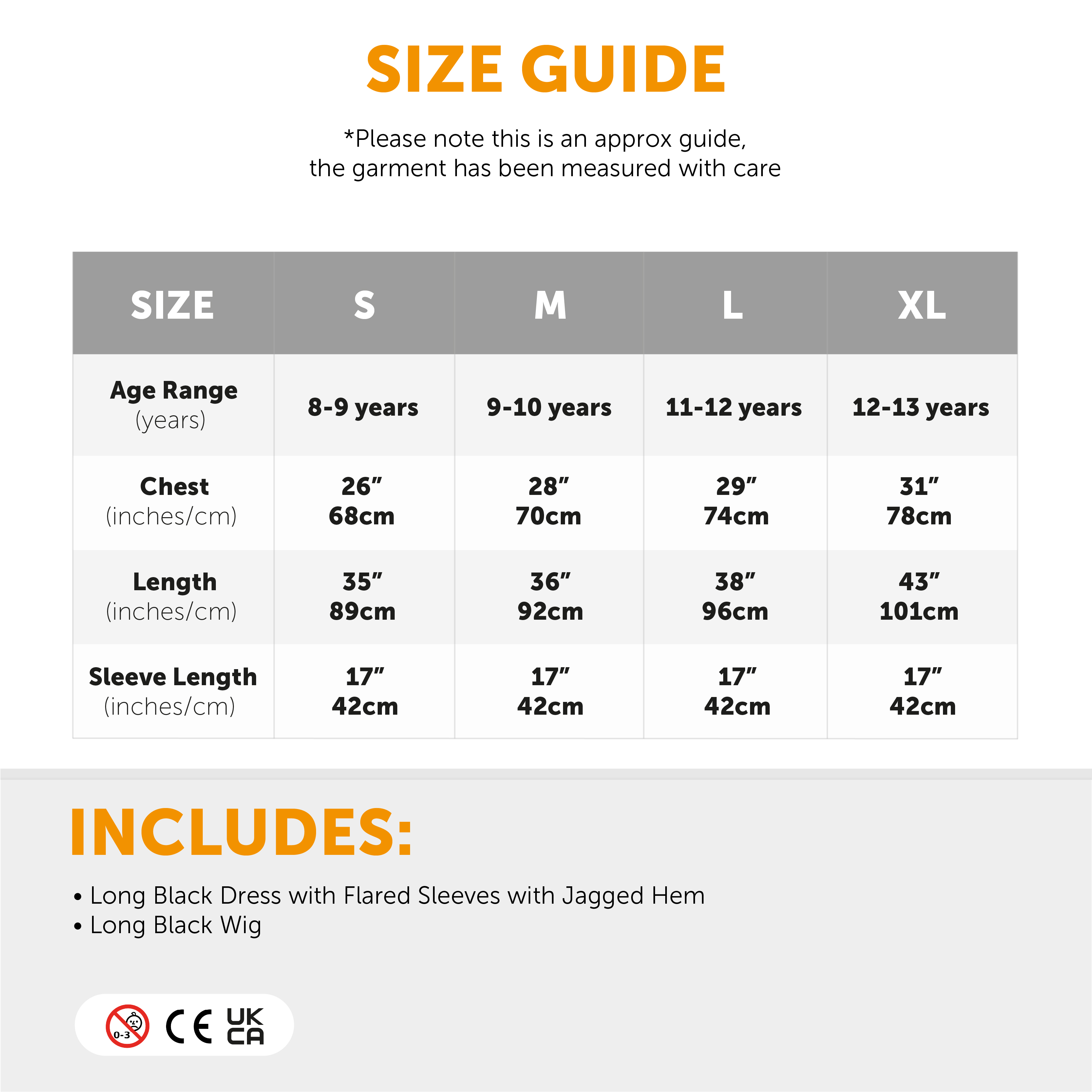 AVAILABLE IN MULTIPLE SIZES: This Girls Gothic Halloween Dress is available in multiple sizes from Small to X-Large: Small (8 –9 Years): Chest - 26” (68cm), Length - 35” (89cm), Sleeve - 17” (42cm) | Medium (9 –10 Years): Chest - 28” (70cm), Length - 36” (92cm), Sleeve - 17” (42cm)| Large (11 –12 Years): Chest - 29” (74cm), Length - 38” (96cm), Sleeve - 17” (42cm) | X-Large (12 –13 Years): Chest - 31” (78cm), Length - 43” (101cm), Sleeve - 17” (42cm)