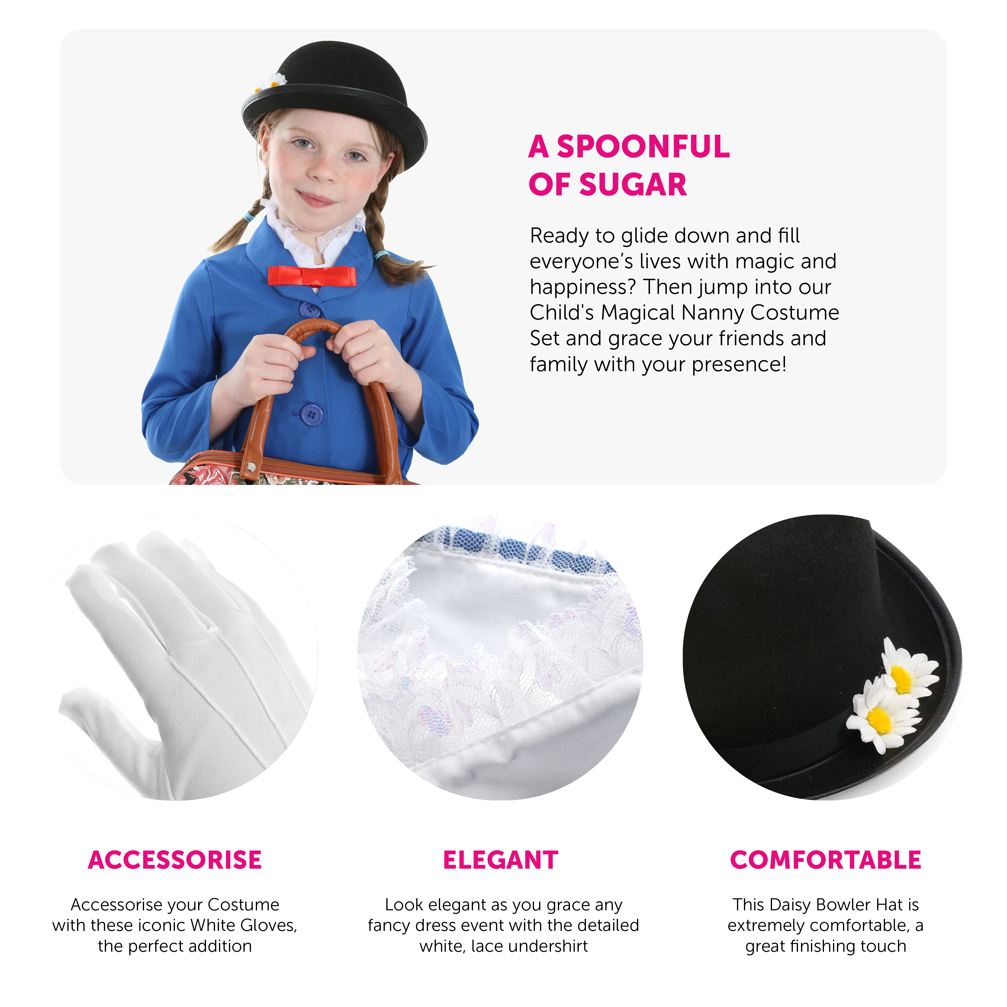 COSTUME SET INCLUDES: The Child's Magical Nanny Costume includes a Royal Blue, easy button up Jacket with an attached White Blouse inside and Red Bow Tie, a matching Long Blue Skirt, a Black Bowler Hat with Daisy Flower detailing, and White Gloves, the perfect World Book Day Costume!