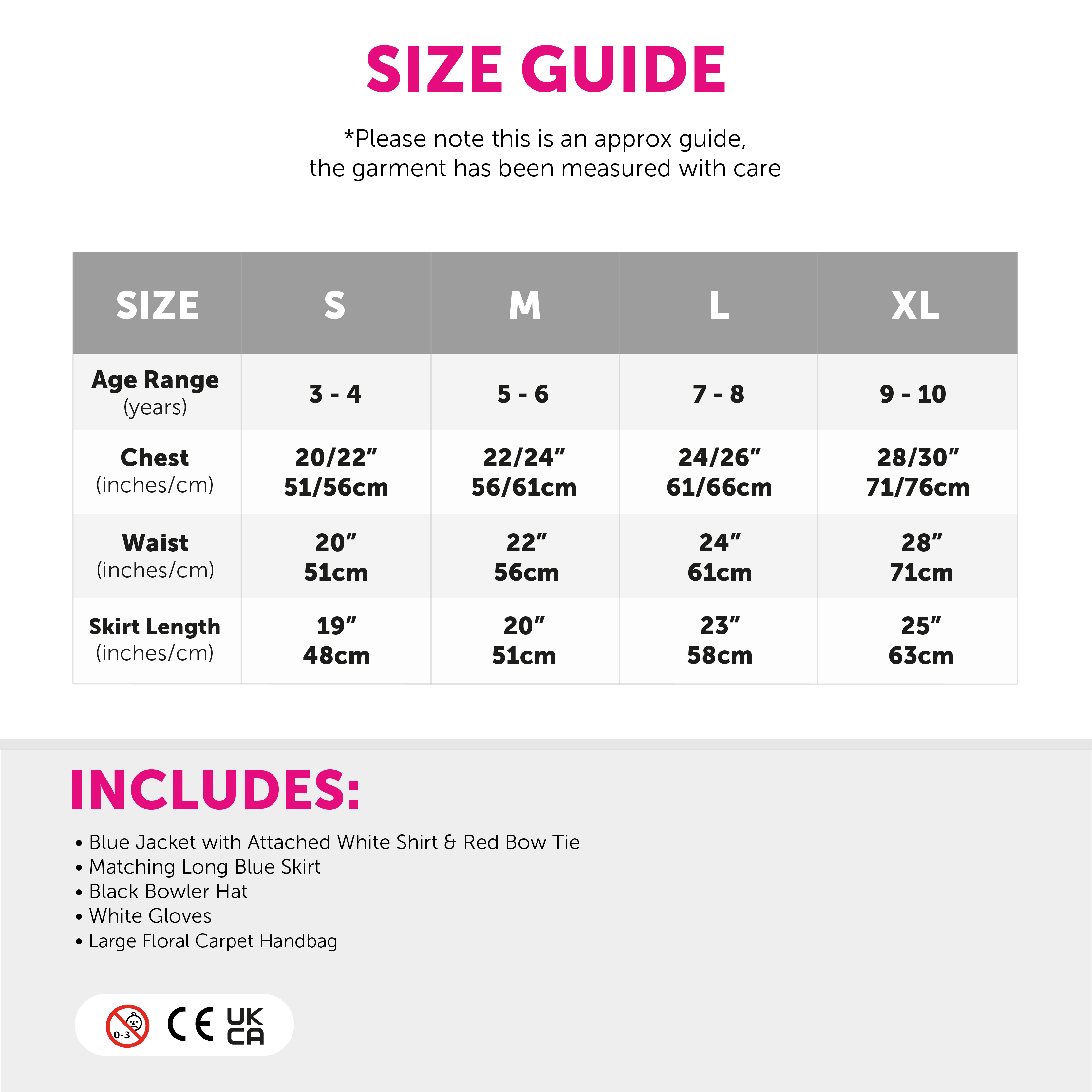 AVAILABLE IN MULTIPLE SIZES: Our Child's Magical Nanny Costume is available in sizes Small – X-Large: Small (3 - 4 years) Chest 20/22" (51/56cm), Waist 20" (51cm), Skirt Length 19" (48cm) | Medium (5 - 6 years) Chest 22/24" (56/61cm), Waist 22" (56cm), Skirt Length 20" (51cm) | Large (7 - 8 years) Chest 24/26" (61/66cm), Waist 24" (61cm), Length 23" (58cm) | X-Large (9 - 10 years) Chest 28/30" (71/76cm), Waist 28" (71cm), Length 25" (63cm)