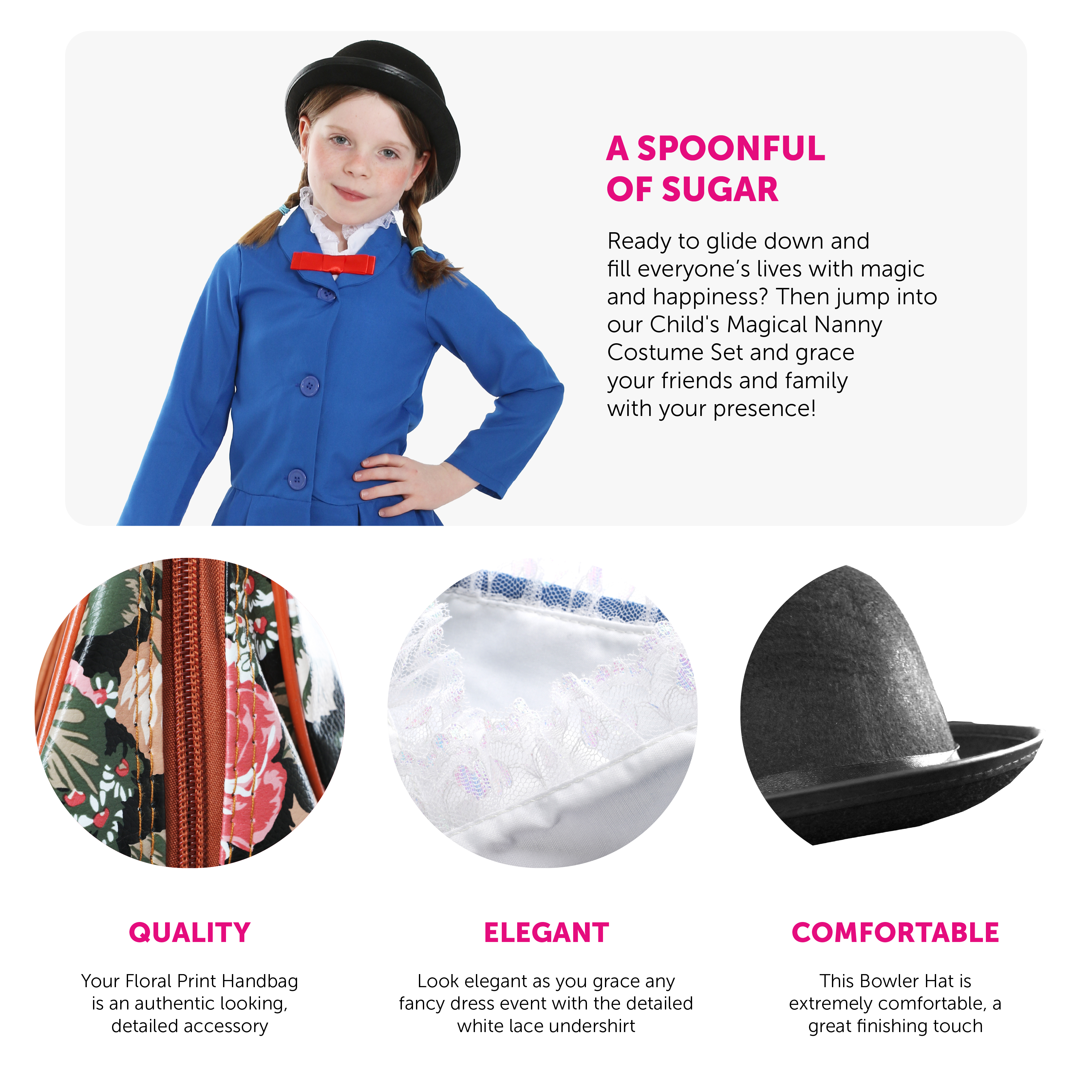 CHILDS MAGICAL NANNY COSTUME SET: Ready to glide down and fill everyone’s lives with magic and happiness? Then jump into our Child's Magical Nanny Costume Set and grace your friends and family with your presence!