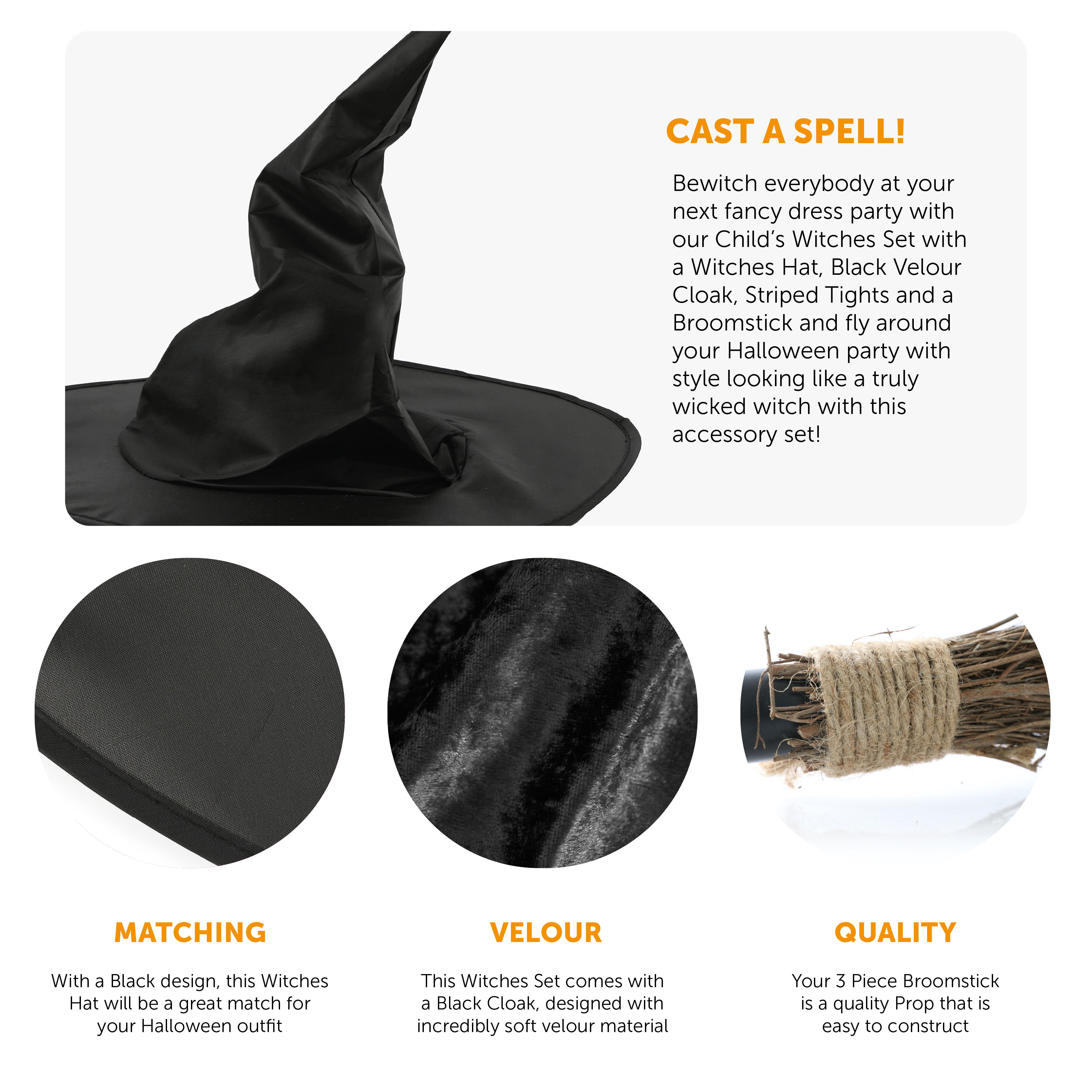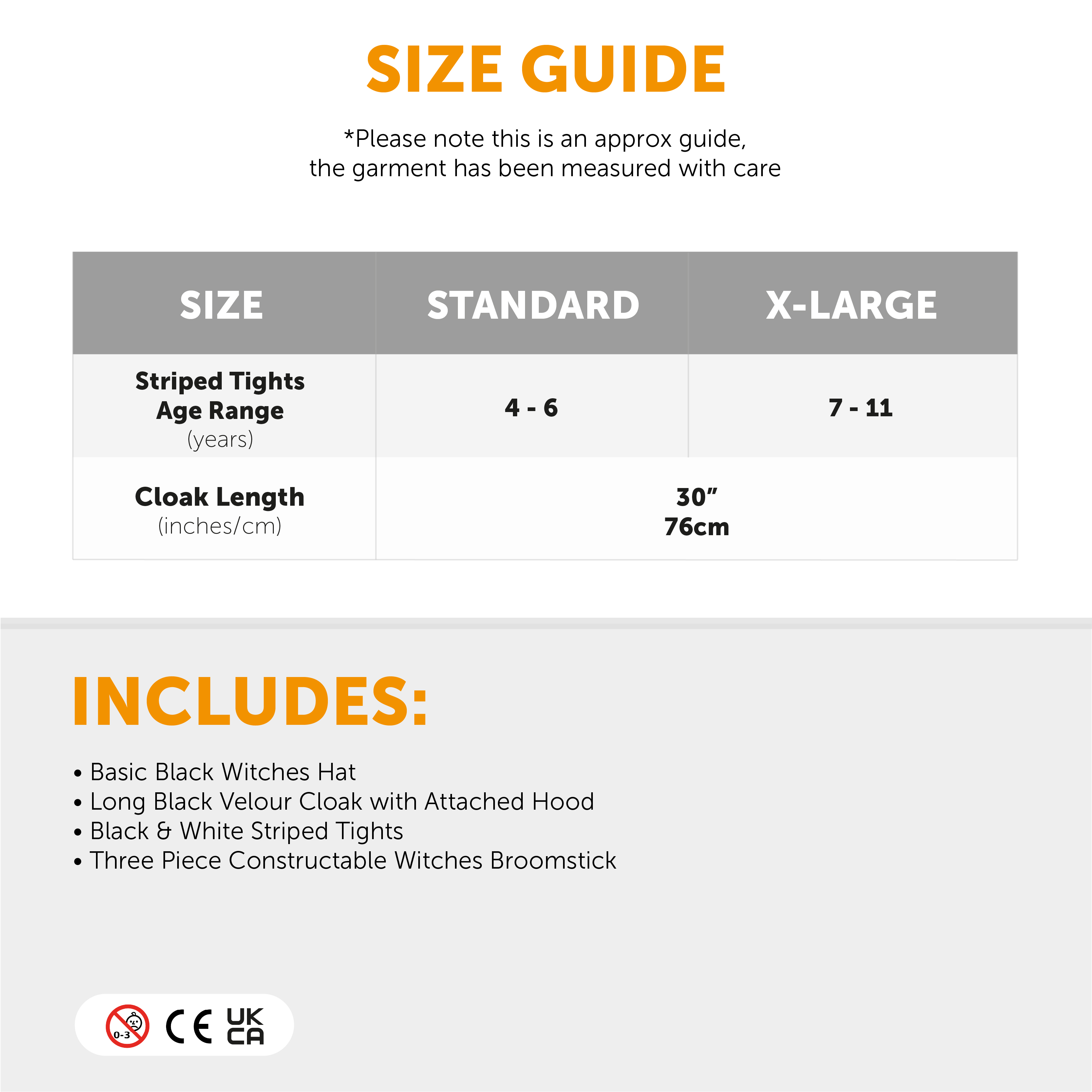 COSTUME DETAILS: The Childs Deluxe Witch Costume includes a lightweight Black Witches Hat, a Long Black Velour Cloak with an attached Hood, a pair of Black and White Striped Tights, and a 3 Piece Witches Broomstick prop with an authentic design, the perfect set to accompany your spooky Witch style!