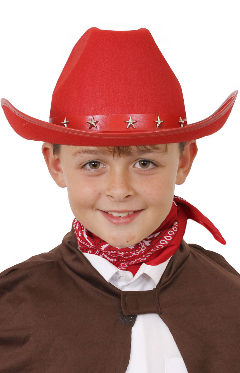 CHILD'S RED STUDDED COWBOY HAT: Ride high with this Red Star Studded Cowboy Hat no matter what occasion you wrangle yourself into! Whether it be for a Wild West themed Fancy dress party, or any other event, this Child's Red Cowboy Hat is perfect!
