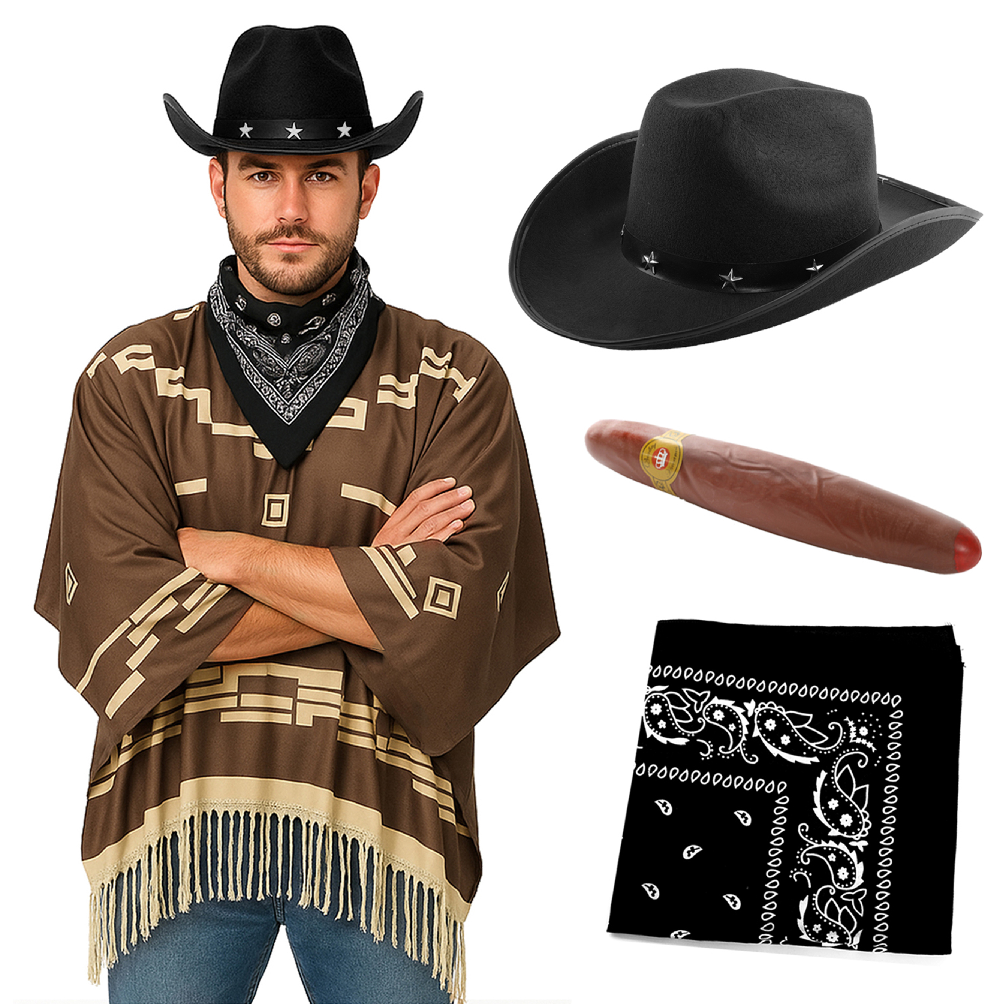 Adults Wild Western Costume | 4 Pcs | Brown Poncho, Cigar, Black Bandana & Black Star Studded Cowboy Hat £18.99