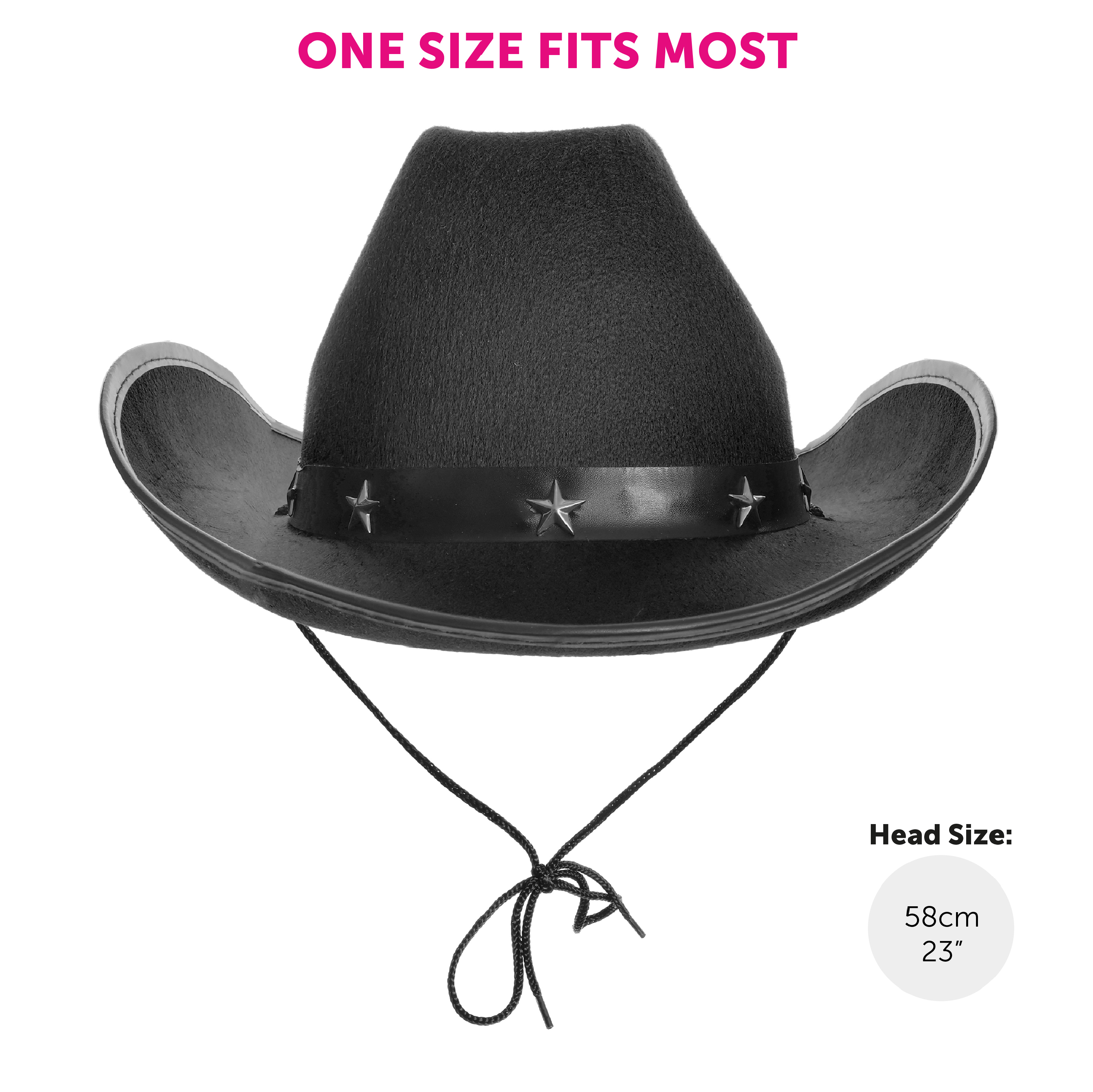 GREAT SIZED HAT: This Black Star Studded Cowboy Hat is designed to fit most Adults comfortably with a suitable head size of 58cm (23")
