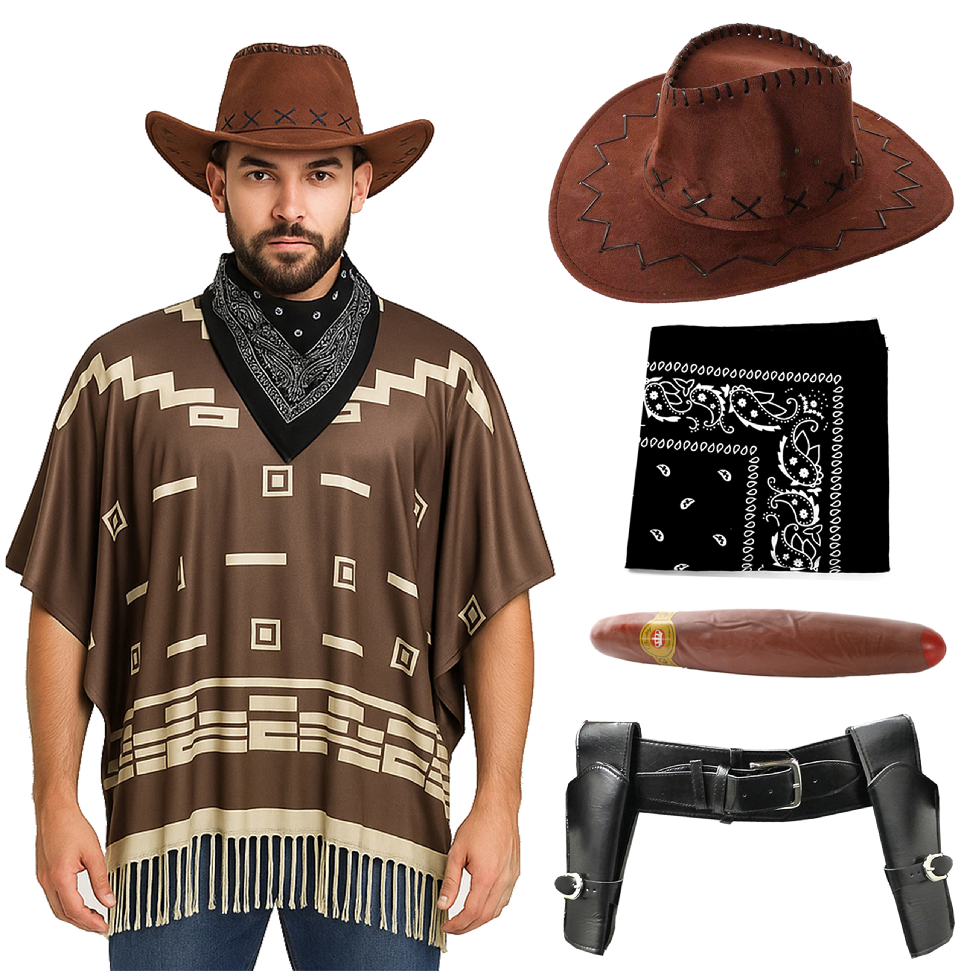 Adults Wild Western Costume | 5 Pcs | Brown Poncho, Cigar, Black Bandana, Holster & Brown Suede Cowboy Hat   £25.99