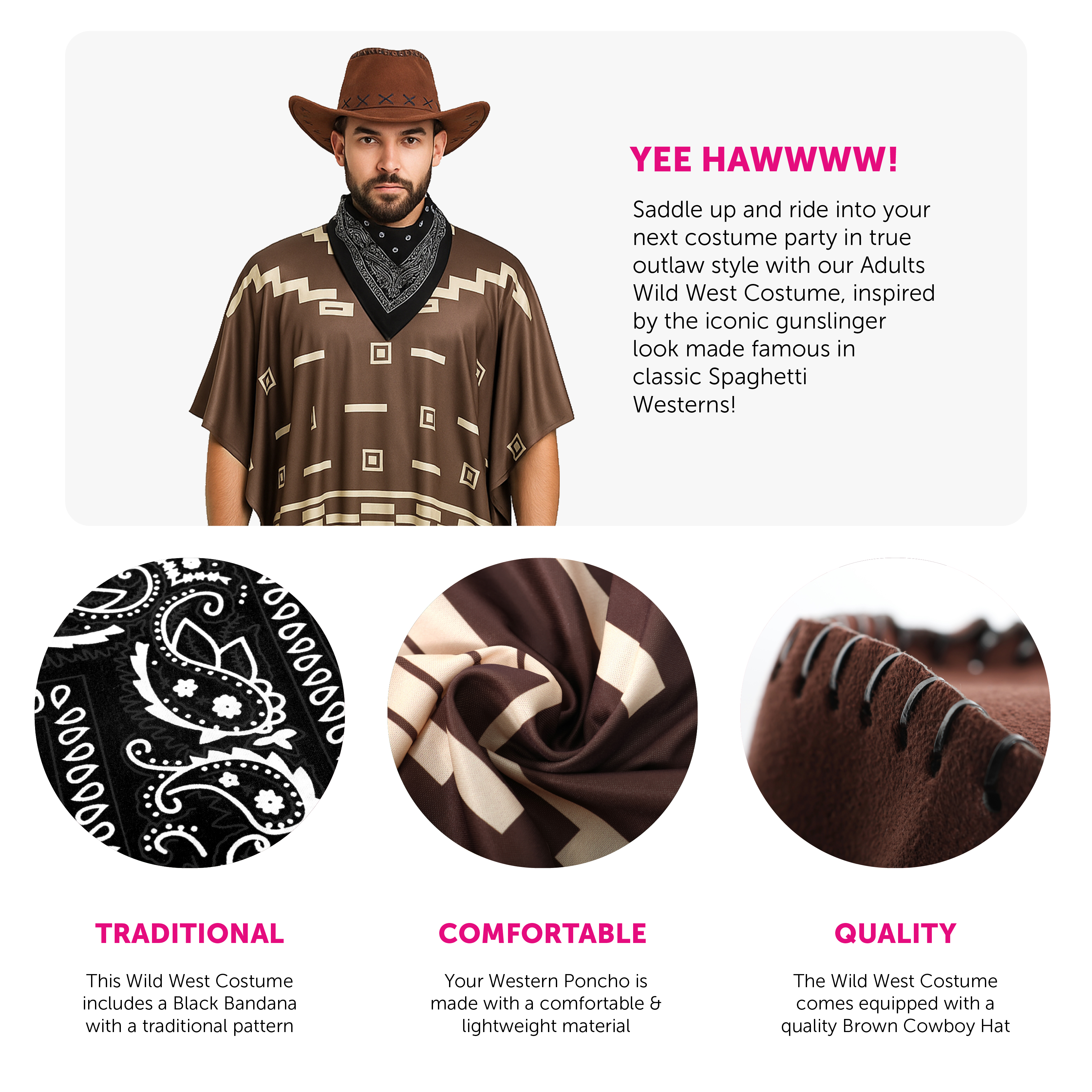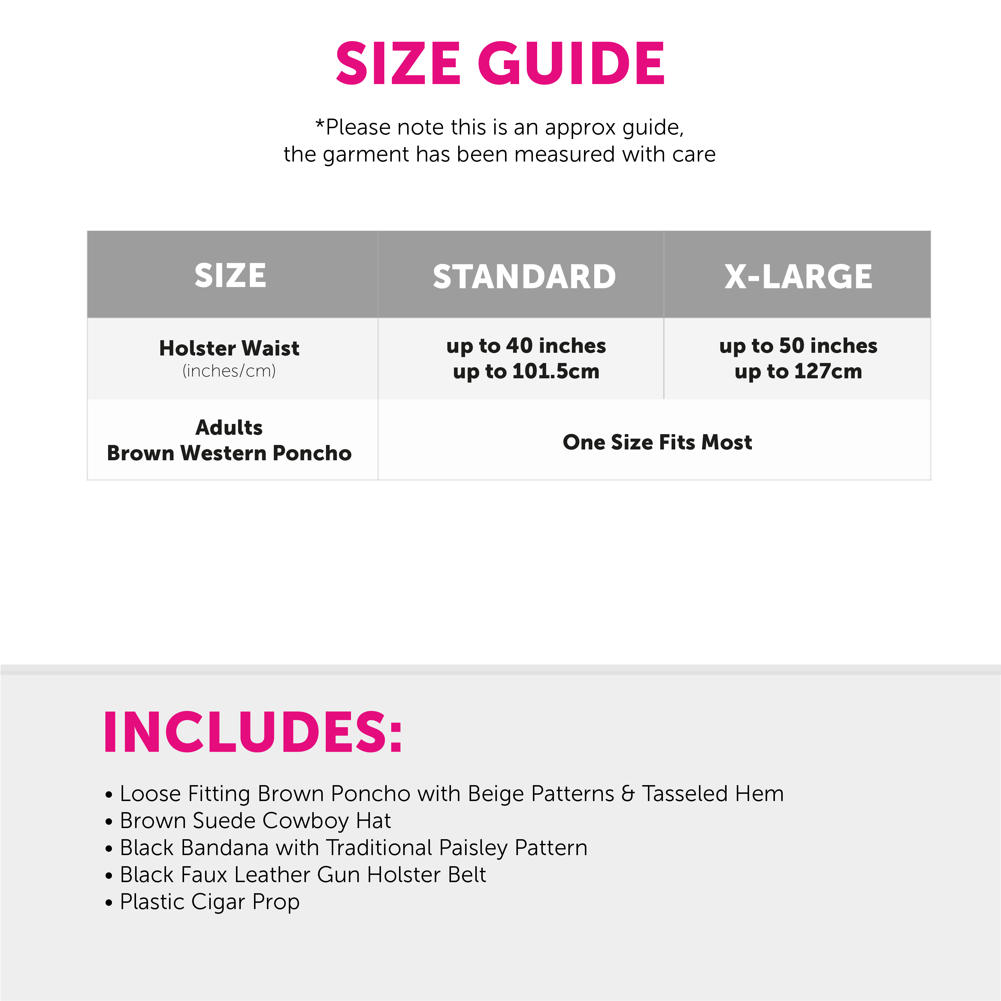 COSTUME INCLUDES: Your Adults Wild West Costume includes a Large Brown Poncho detailed with bold geometric patterns and a Tasseled Hem, a Brown Faux Suede Cowboy Hat, a Plastic Cigar, a Holster Belt, and a Black Bandana with a traditional paisley pattern, to complete the look!