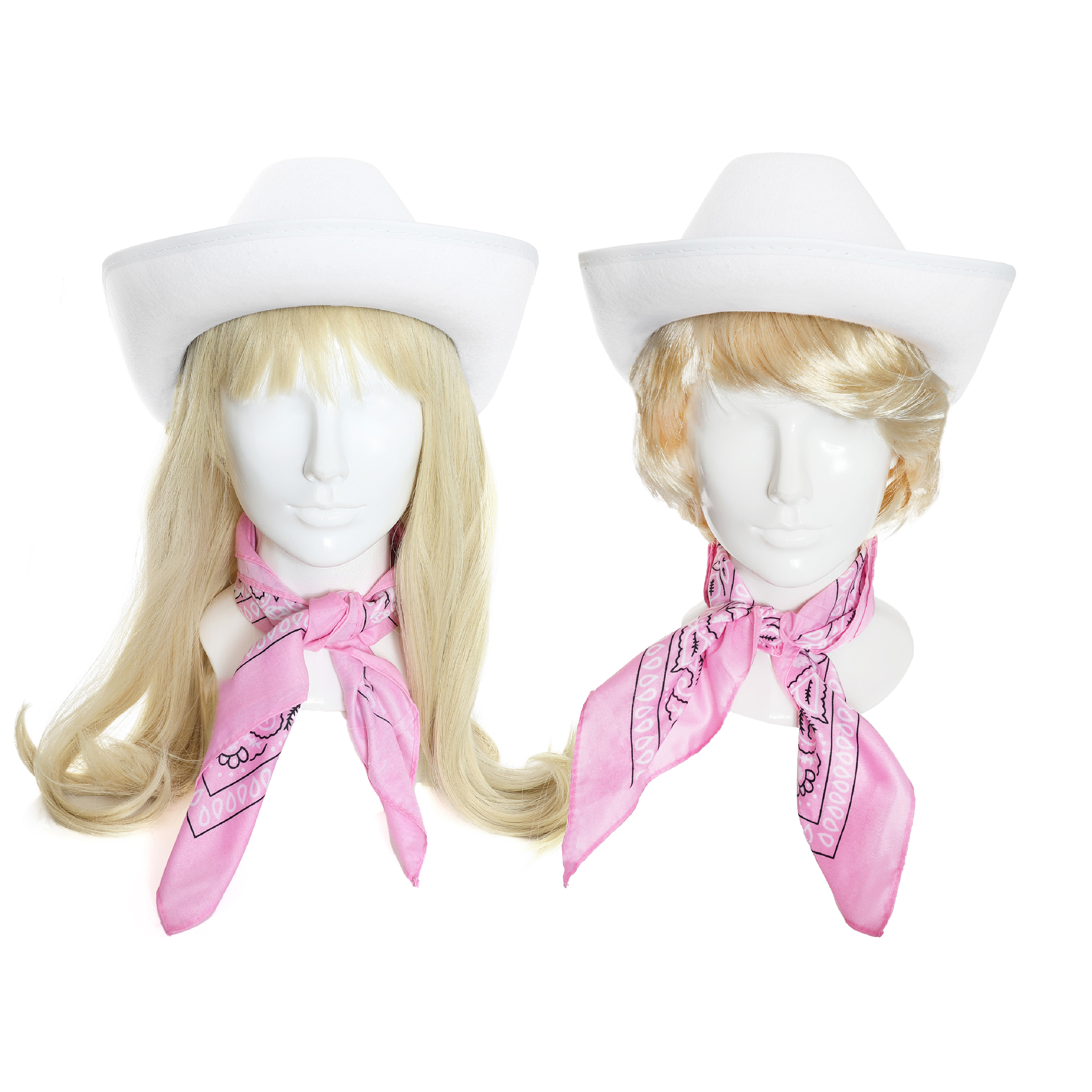 ACCESSORY SET INCLUDES: Your Couples Cowboy and Cowgirl Doll Accessory Set includes 2x White felt Hats, with Silver Star studs around Black Band and an adjustable black string for extra comfort, a luscious, light Blonde Wig with a fringe that is suitable for heat styling in any way you want, a Short Blonde Wig and 2x Pink Bandana Scarves covered in a traditional Paisley Pattern - the perfect Accessory Set for any fancy dress event!