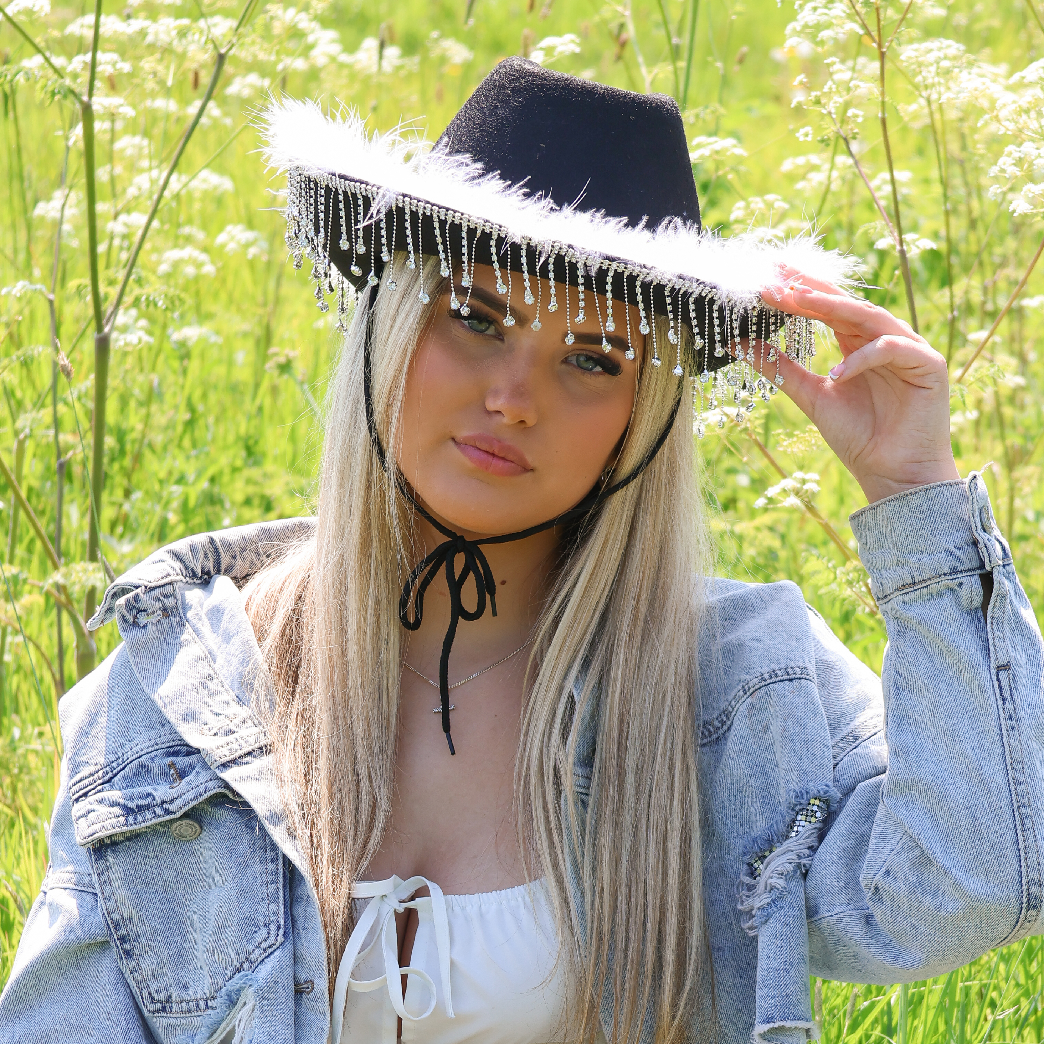 COWGIRL HAT DETAILS: This Cowgirl Hat is a Black tone, with a fluffy, White Marabou Feather detail and Diamantes around the brim and an adjustable black string for extra comfort, the perfect way to finish off your outfit!