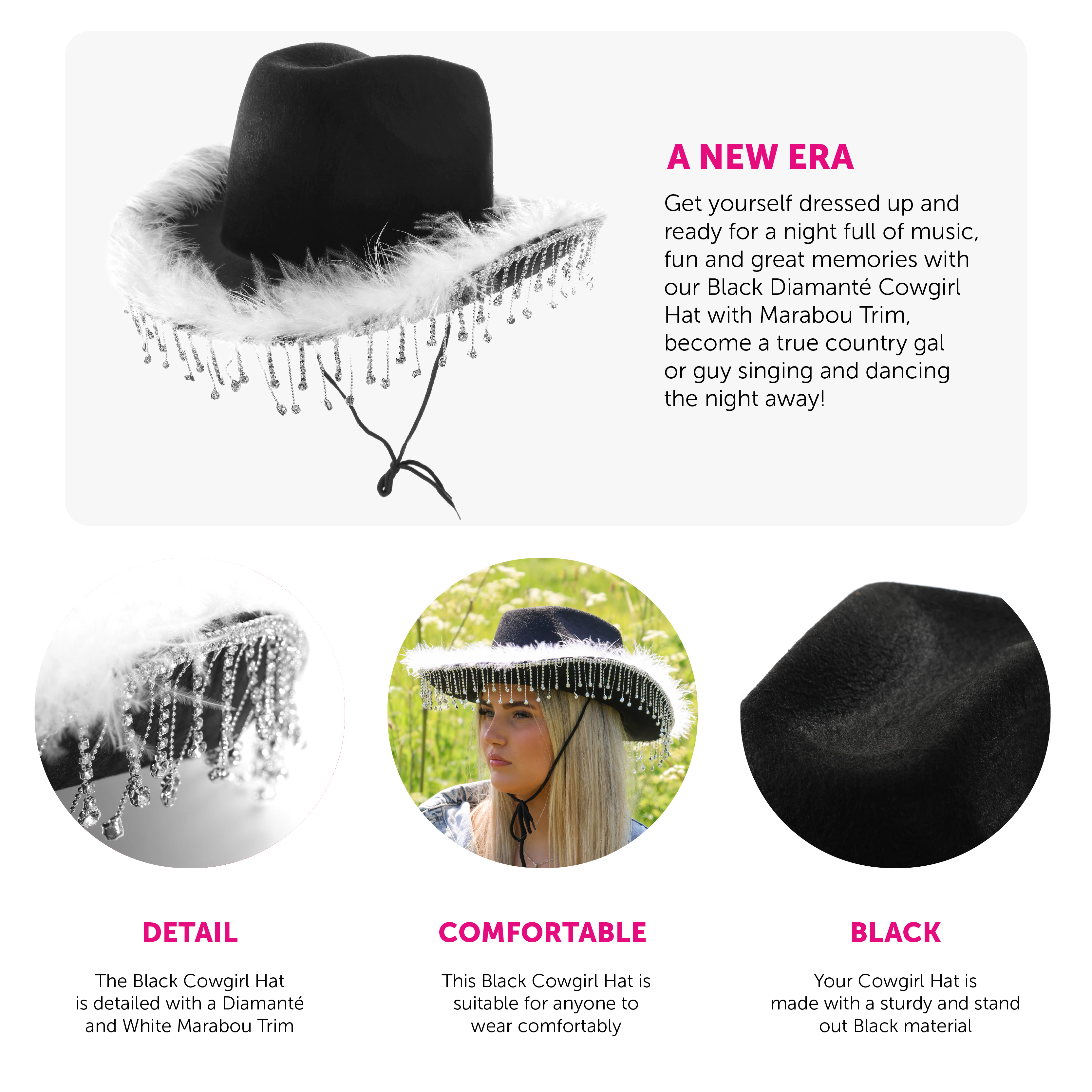 BLACK DIAMANTE COWGIRL HAT WITH MARABOU TRIM: Get yourself dressed up and ready for a night full of music, fun and great memories with our Black Diamante Cowgirl Hat with Marabou Trim, become a true country gal or guy singing and dancing the night away!