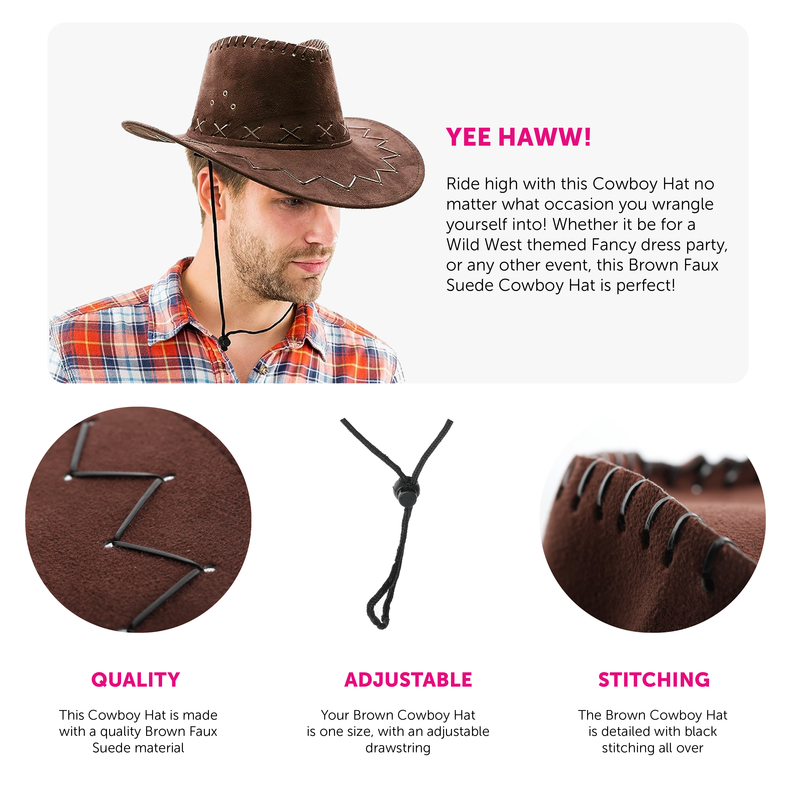 HAT DETAILS: This Cowboy Hat is a quality Brown coloured, classic shaped Cowboy Hat made with a faux suede material, detailed with crosshatch stitching and an adjustable drawstring for a more secure fit!