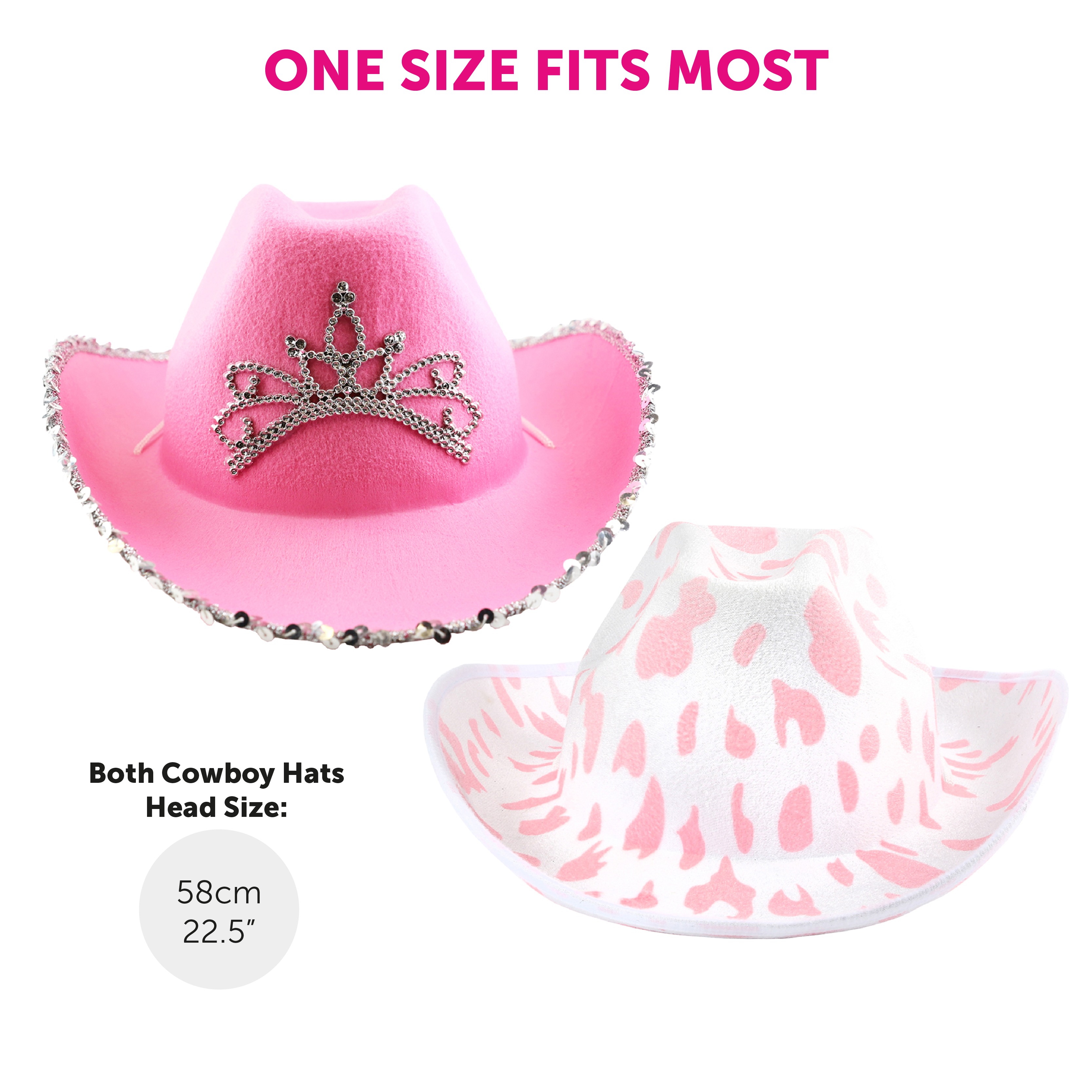 ONE SIZE HAT: Both the Pink Tiara Cowboy Hat and the Cow Print Cowboy Hat are the perfect size for anyone to wear with a suitable head size of up to 58cm (22.5"), and an adjustable cord to wear comfortably all night long!