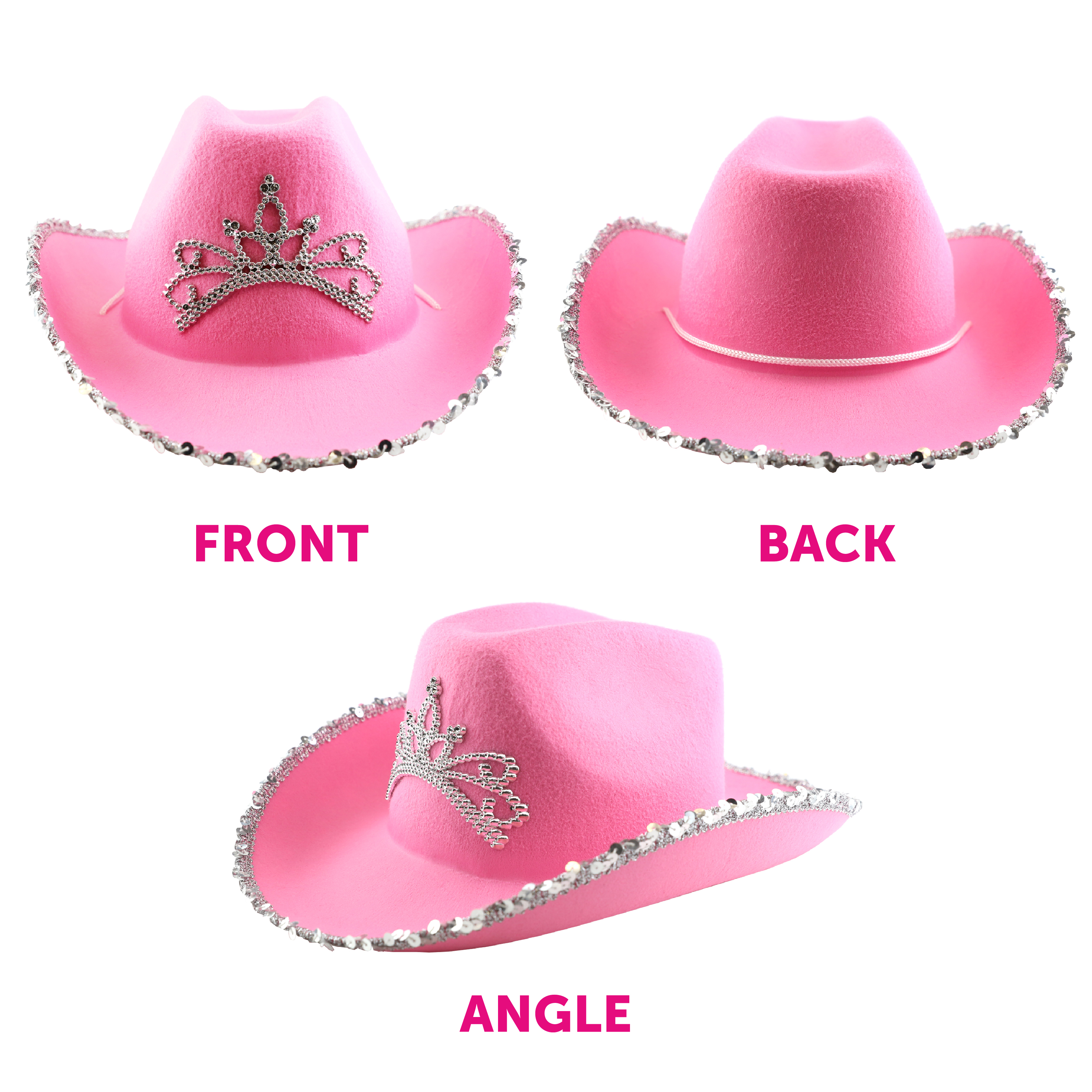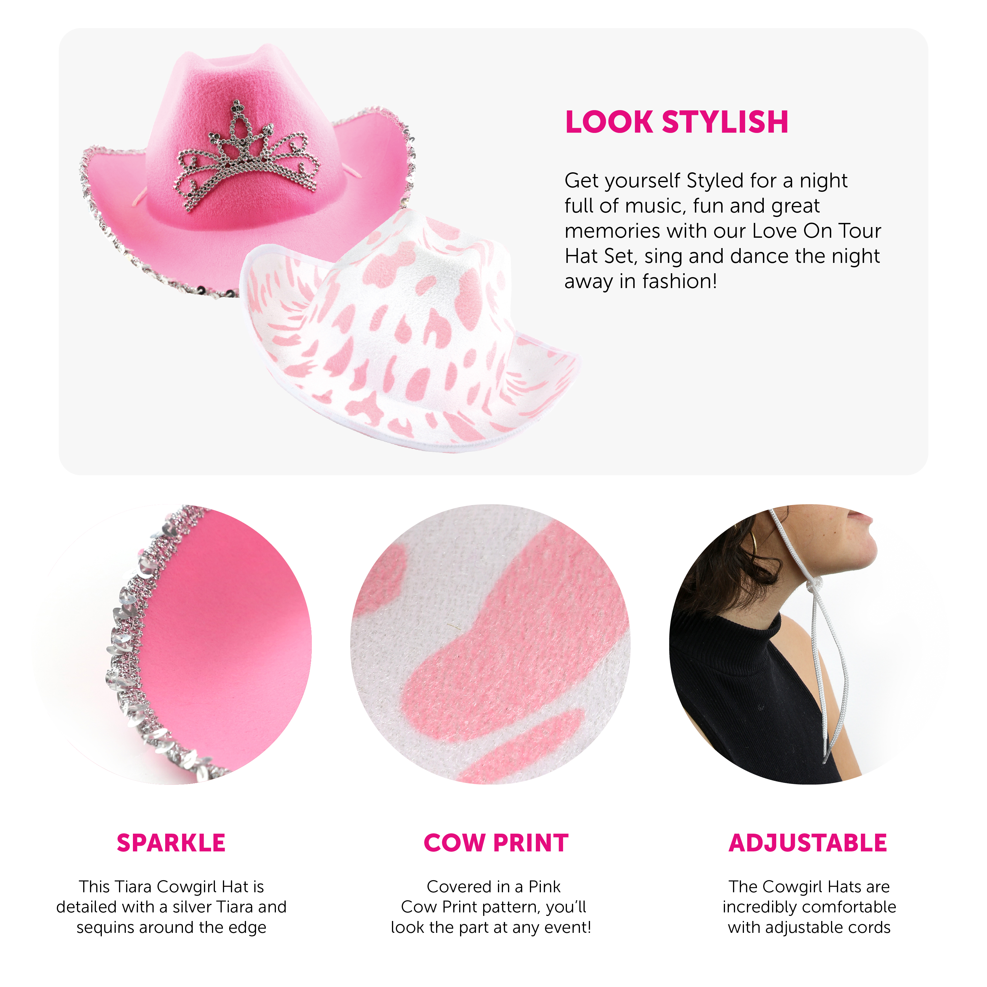 HAT SET INCLUDES: This Love On Tour Hat Set includes 1x Pink Cowboy Hat with a silver Tiara on the front and 1x Pink and White Cow Print covered Cowboy Hat, both with adjustable cords for a better fit!