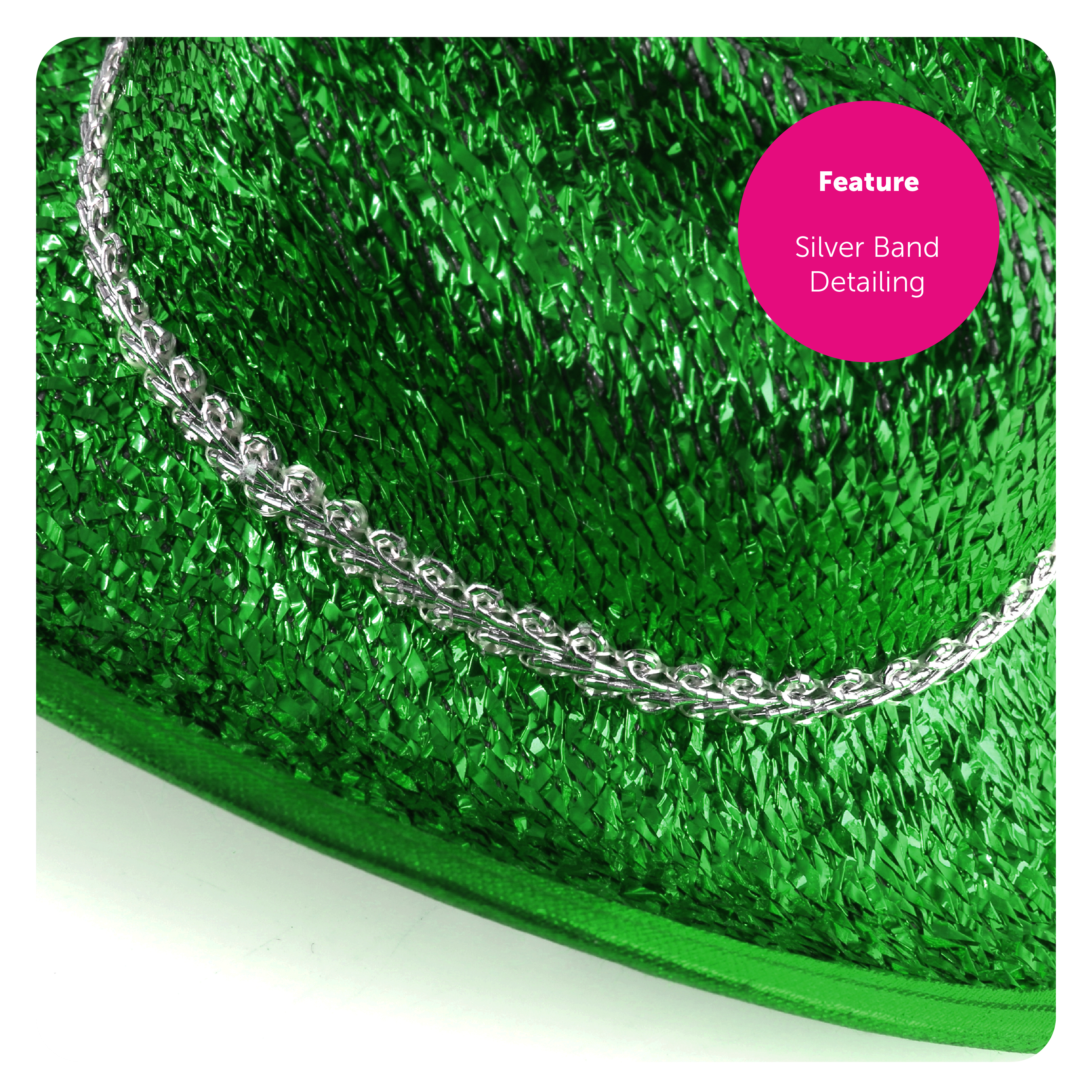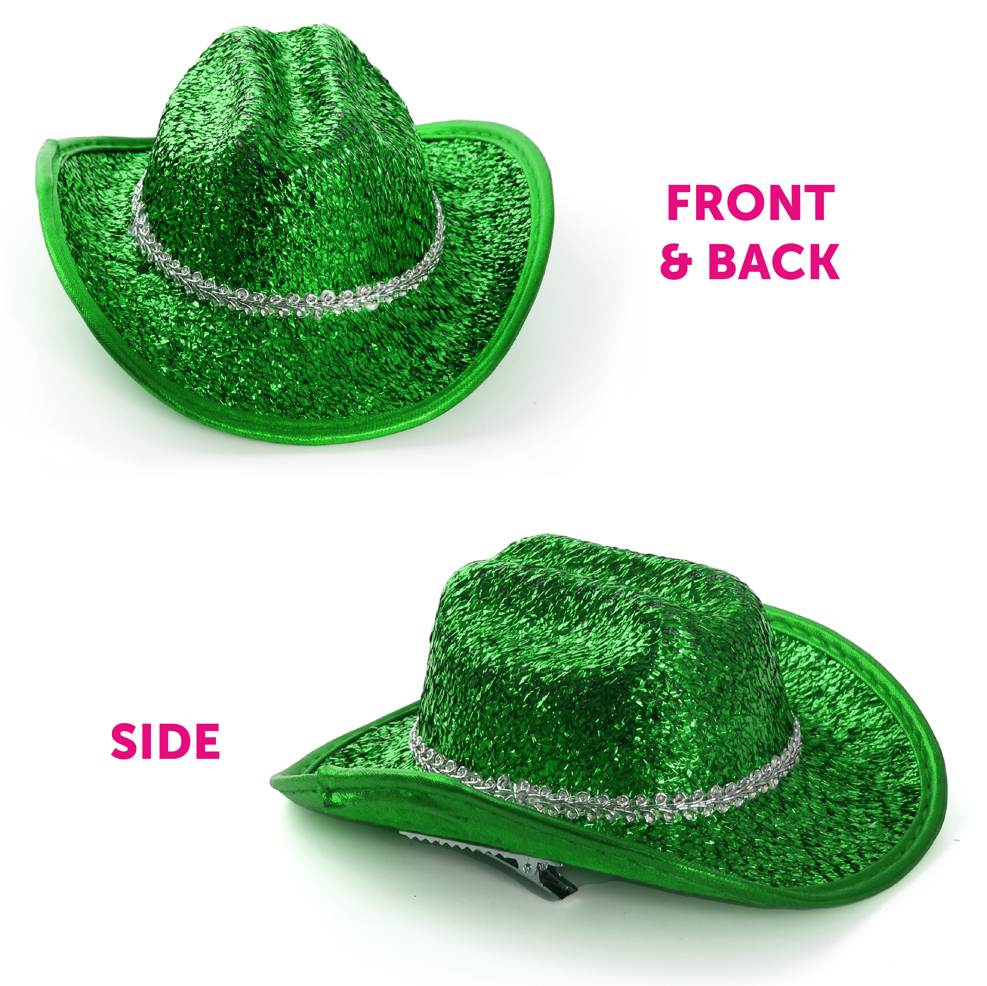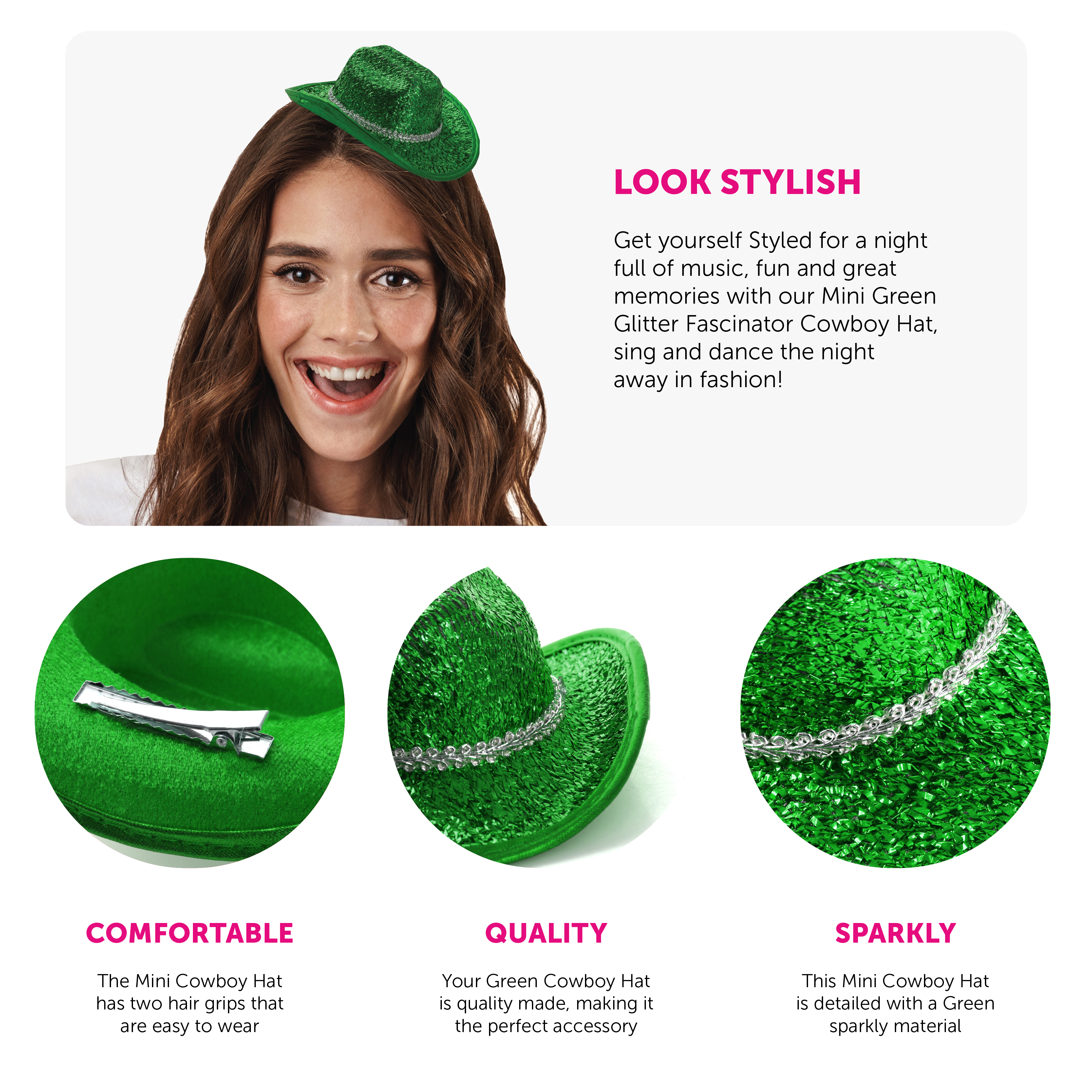 COWBOY HAT DETAILS: This Mini Cowboy Hat is a Green sparkly Hat with a detailed decorative Silver band, the Hat is attachable with two hair grips on the bottom, the perfect way to finish off your fancy dress outfit!