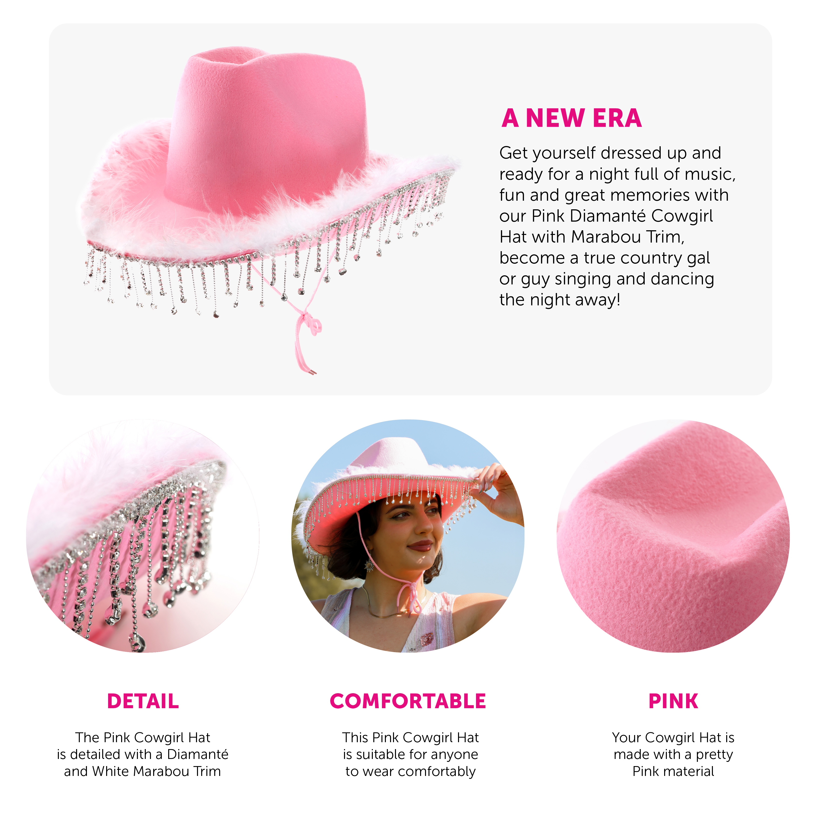 PINK DIAMANTE COWGIRL HAT WITH MARABOU TRIM: Get yourself dressed up and ready for a night full of music, fun and great memories with our Pink Diamante Cowgirl Hat with Marabou Trim, become a true country gal or guy singing and dancing the night away!