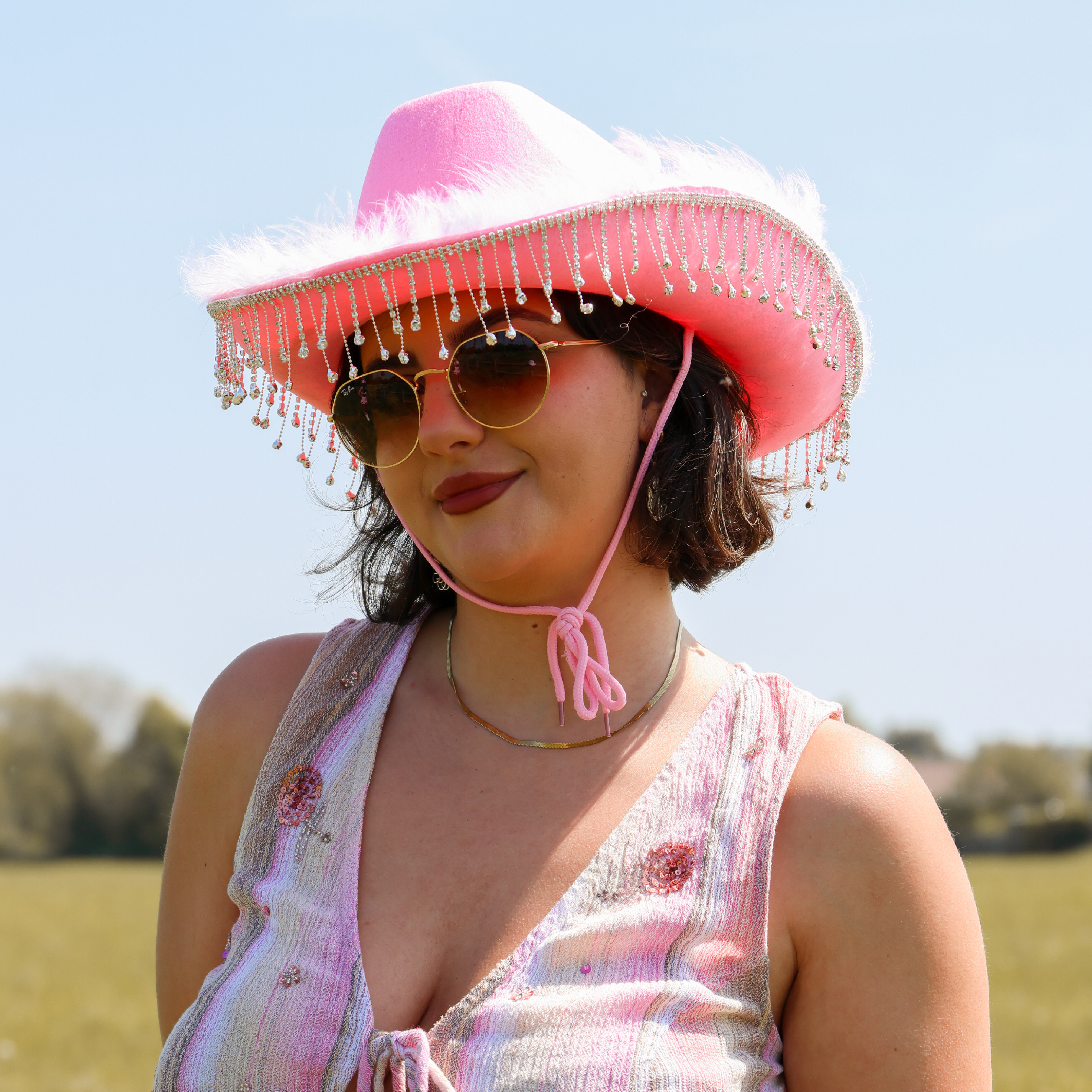 COWGIRL HAT DETAILS: This Cowgirl Hat is a pretty Pink colour, with a fluffy, White Marabou Feather detail and Diamantes around the brim and an adjustable Pink string for extra comfort, the perfect way to finish off your outfit!