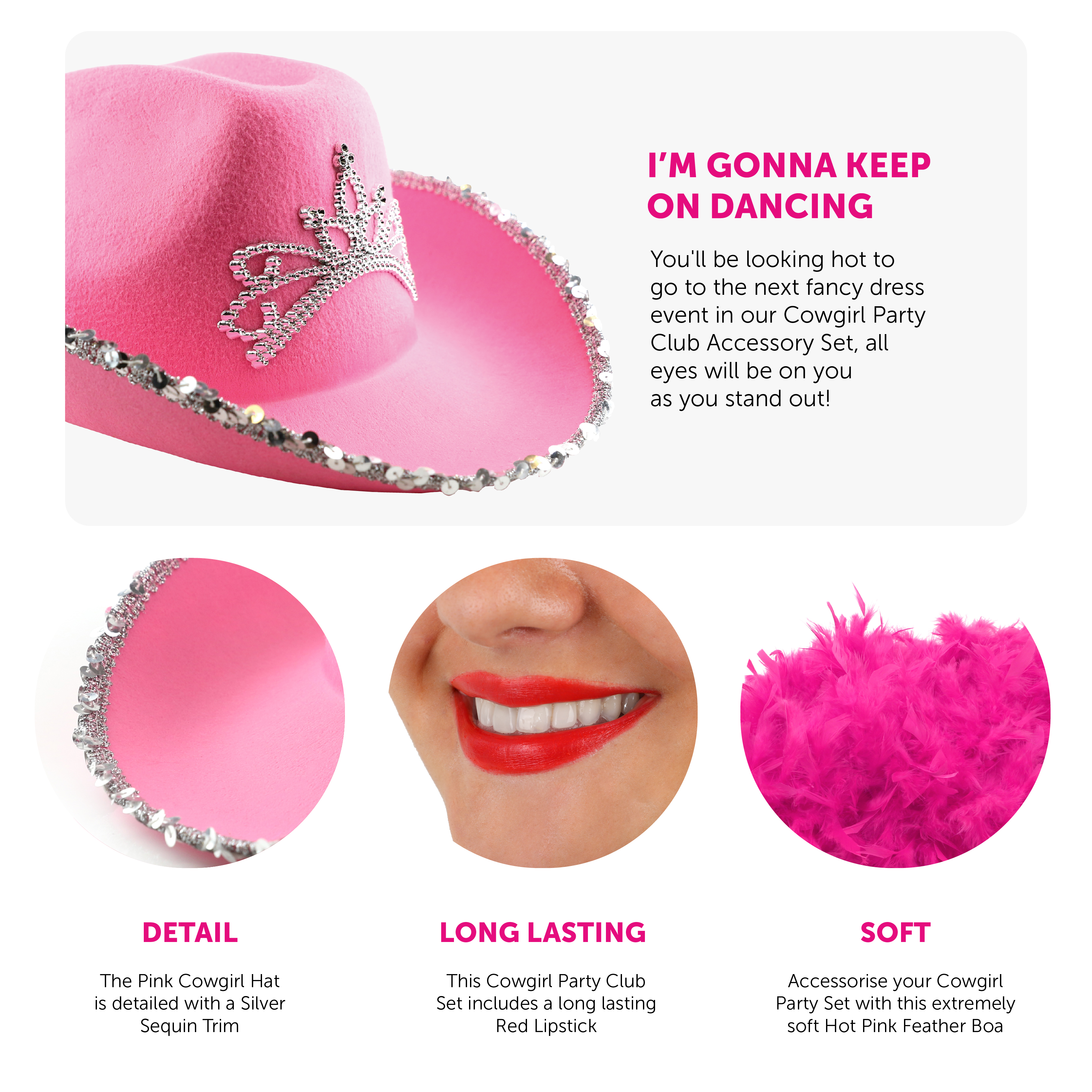 SET INCLUDES: Your Cowgirl Party Club Accessory Set includes a Pink Cowgirl Hat detailed with a Silver Tiara on the front and a Silver Sequin edge, an extremely soft, Hot Pink Feather Boa, a palette of Rainbow Face & Body Paint, and Red Lipstick, the perfect Set for any music themed fancy dress event!