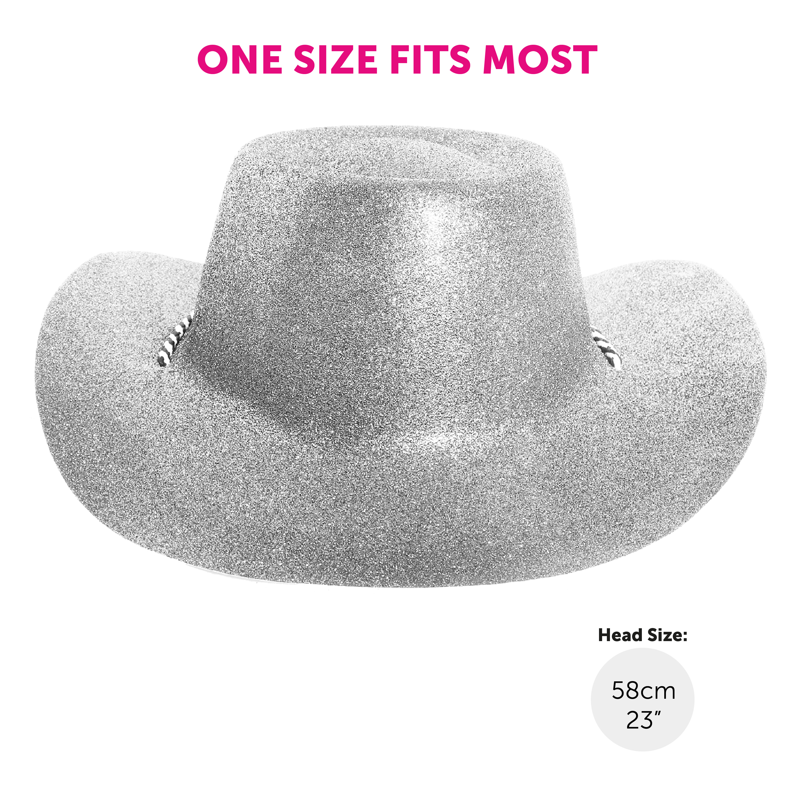 ONE SIZE FITS MOST: Being a very comfortable size for all adults having a very well-rounded size, this Silver Glitter Cowboy Hat is wearable for most if not all adults, measuring in at 58cm (23cm) for head space, this is perfect for all you Cowboys for a fun night!