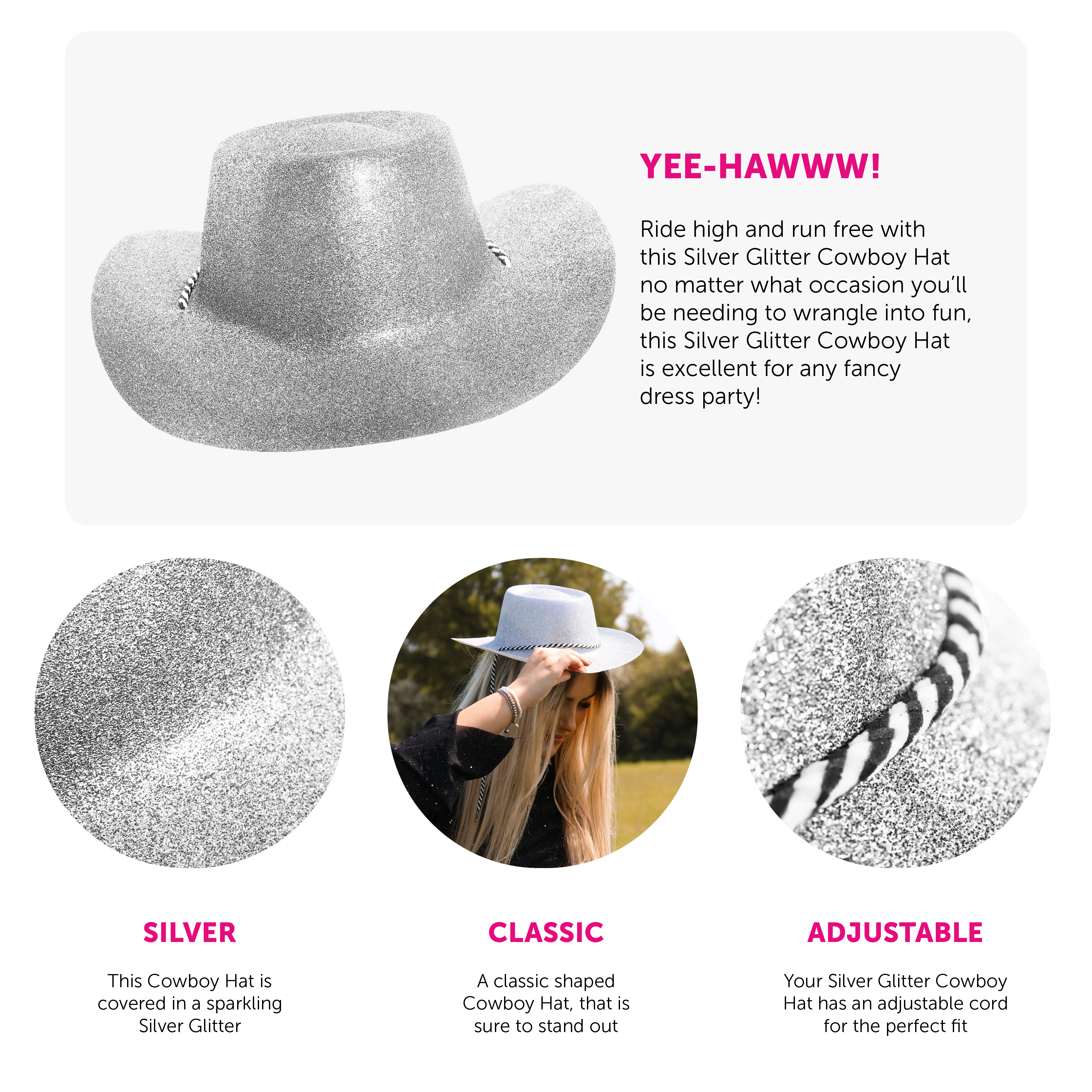 SILVER GLITTER COWBOY HAT: Ride high and run free with this Silver Glitter Cowboy Hat no matter what occasion you’ll be needing to wrangle into fun, this Silver Glitter Cowboy Hat is excellent for any fancy dress party!
