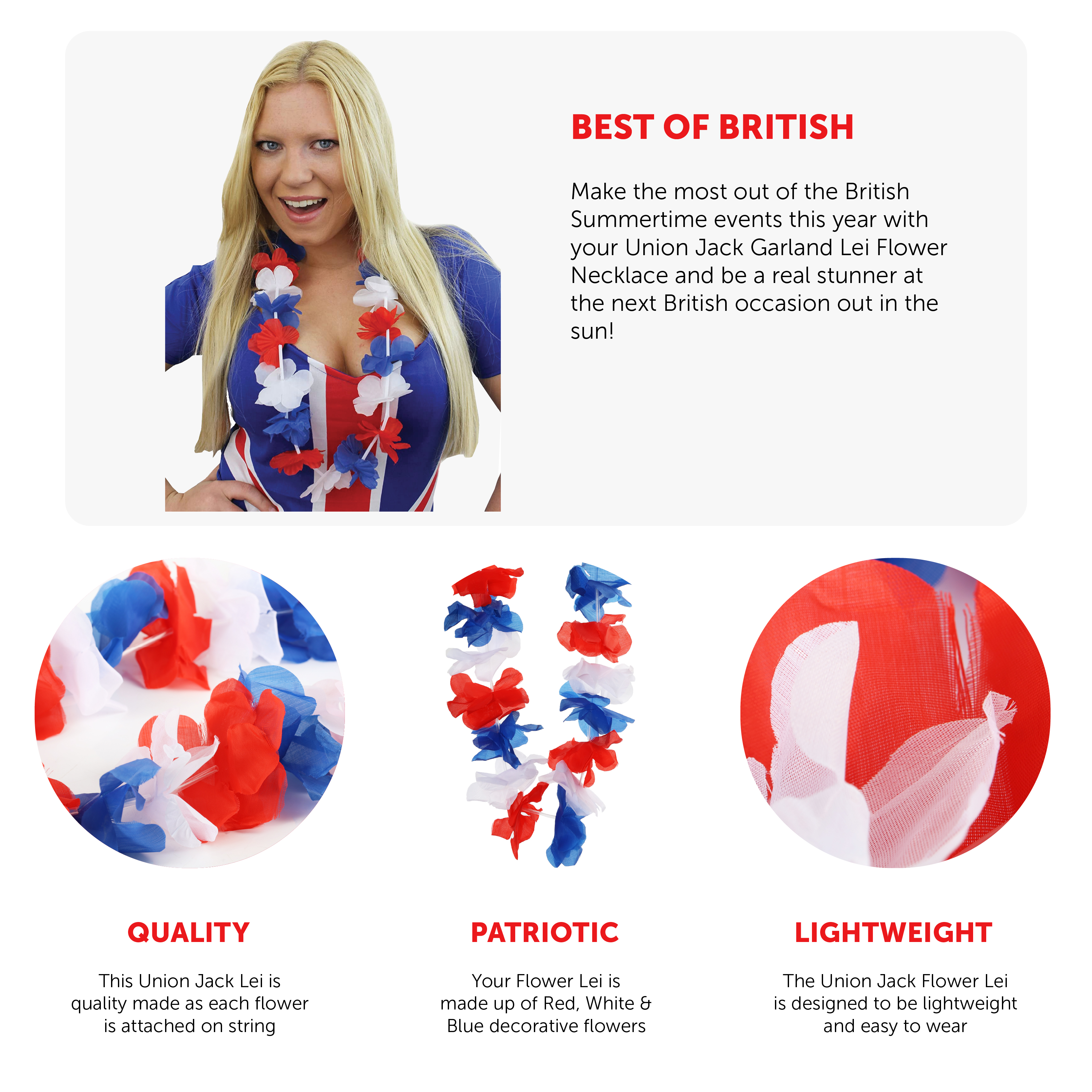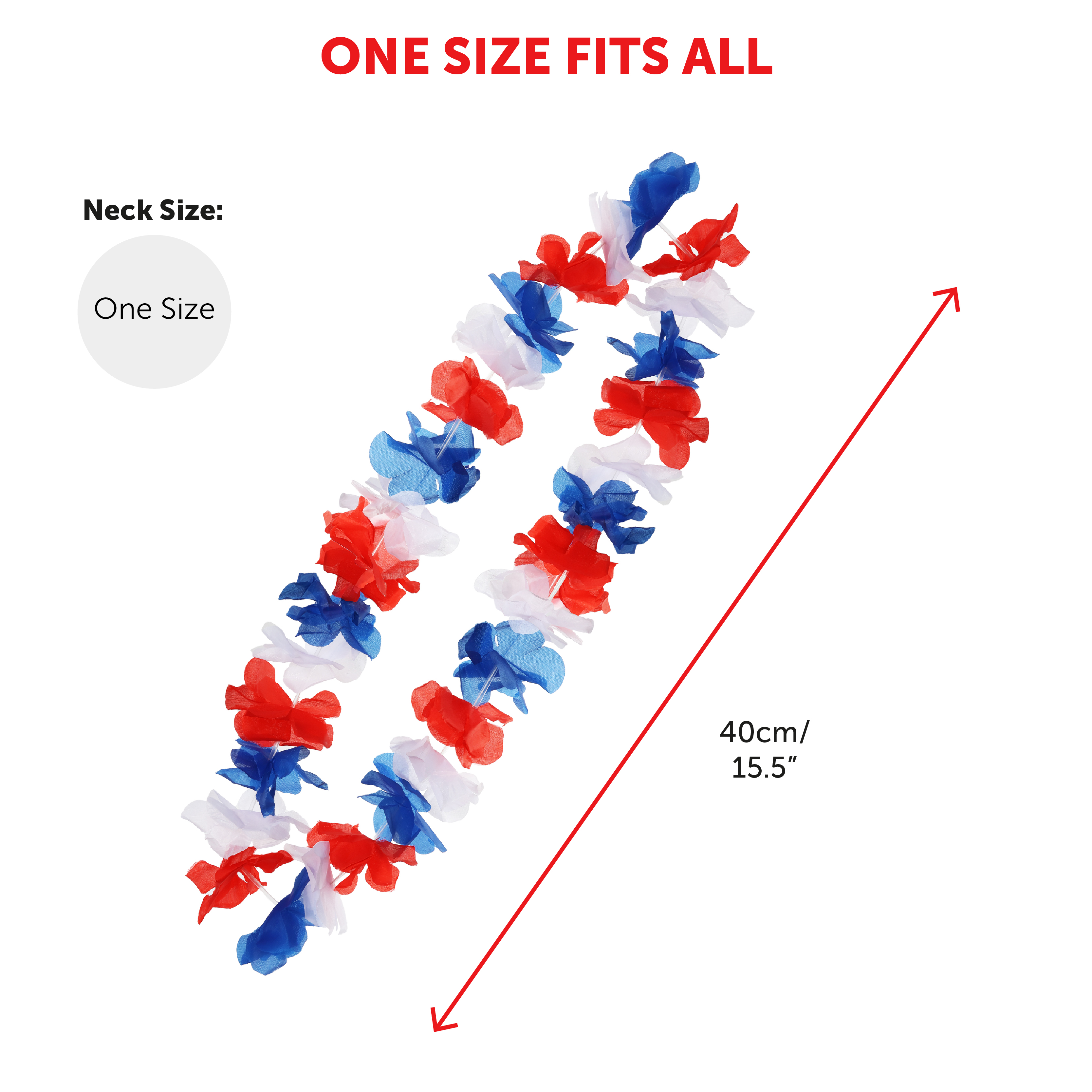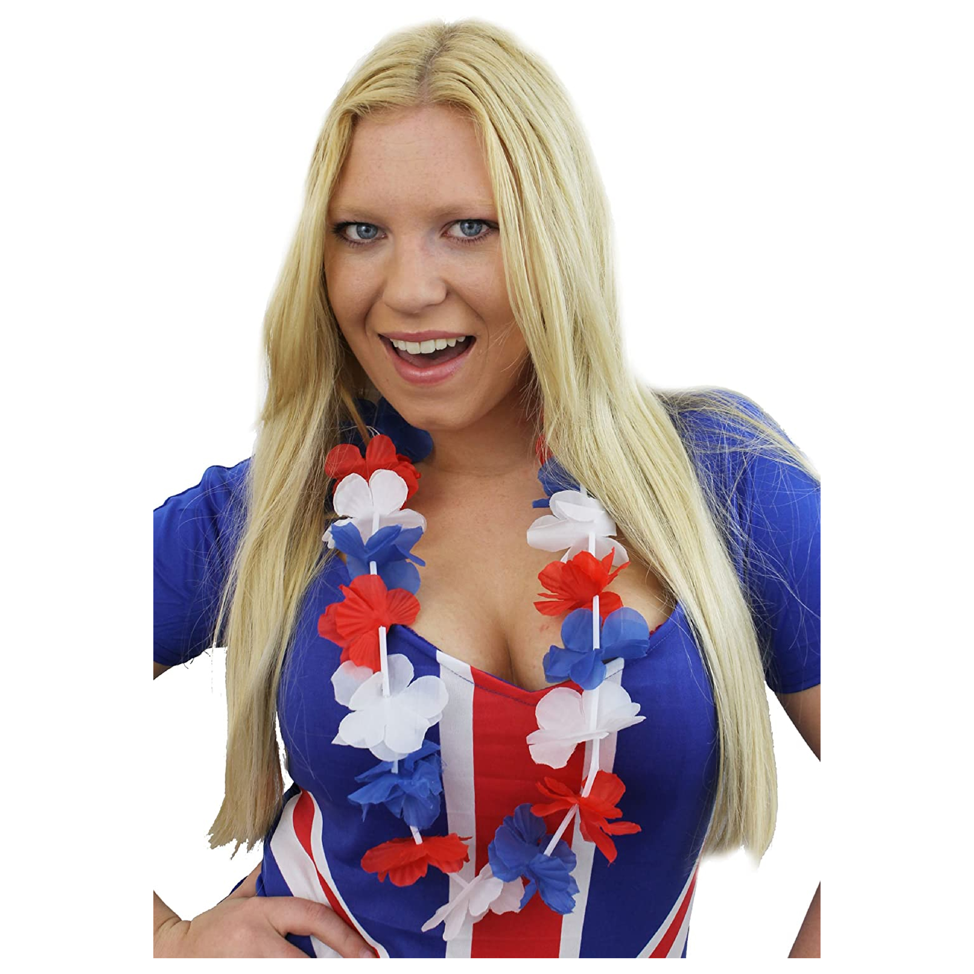 FLOWER LEI DETAILS: This Union Jack Lei Flower Necklace is a 56cm (22") Garland Necklace that is coloured in Red, White and Blue Flower Leis, a soft and comfortable Hawaiian styled Necklace for you to wear comfortably in the sun!