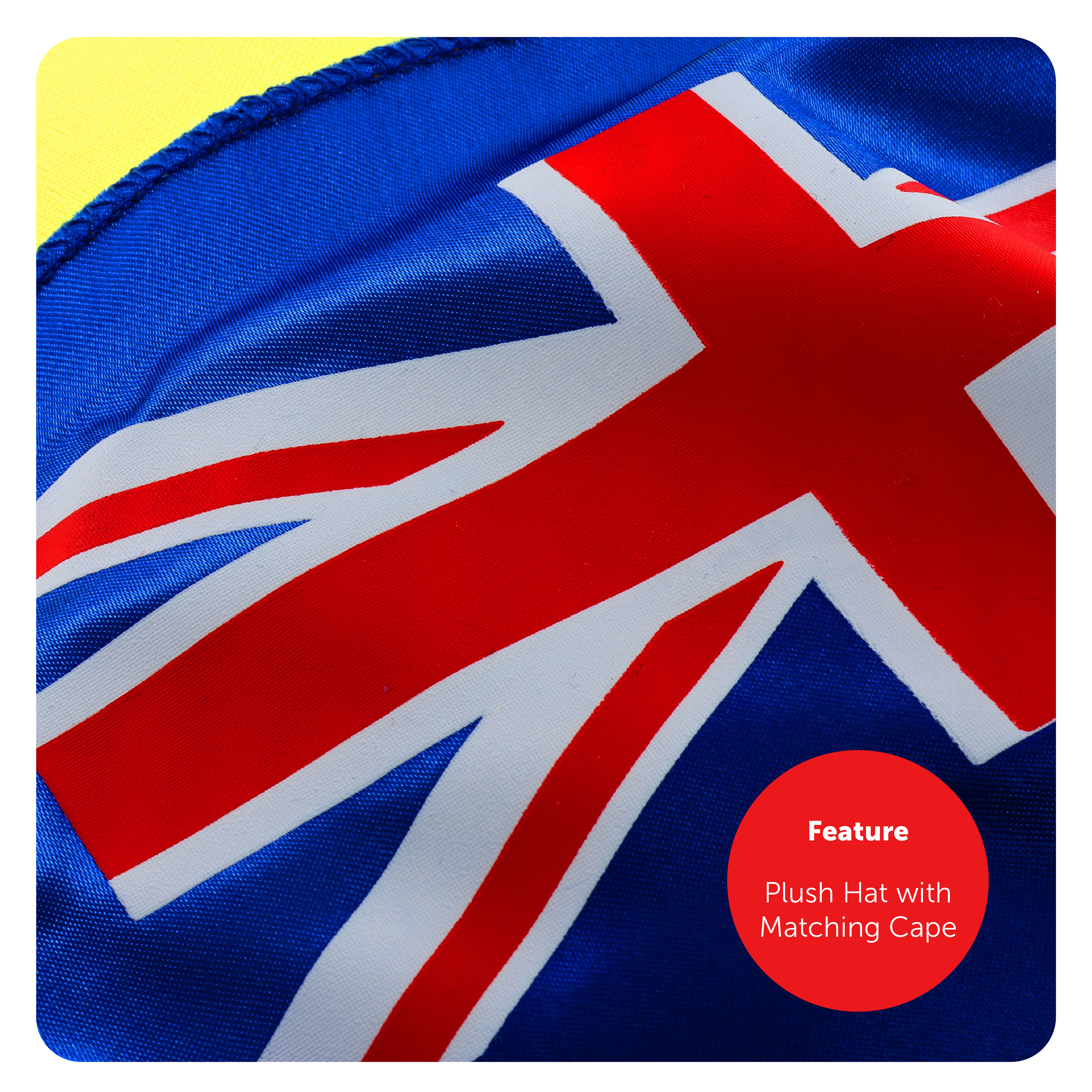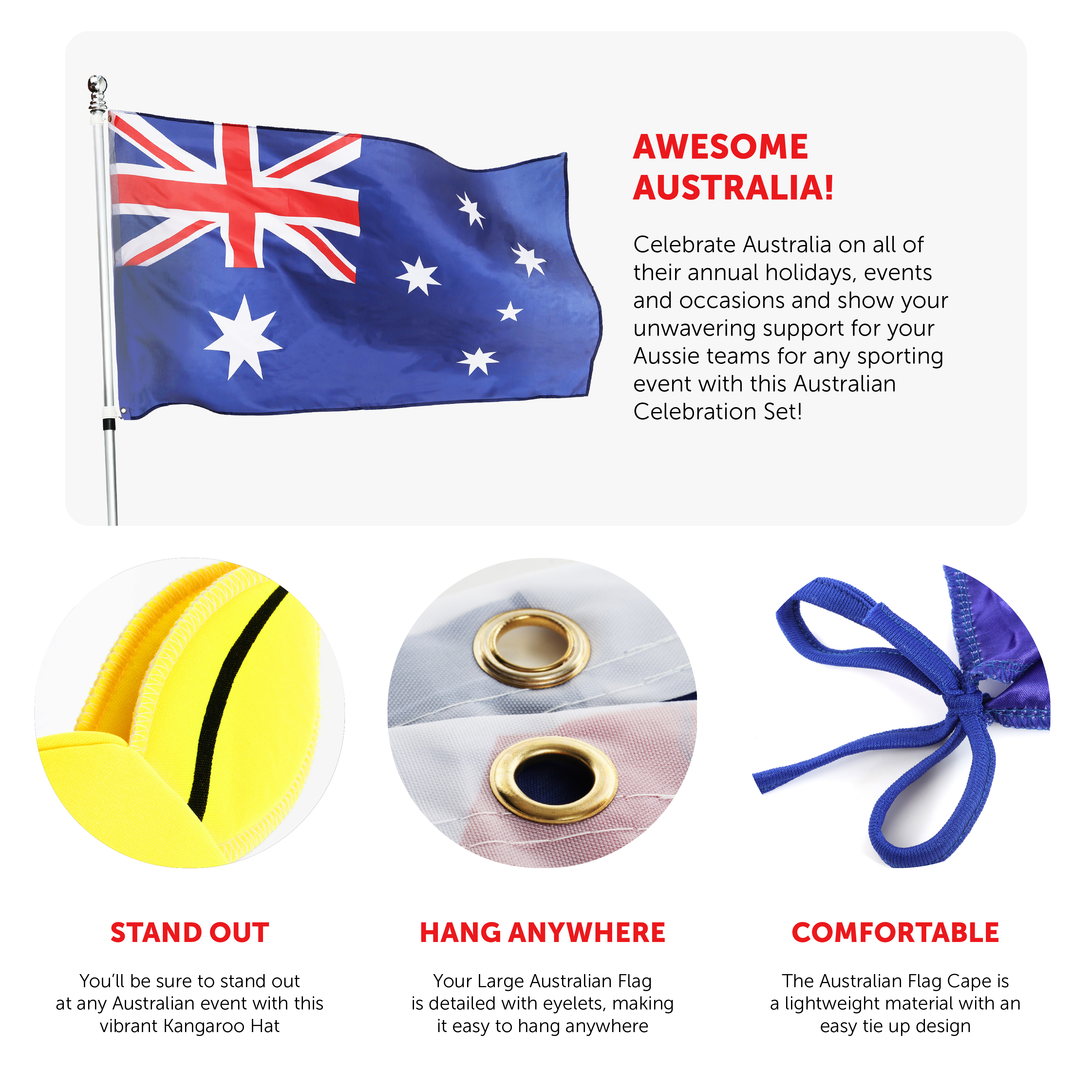 SET INCLUDES: Your Australian Celebration Set includes a 5ft x 3ft Australian Flag with eyelet holes for easy hanging, a Novelty Yellow Plush Kangaroo Hat with a detachable Australian Flag Cape on its back, Australian Flag Bunting, and a Blue, Satin-Feel Australian Flag Cape, with 'AUSTRALIA' printed in Red Letters, and easy to tie up fastening, the perfect set for all Australian events!