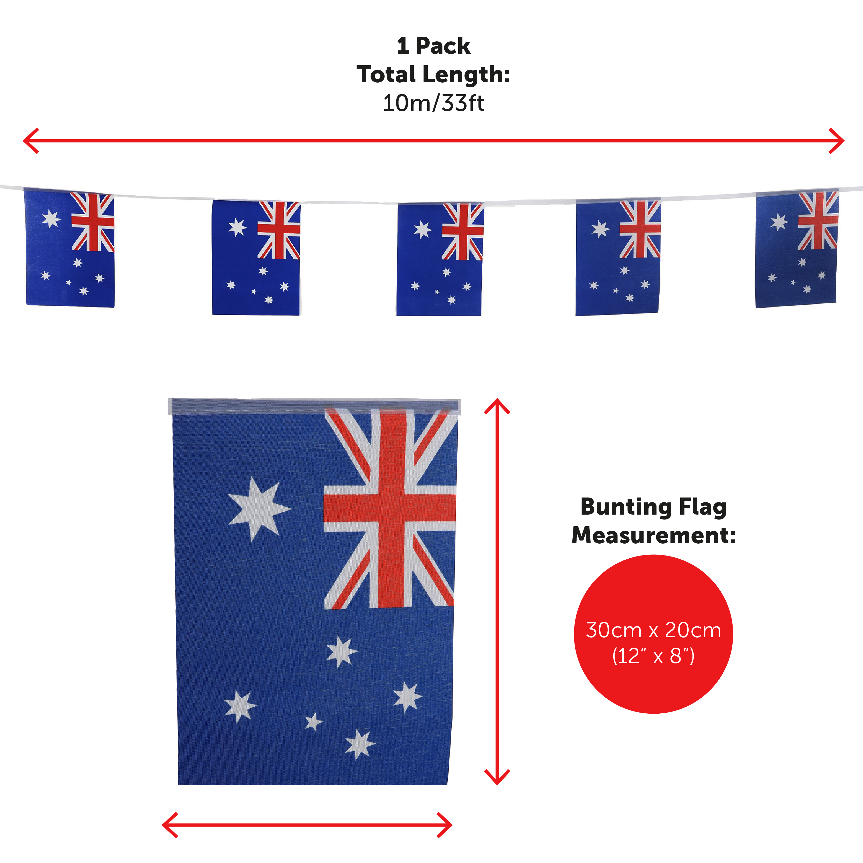 BUNTING & FLAG MEASUREMENTS: Your Australian Flag Bunting measures a full length of 10m/33ft, with individual flags measuring 21cm (8") x 14cm (5") - a great addition to any Australian event! The Australian Flag measures 5ft x 3ft (152cm x 91cm), a large flag suitable for decorating your home indoors and outdoors or for parading around at parties and sporting events!