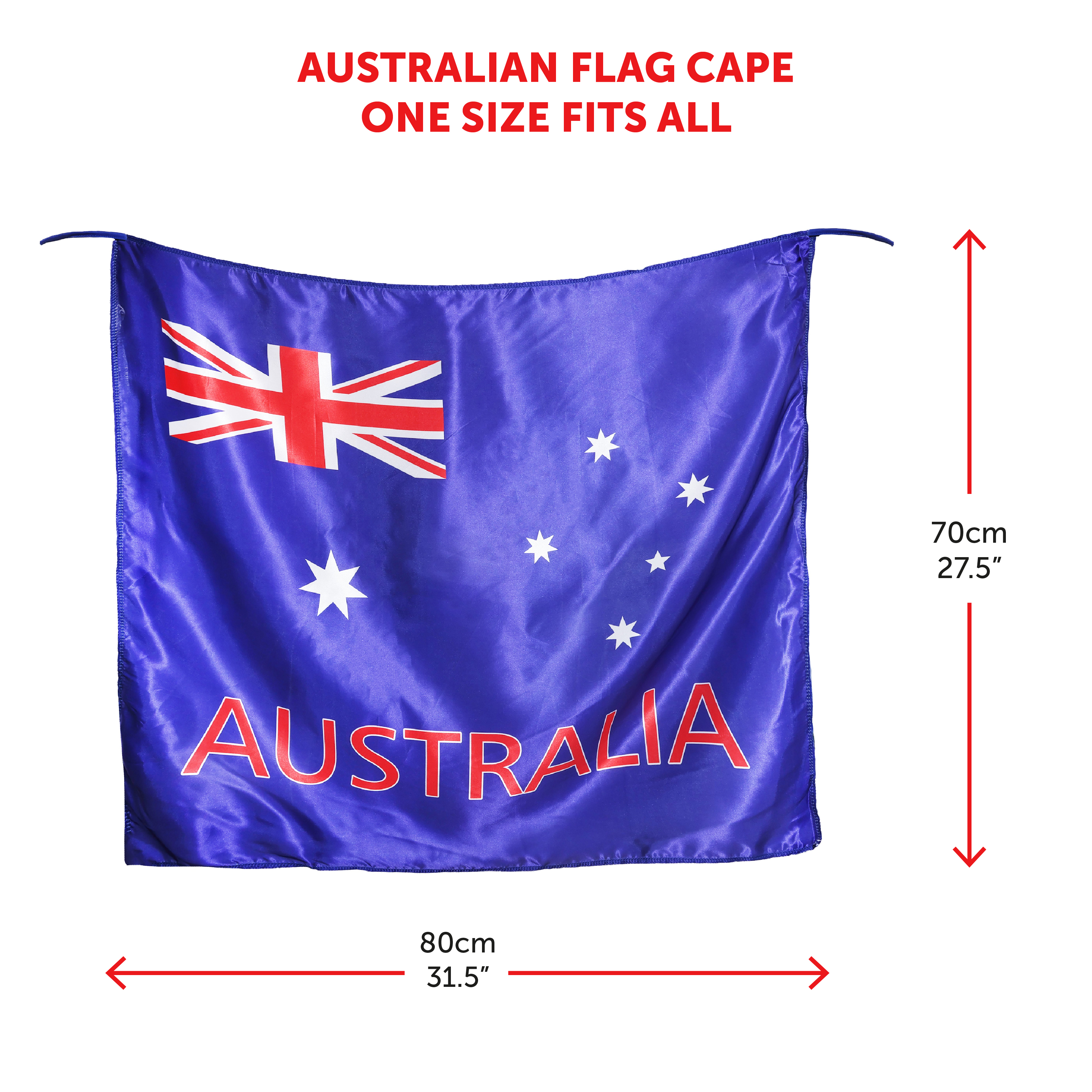 ONE SIZE FITS MOST: The Plush Australian Kangaroo Hat is designed to fit most Adults comfortably! The Australian Flag Cape is suitable for anyone to wear comfortably, with an adjustable tie up design! The Flag Cape measures 80cm x 70cm (31.5" x 27.5"), a size that will make you stand out at any Australian event!