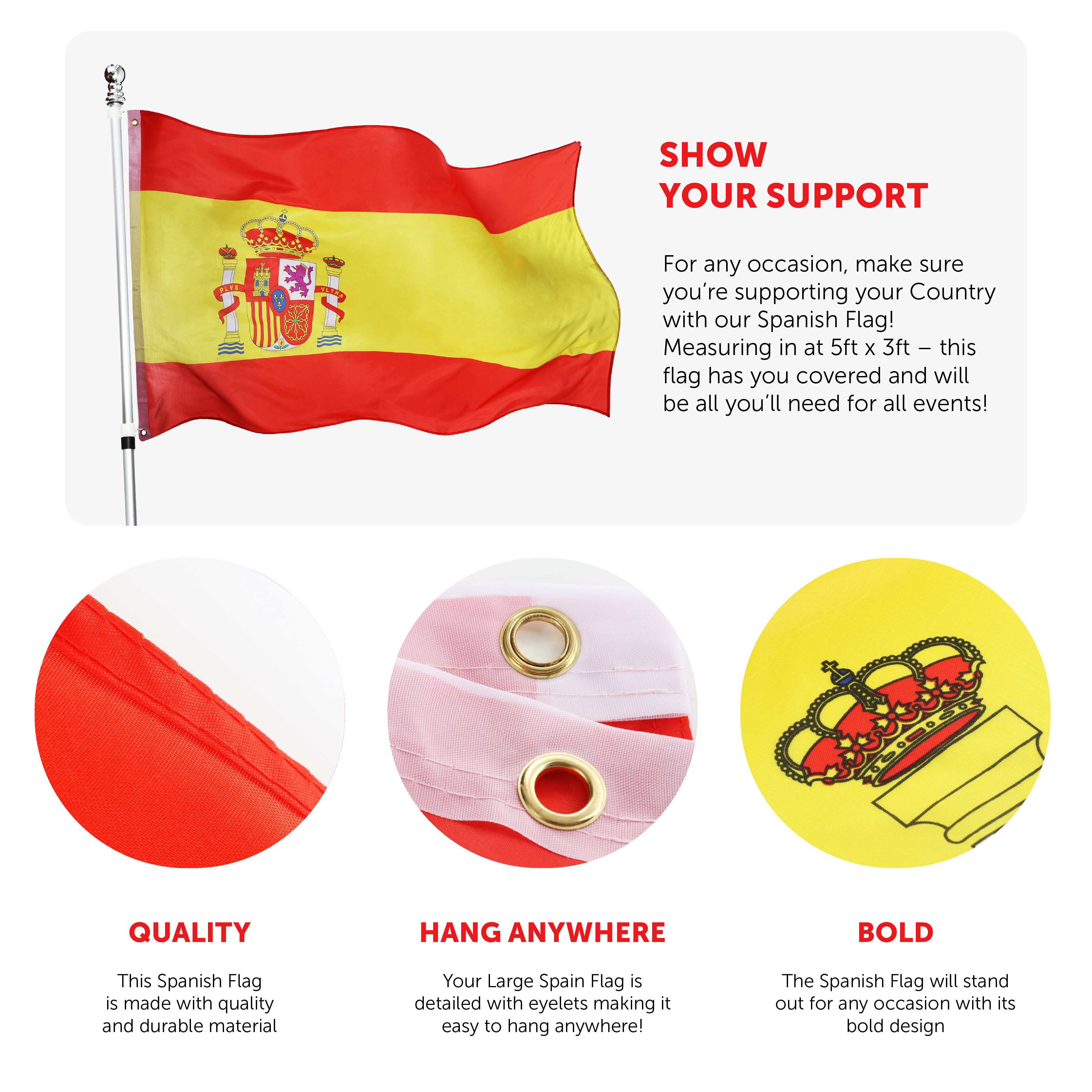 HIGH QUALITY FLAG: This 5ft x 3ft Spanish Flag is perfect for any event, with its durability being perfect for most Weathers, it is extremely easy to dry clean, this Flag is perfect for indoor and outdoor celebrations!