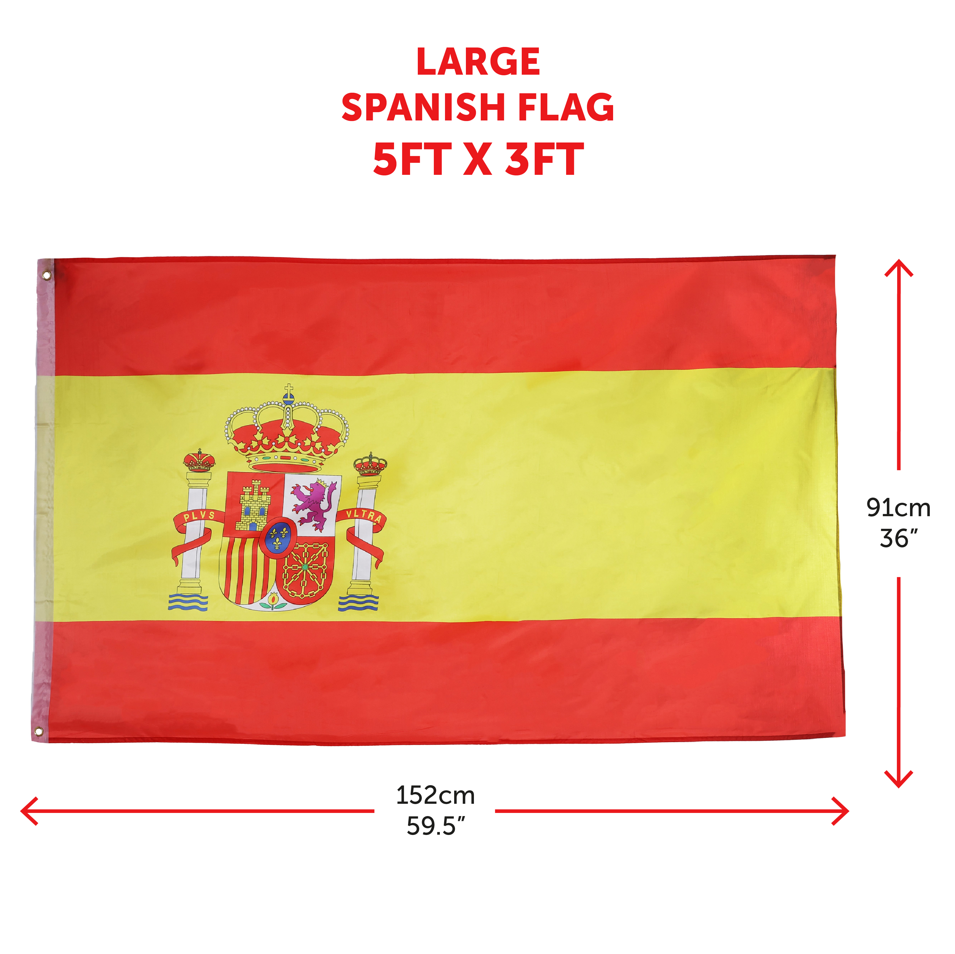 FLAG DETAILS: This Spanish Flag has a vibrant design with three horizontal stripes; Red, Yellow and Red, and a coat of arms off centre to the left, the Flag measures 5ft (152cm/60") in Width and 3ft (91cm/36") in Height, you'll have the perfect flag accessory to fly high for any event!