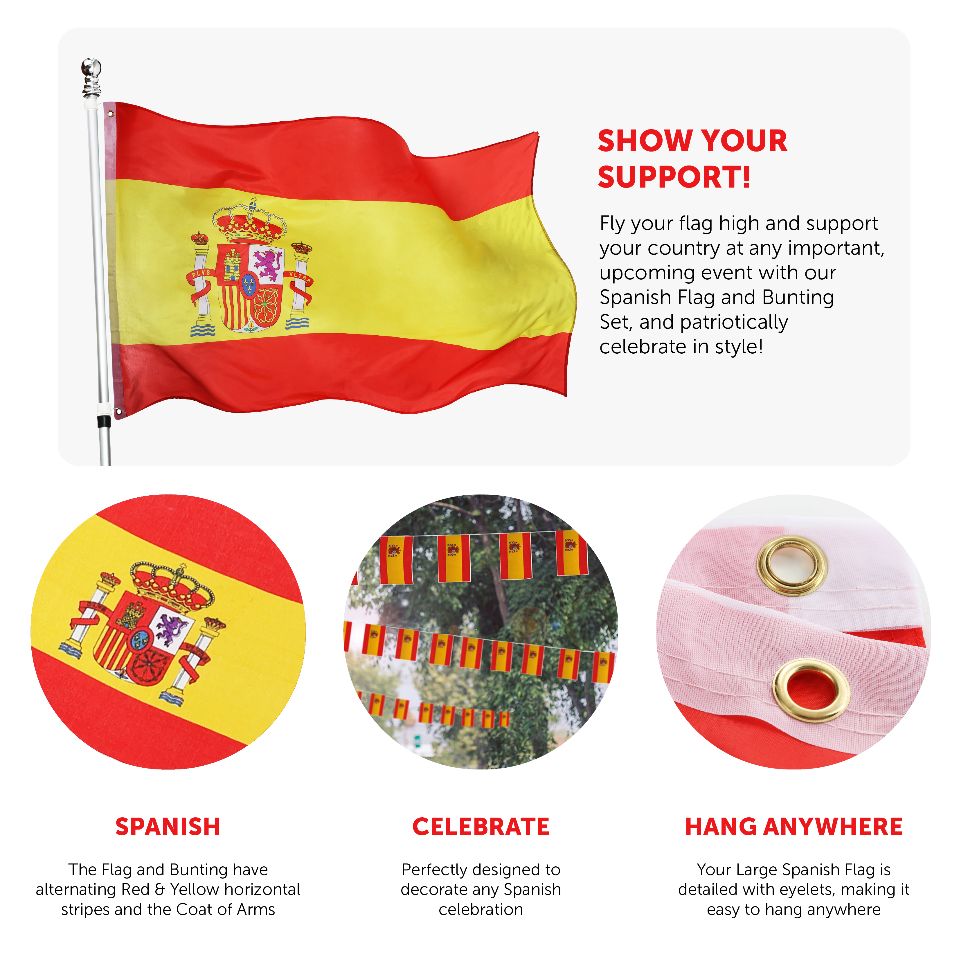 SPANISH FLAG & BUNTING SET: Fly your flag high and support your country at any important, upcoming event with our Spanish Flag and Bunting Set, and patriotically celebrate in style!
