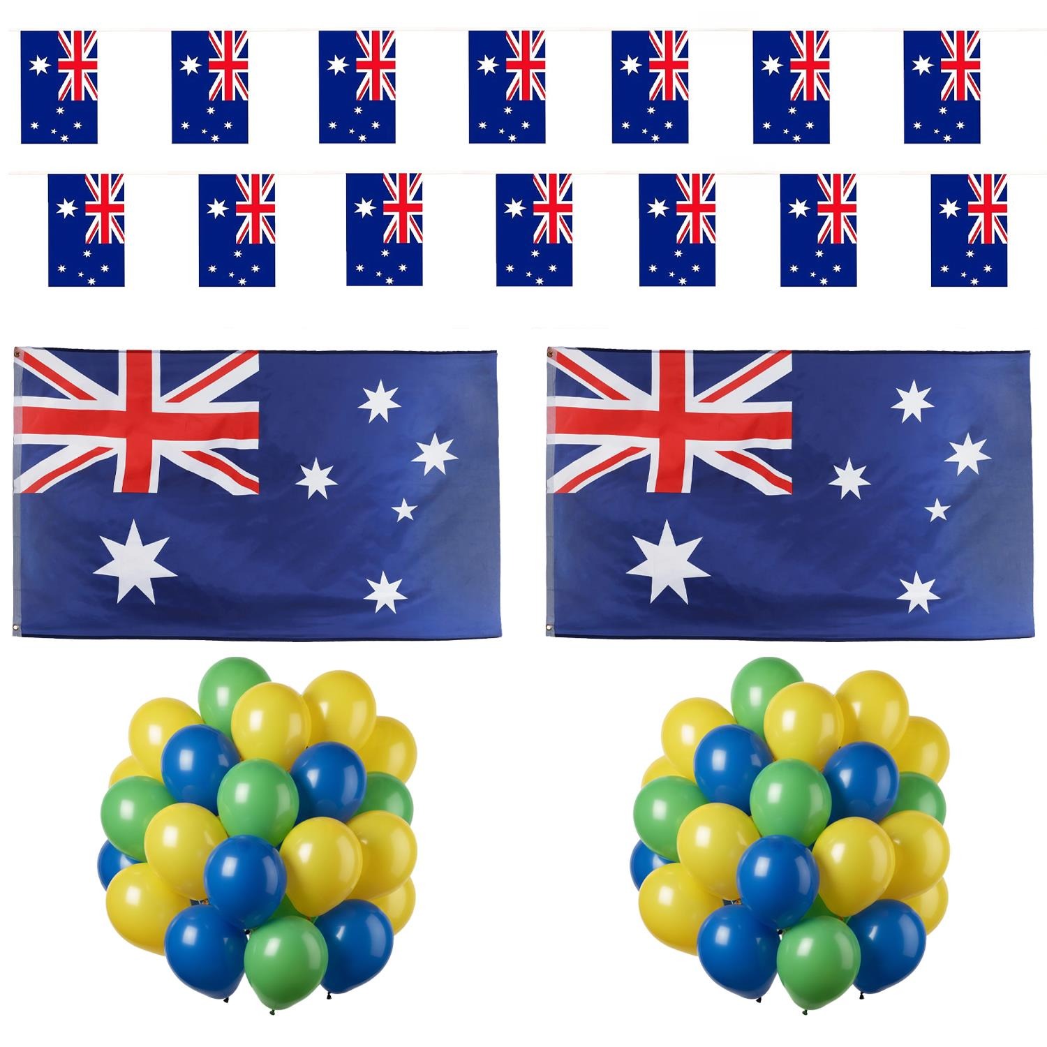 The bundle includes matte royal blue, champagne gold, and evergreen latex balloons for eye-catching displays, along with two lengths of Australia Flag Bunting to decorate walls, fences, windows, and outdoor areas. Completing the set are two large Australian flags, ideal for flying proudly at events or using as bold decorative features.