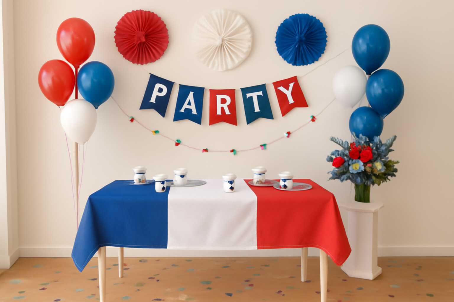 Bring a touch of France to your celebration with this striking French Flag Table Cover, featuring the iconic blue, white, and red vertical stripes of the tricolour. Perfect for national holidays, themed events, or international parties, this versatile cover makes a bold statement of French pride and style.