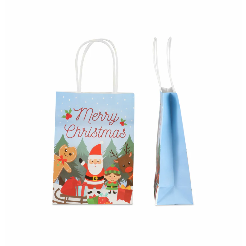 - The Christmas design will put a smile on faces young and old. These paper gift bags are also well suited for end of year classroom activities – why not fill with other Christmas themed stickers, tattoos, maze puzzles, puzzle book and other favours