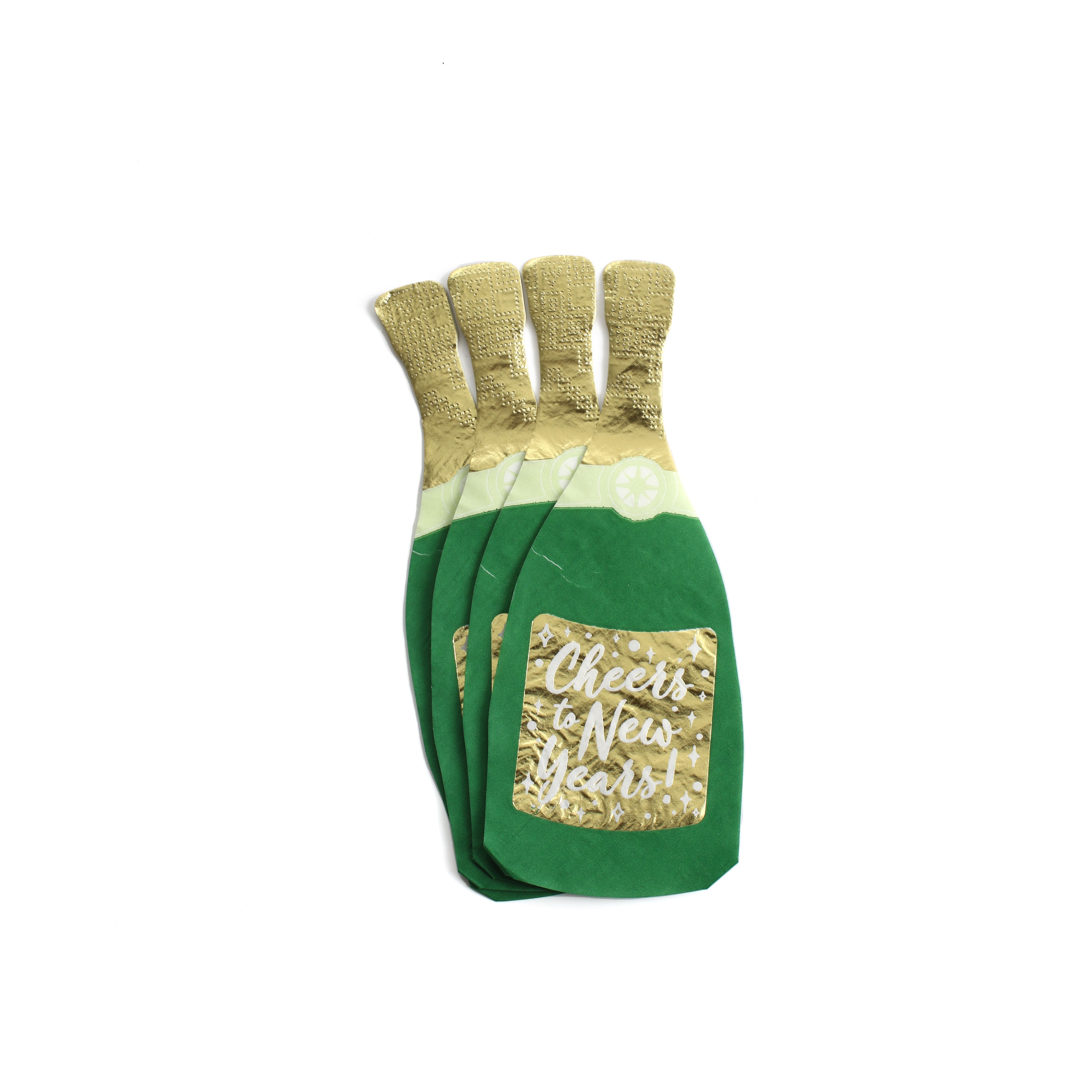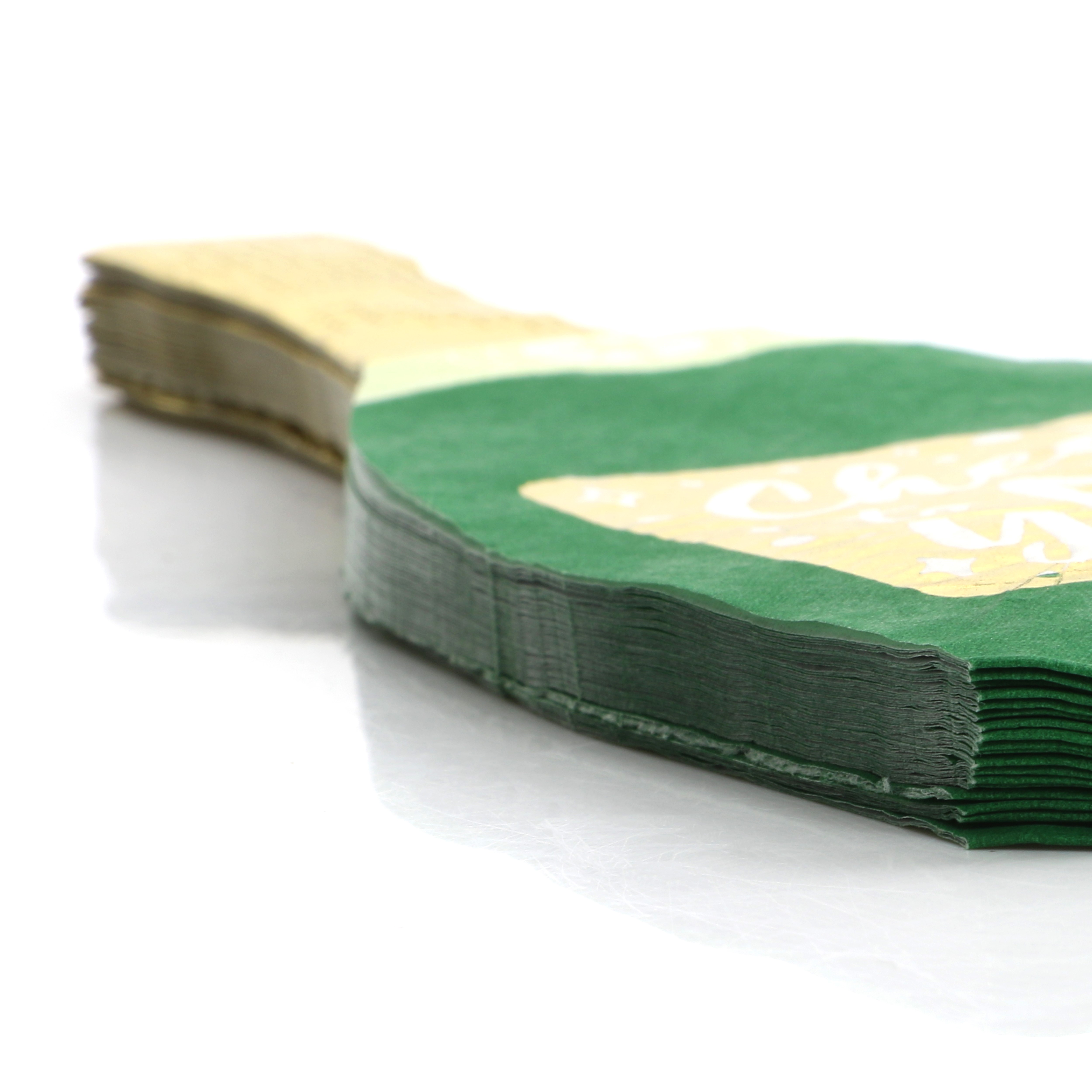 NAPKIN DETAILS: This Pack includes 20x deep Green Champagne Bottle shaped Napkins with Gold detailing and 'Cheers to New Years!' printed on the front, the perfect New Years Party Tableware decoration!