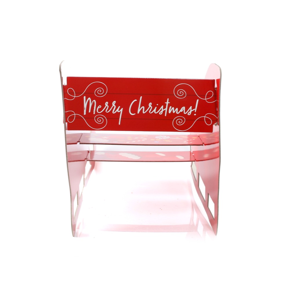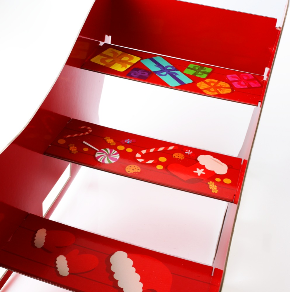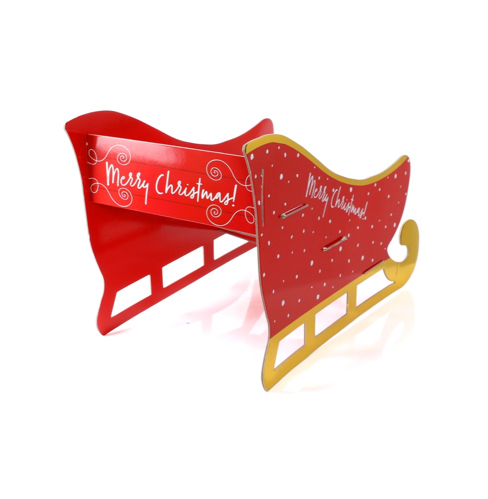 Crafted from thick, durable cardboard with a glossy finish, the stand features a fun Santa sleigh design that’s both sturdy and eye-catching.